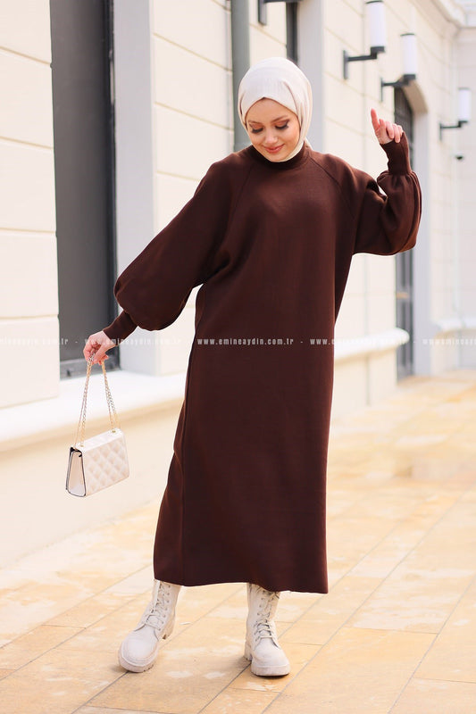 Sare Balon Kol Elbise Kahve