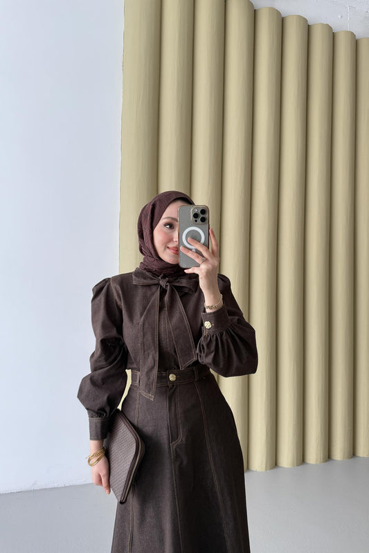 %36 İndirimFularlı Kot Takım Kahverengi