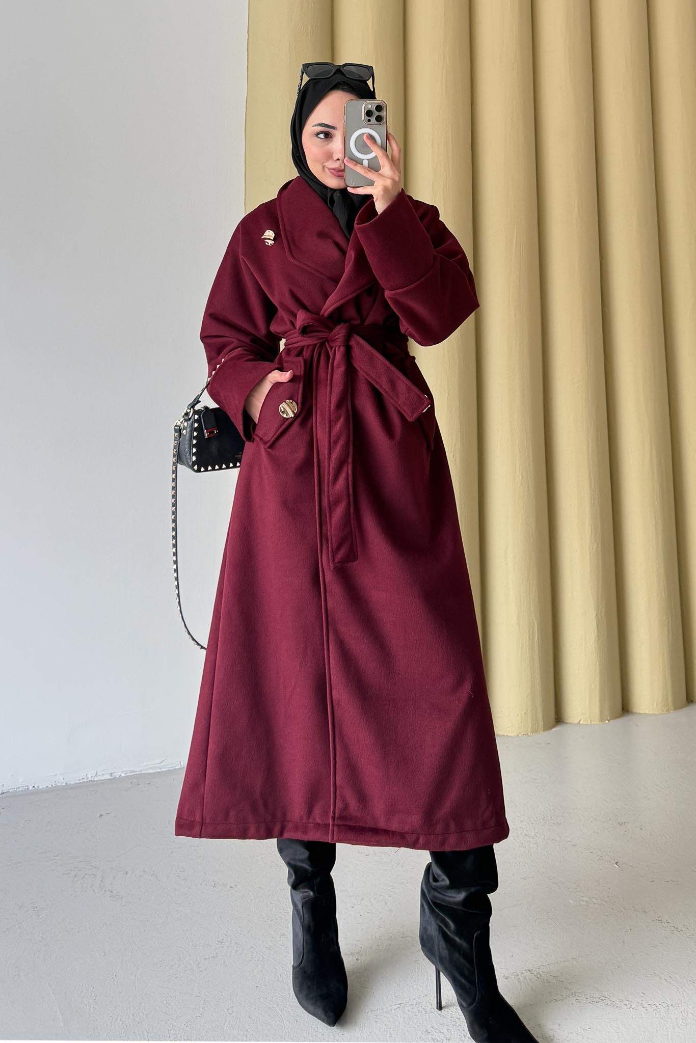 Trench coat length is approximately 118 cm, has 4 buttons, a removable buckle belt, buckled sleeve ends, and is lined.