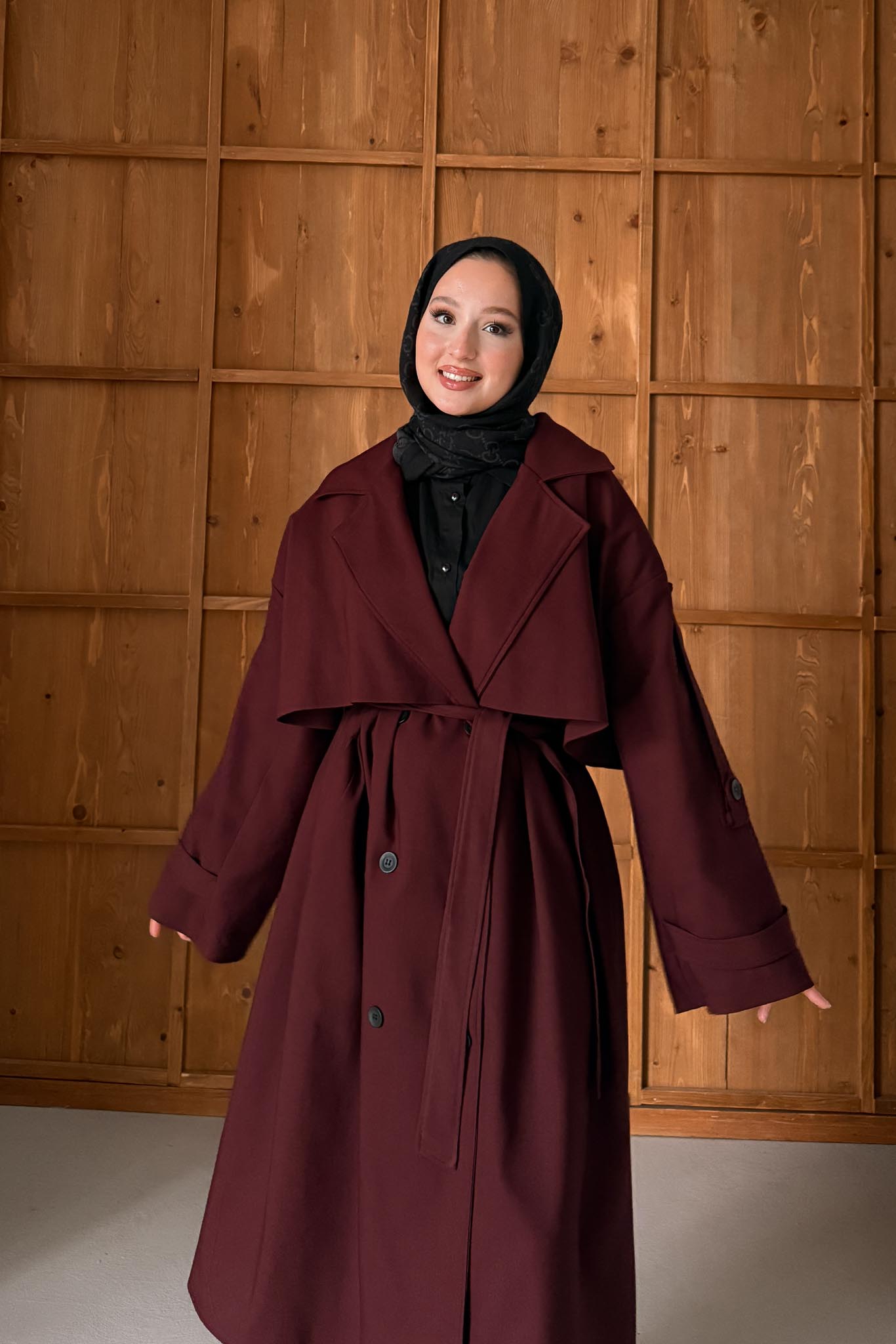 Trench coat length is approximately 118 cm, has 4 buttons, a removable buckle belt, buckled sleeve ends, and is lined.