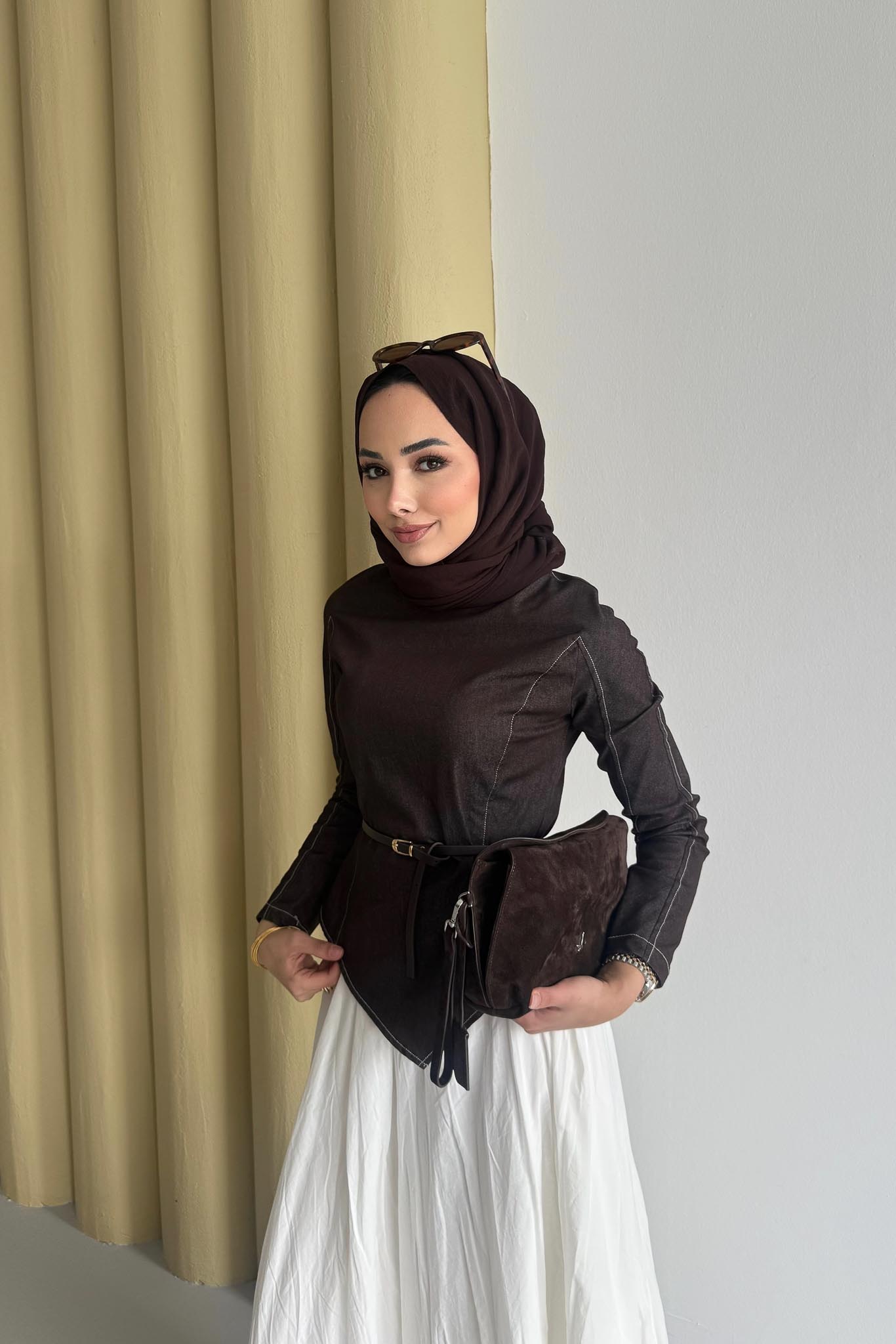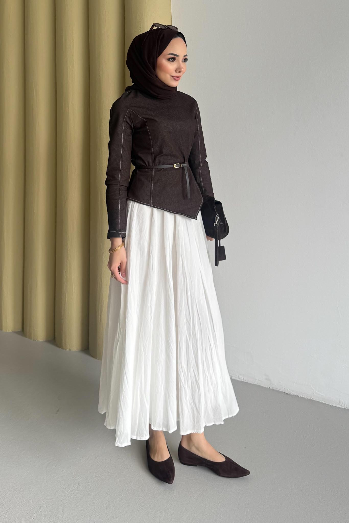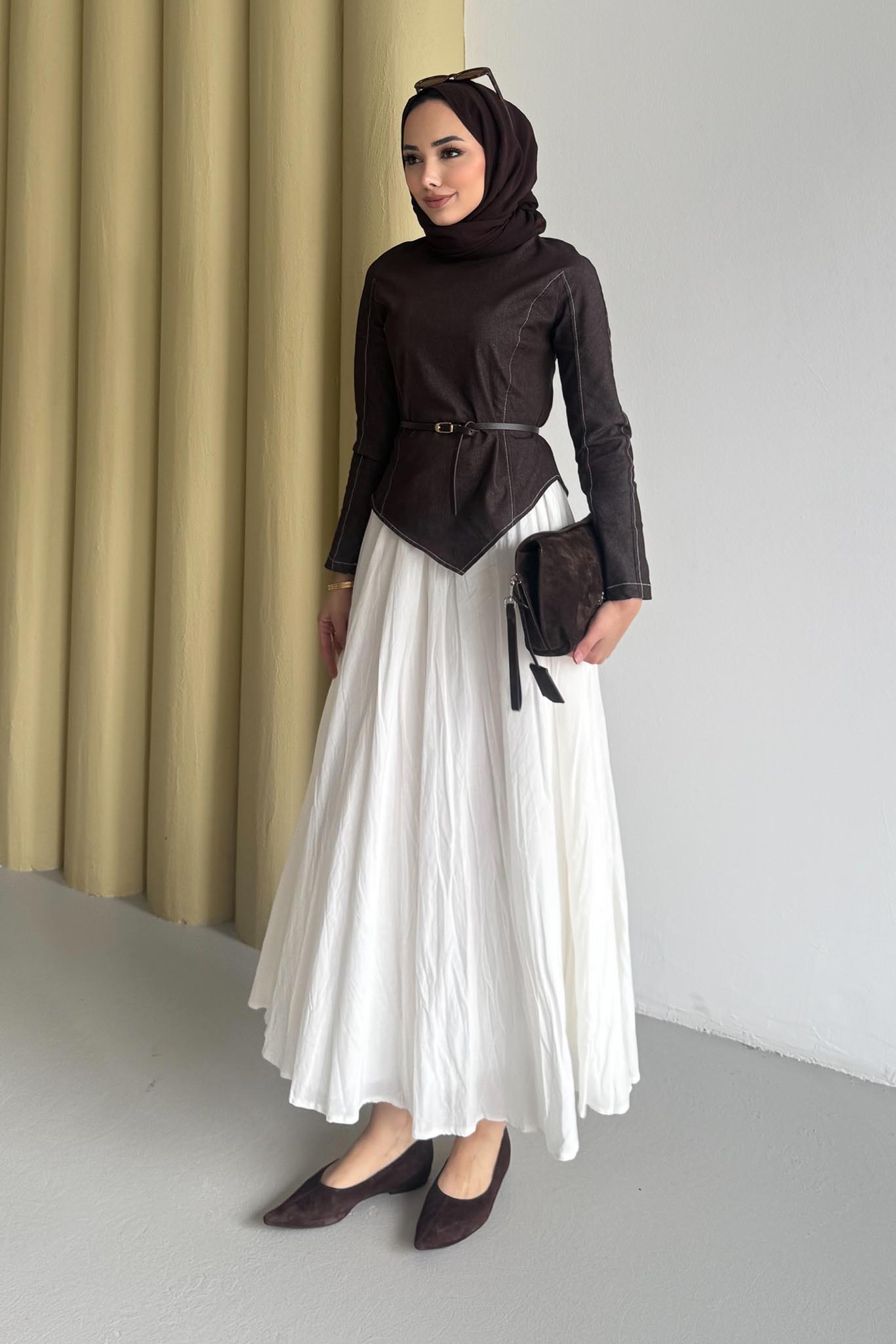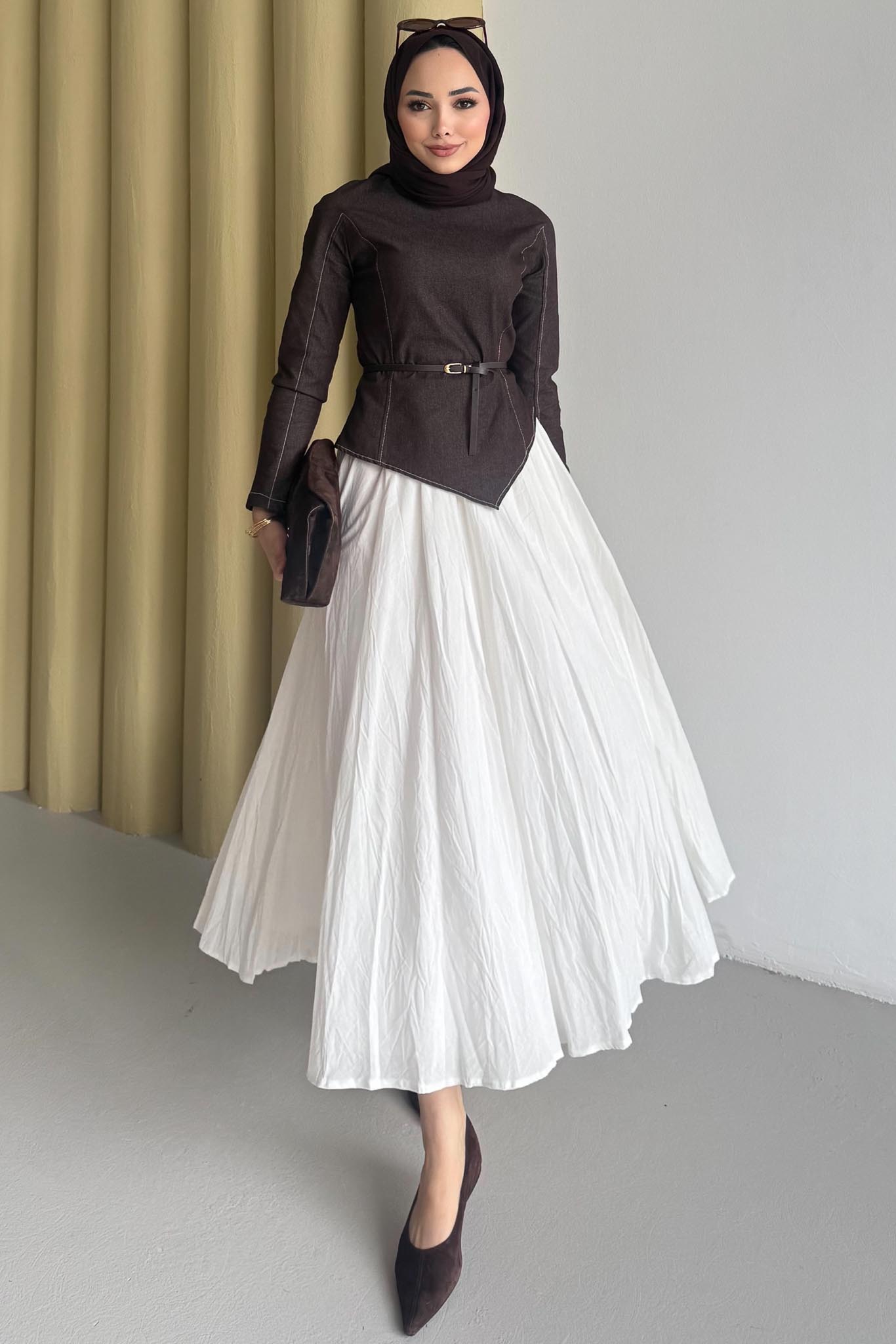 Tunik Asimetriktir, Rahat Formdadır, Kemerlidir, Etek Crashtır beli fermuarlıdır kloş formdadır.