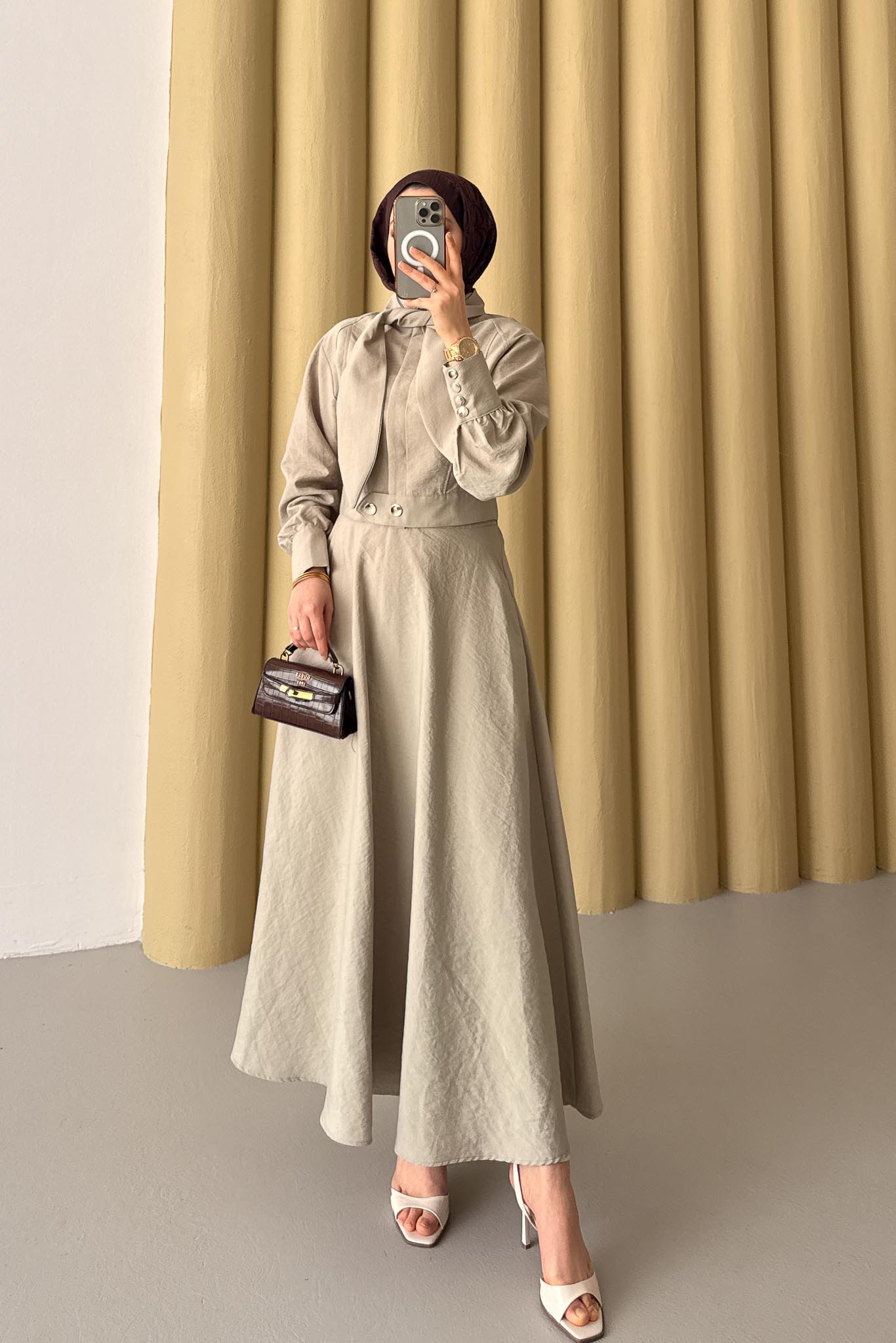 Harika bir dokusu ve duruşu vardır, tunik ortalama 46 cm dir, Etek Kloş formdadır ve 96 cm dir.