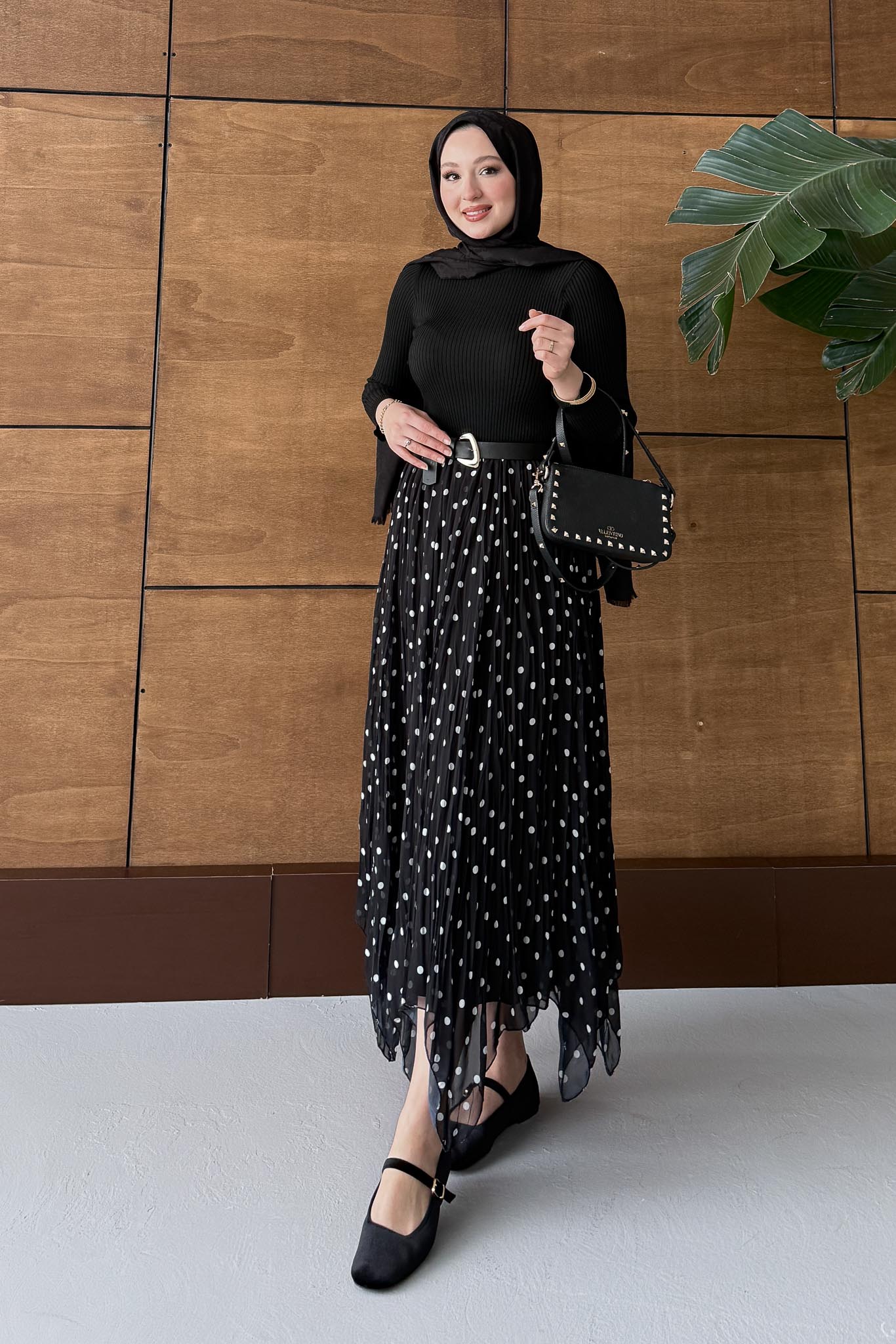 Etek Uzunluk : 96 cm, Beli lastiklidir, Plisole Kloş formdadır.