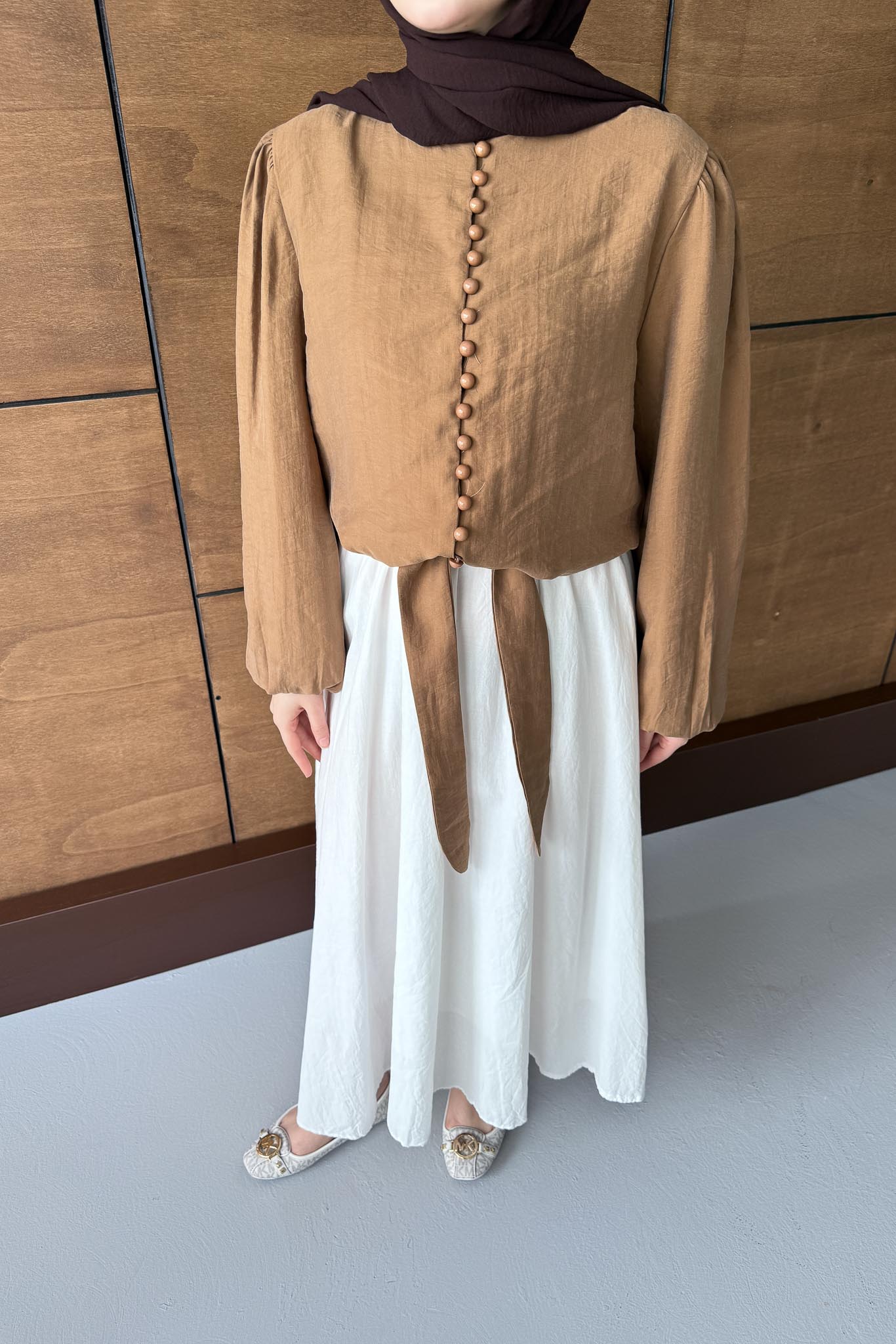 Boydan düğmelidir, şık duruşludur, alt kısmı kurdele detaylıdır.