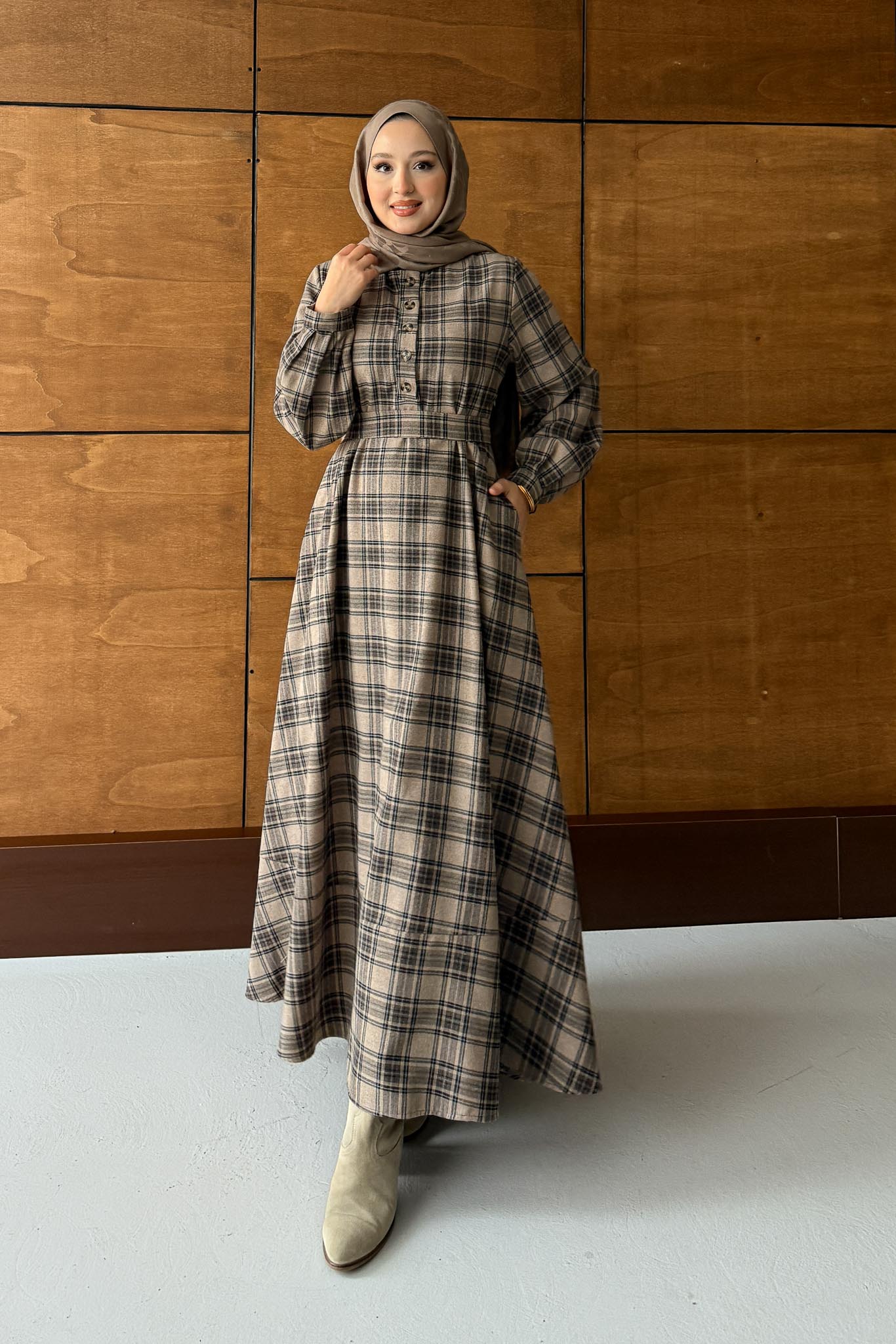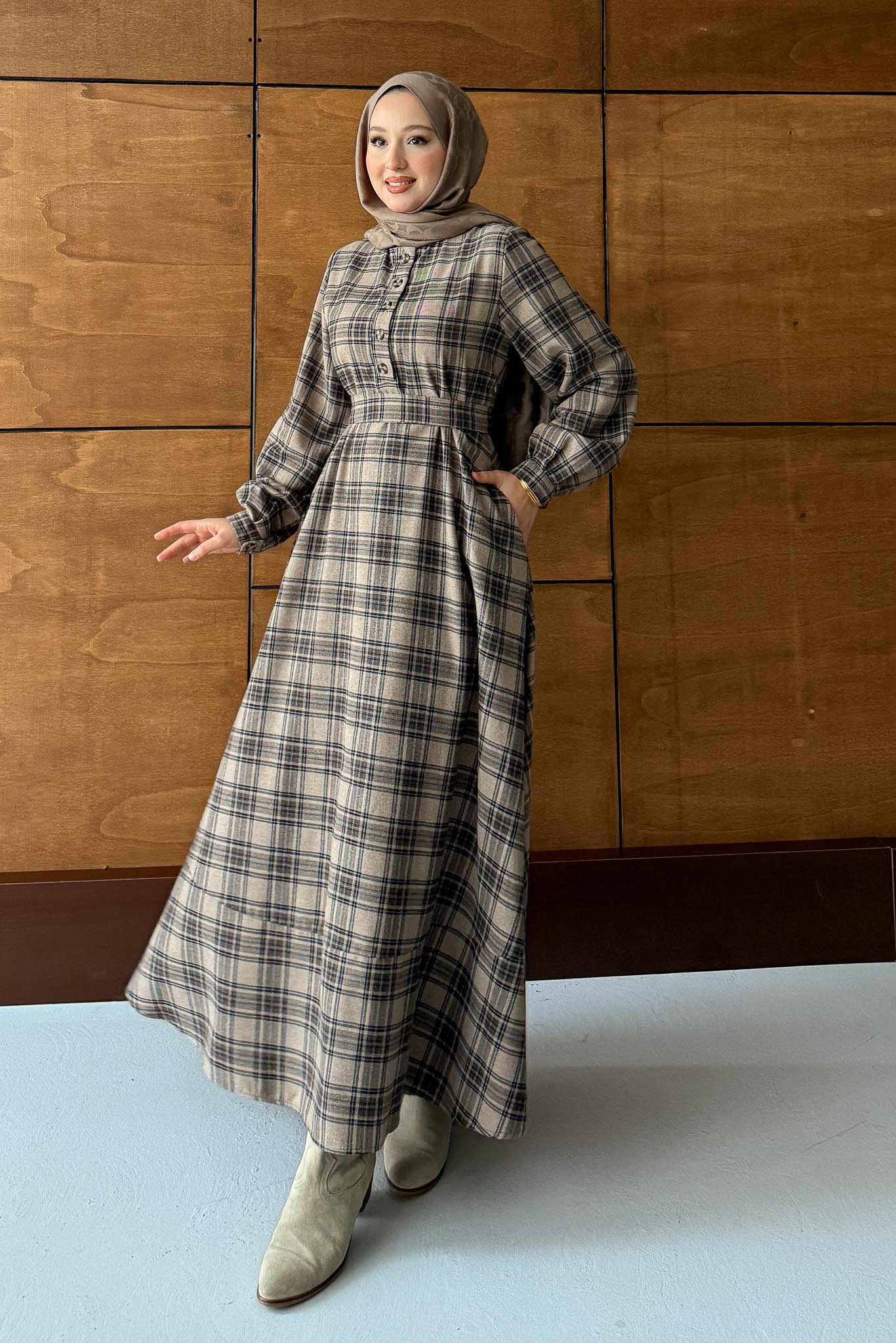 Elbise Boy Ortalama; 135 cm, Yarım Düğmeli, Yandan Fermuarlı, Seyyar kuşaklı.