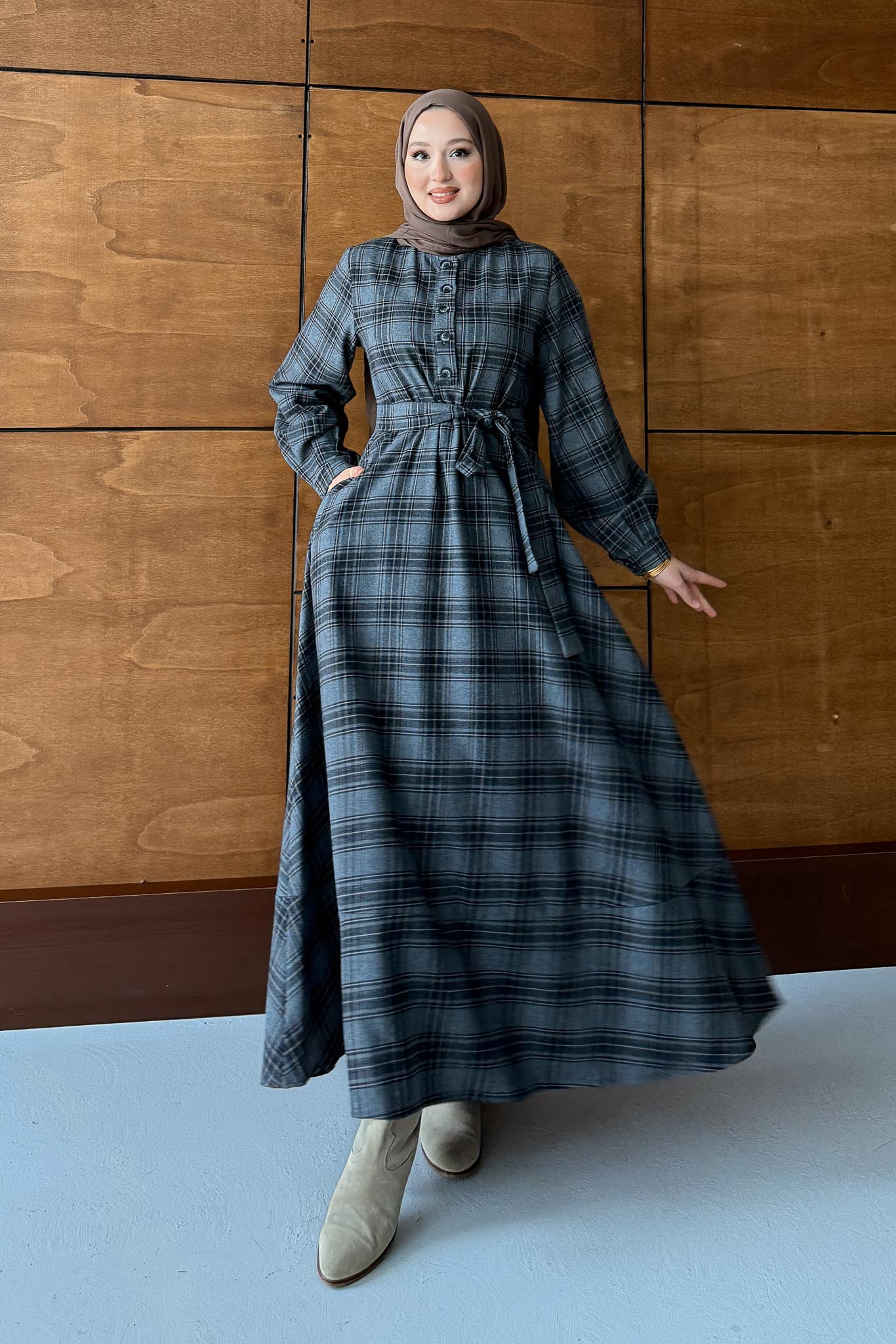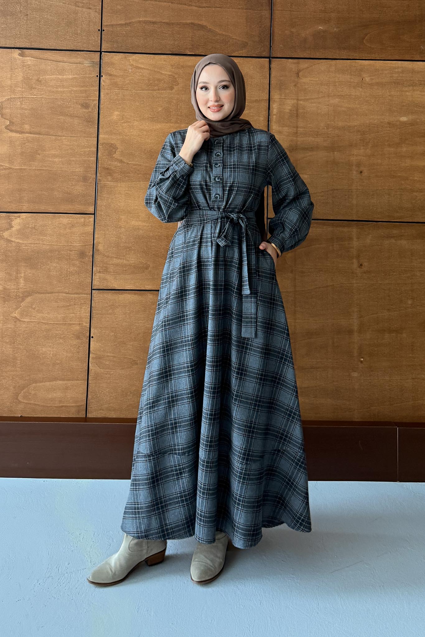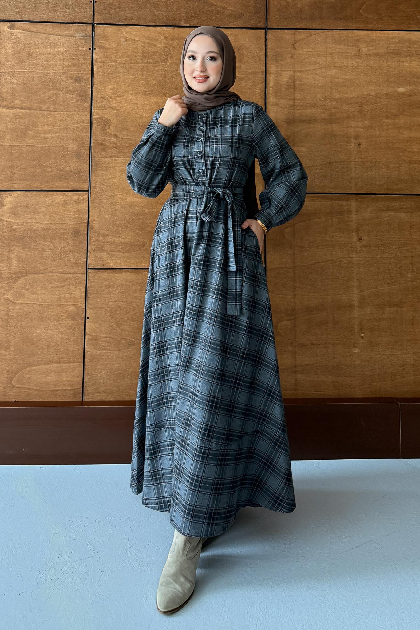 Elbise Boy Ortalama; 135 cm, Yarım Düğmeli, Yandan Fermuarlı, Seyyar kuşaklı.