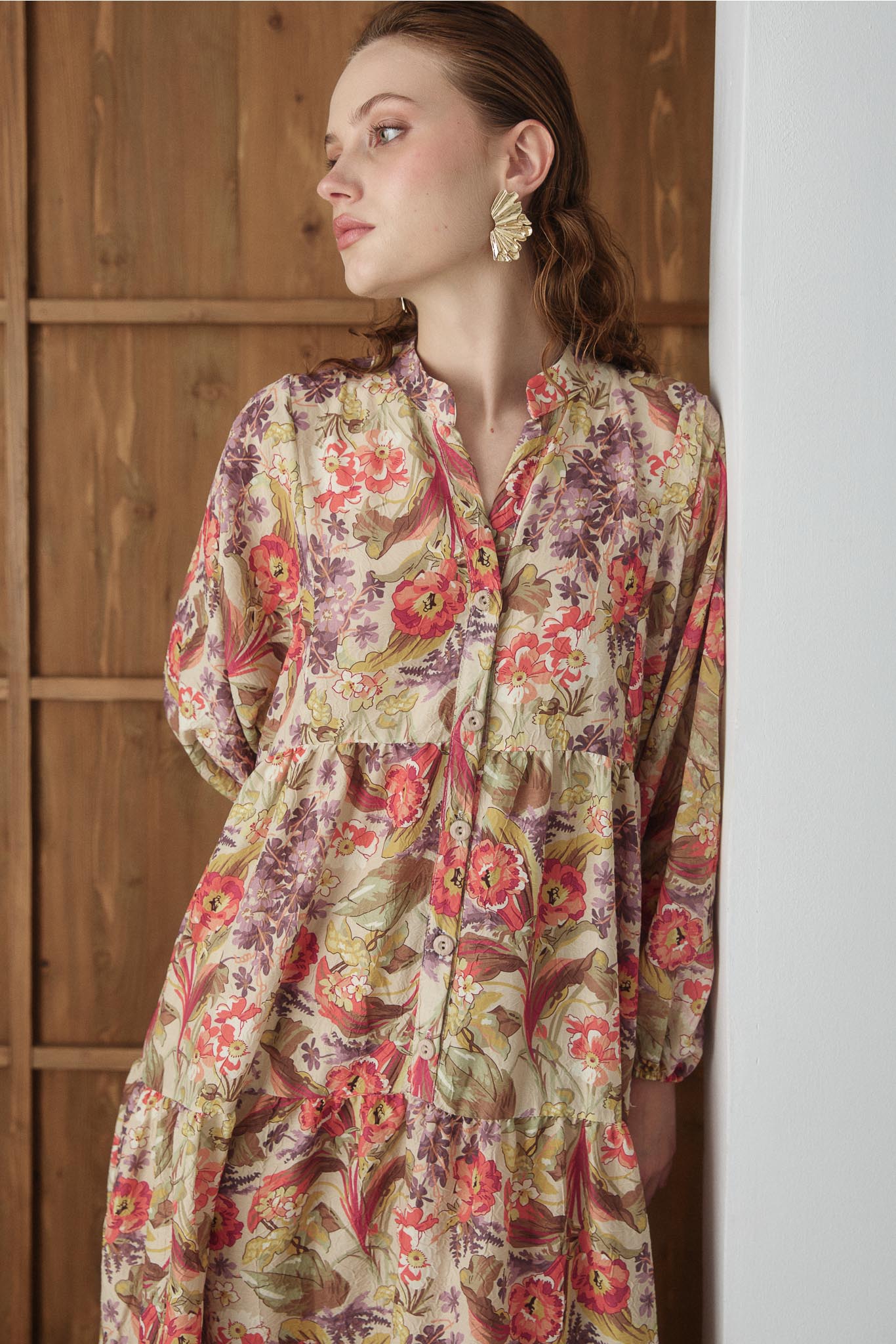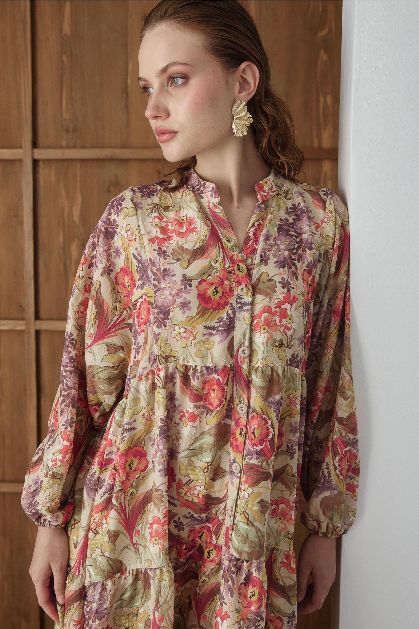 Ön kısımda yarım düğmelidir, oldukça rahat kalıptadır, efil efil kumaşlıdır, balon kolludur. terletmez ve ütü gerektirmez.