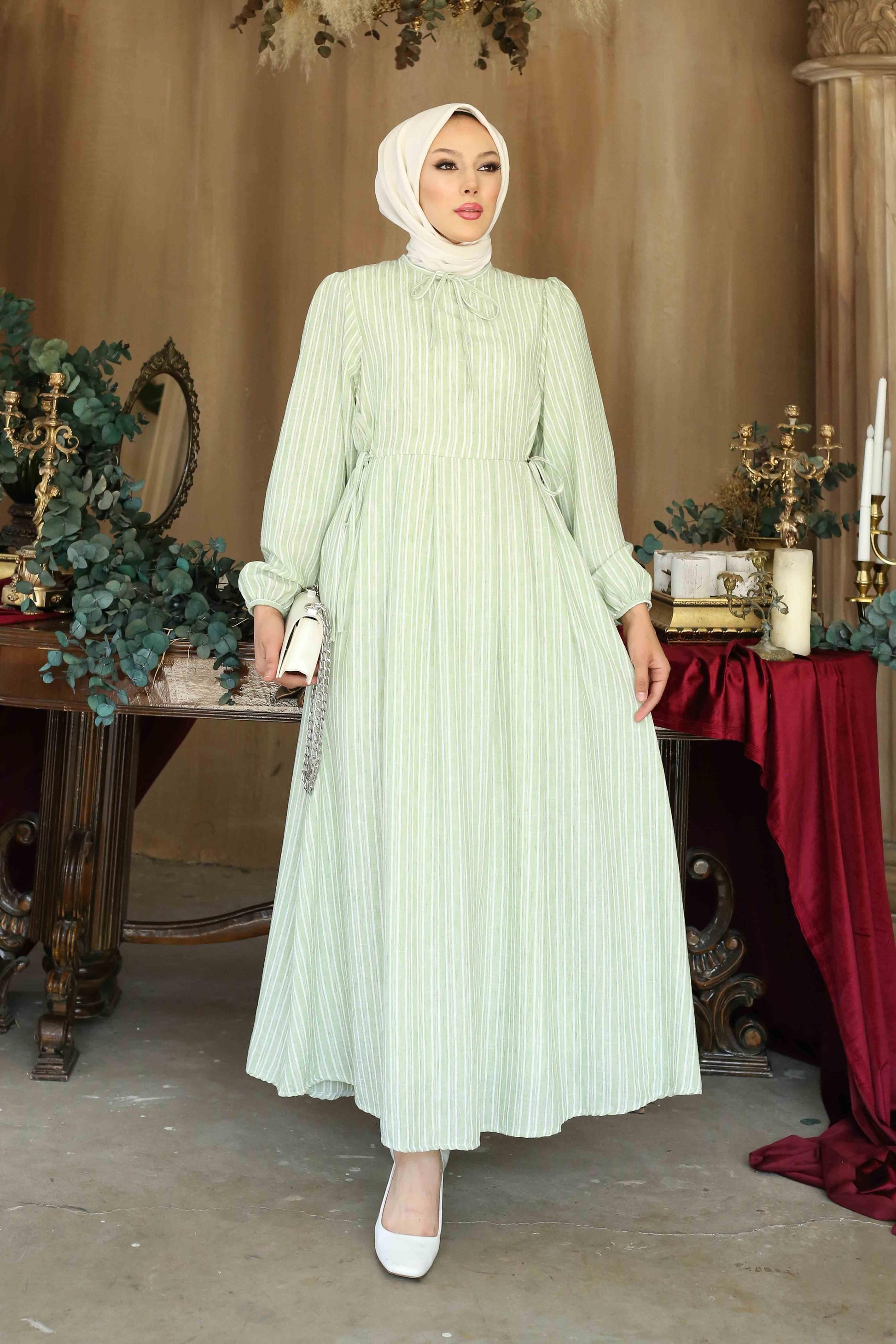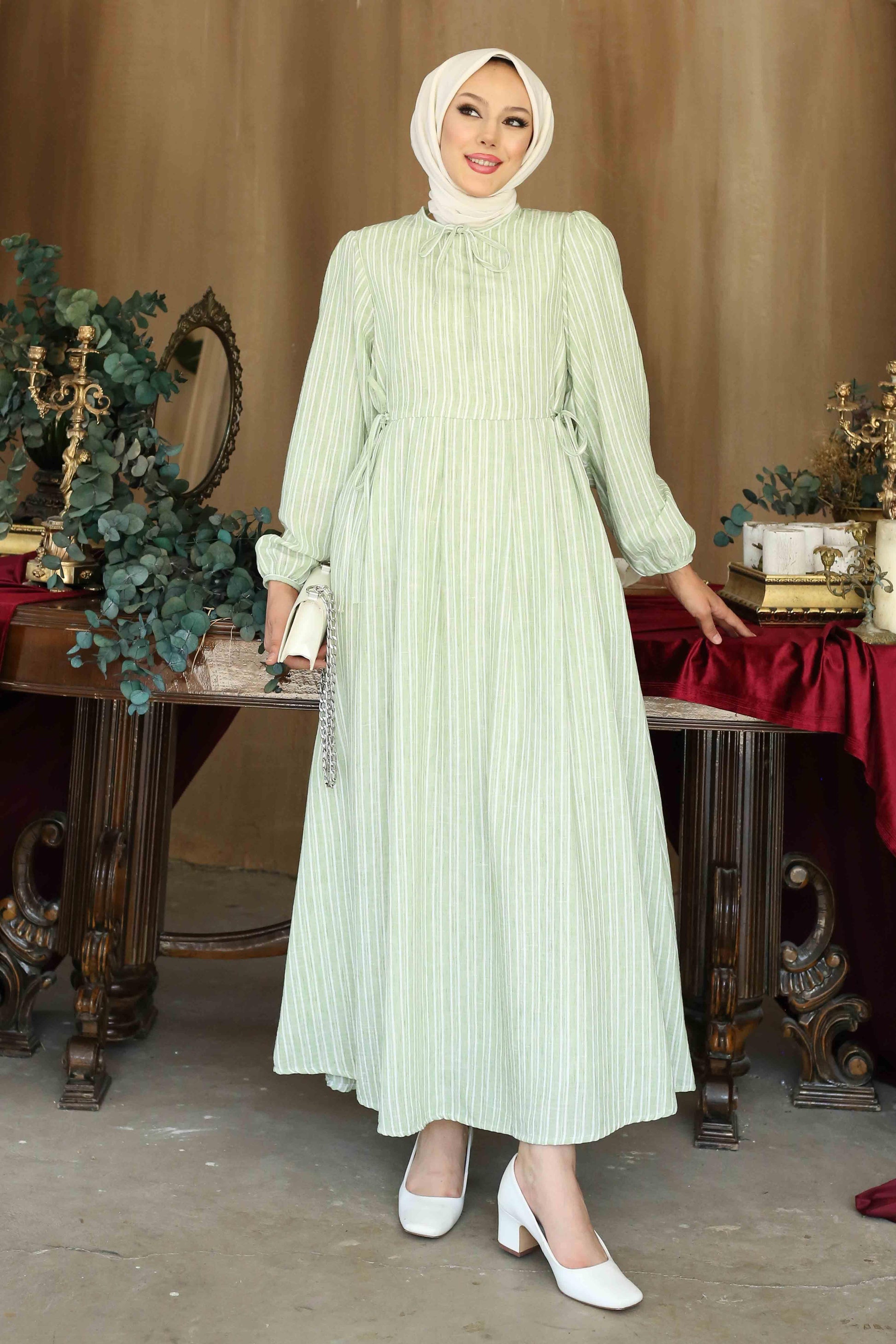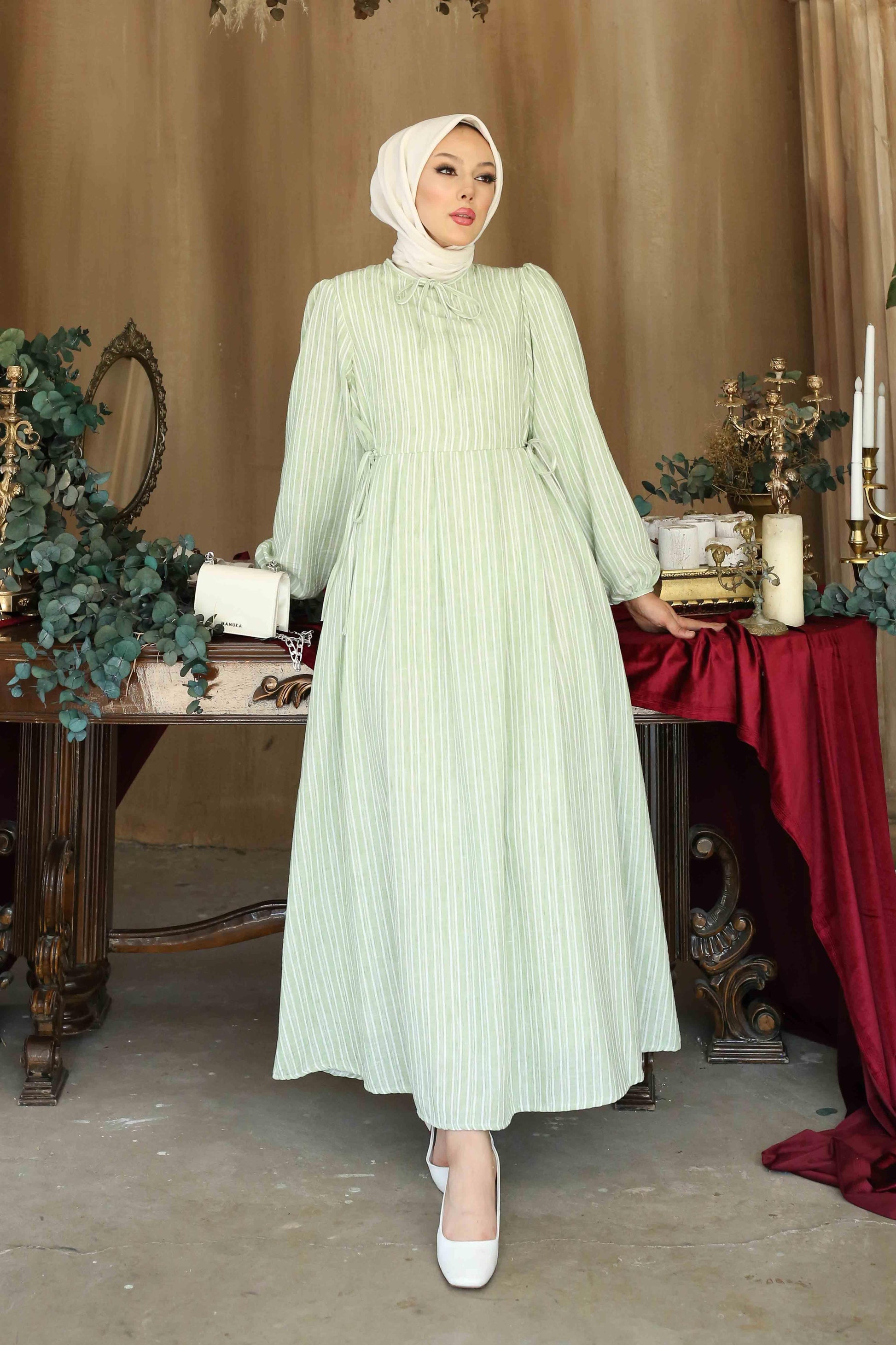 Galida Keten Çizgili Elbise Yeşil