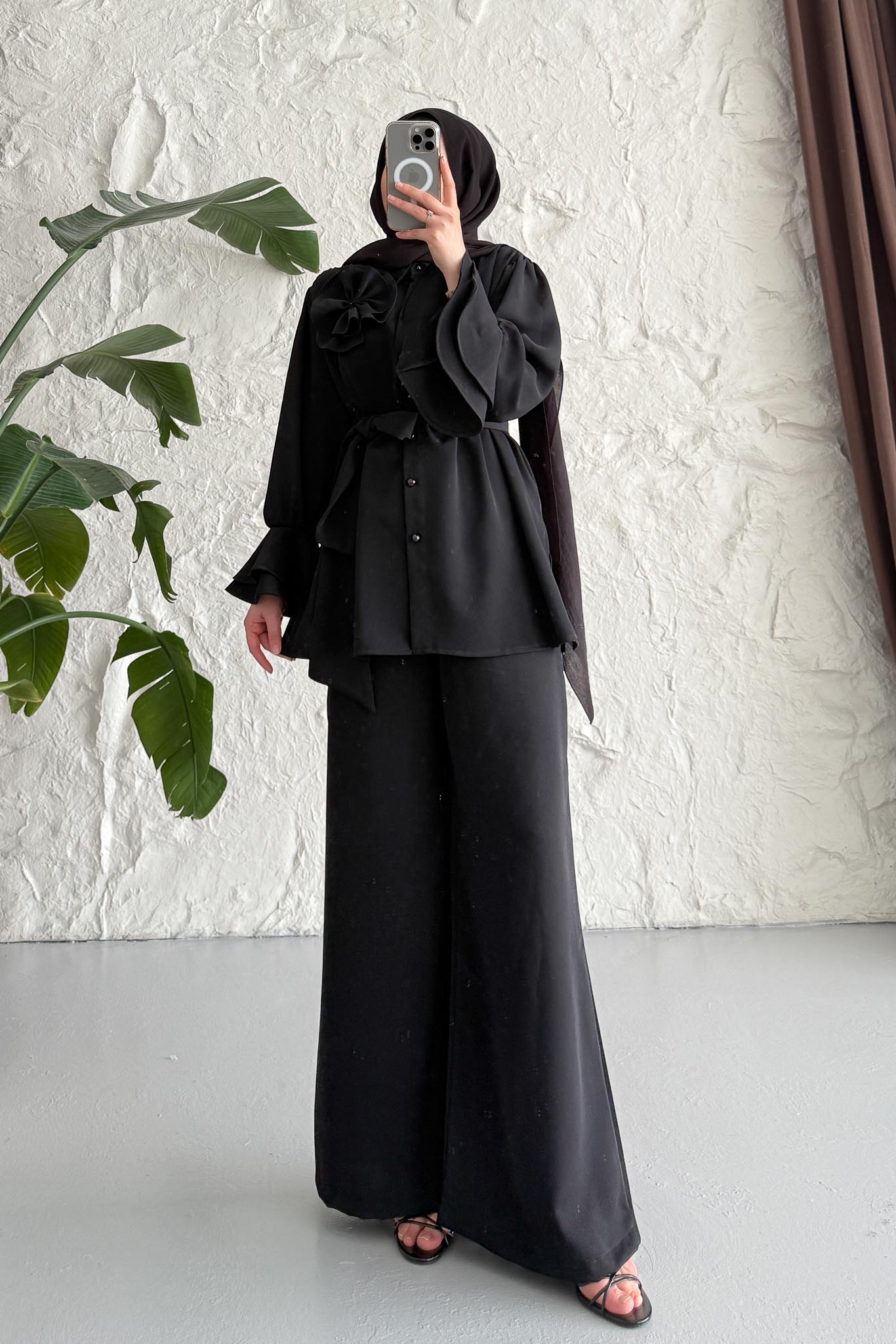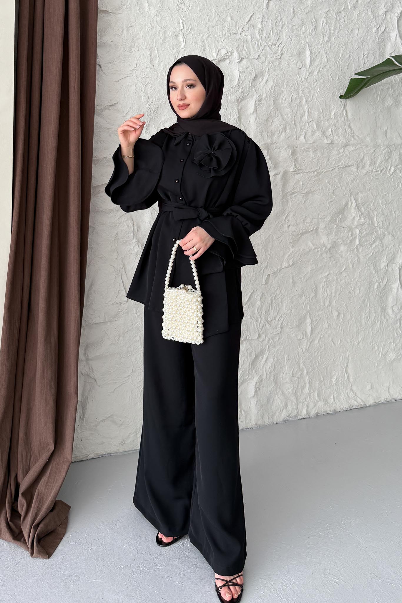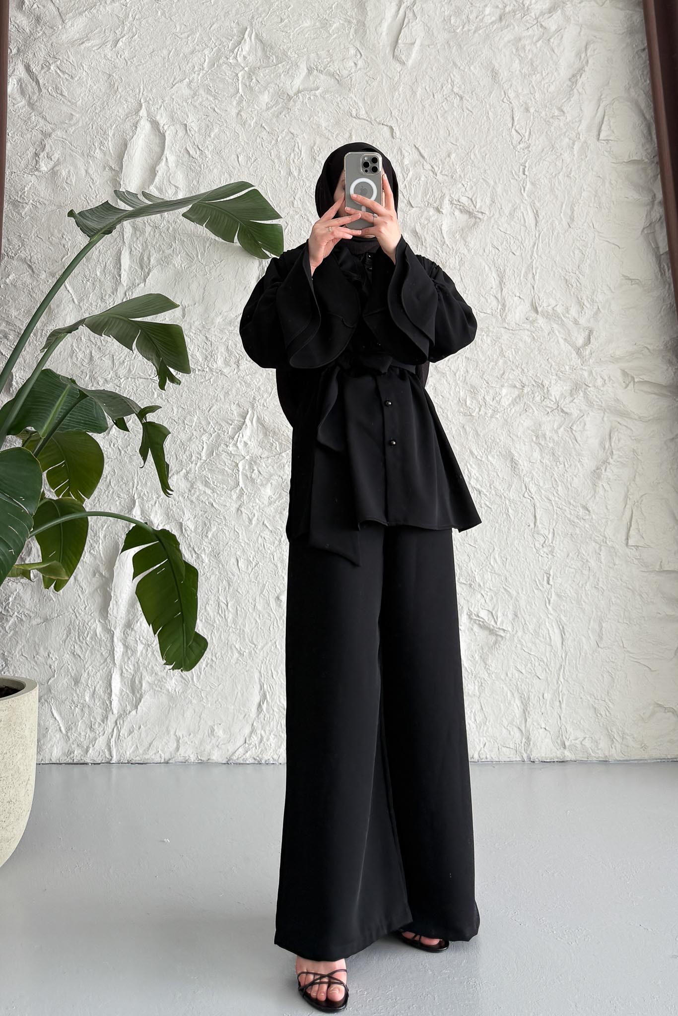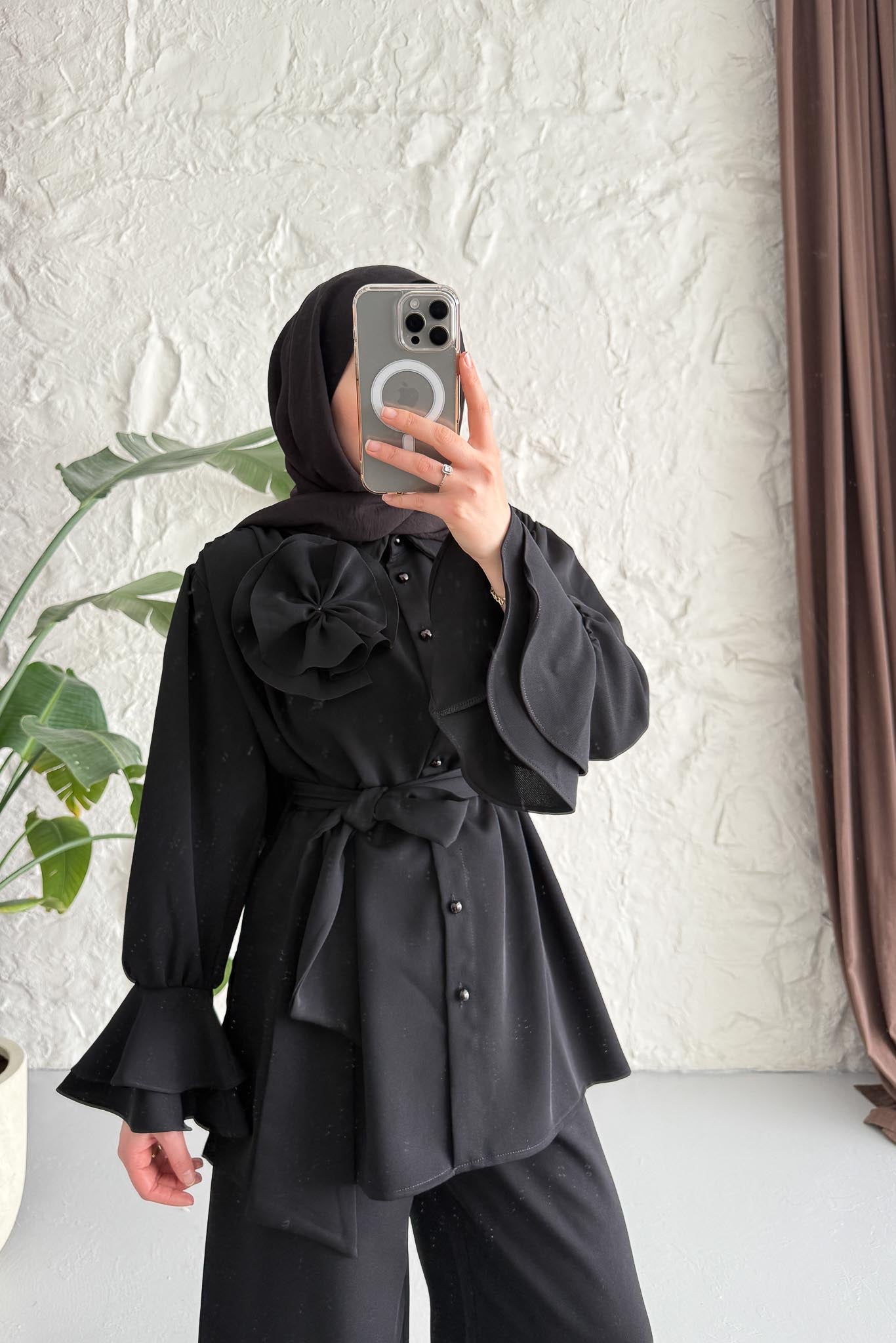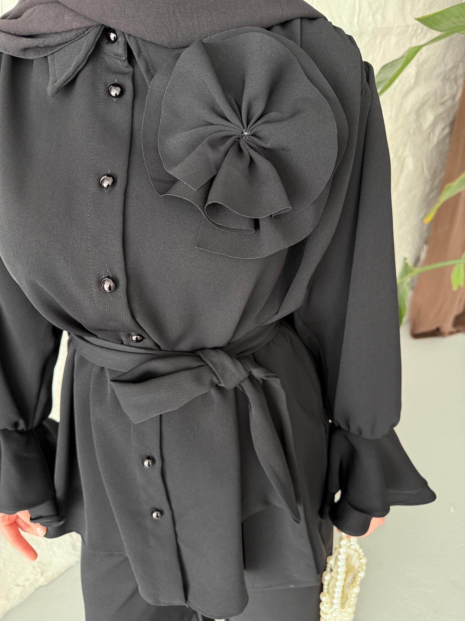 Tunik 72 cmdir ve Manşette volanlı gül motifi mevcuttur, Pantolon İspanyol formdadır rahattır, beli kemerlidir, ortalama 110 cm dir.