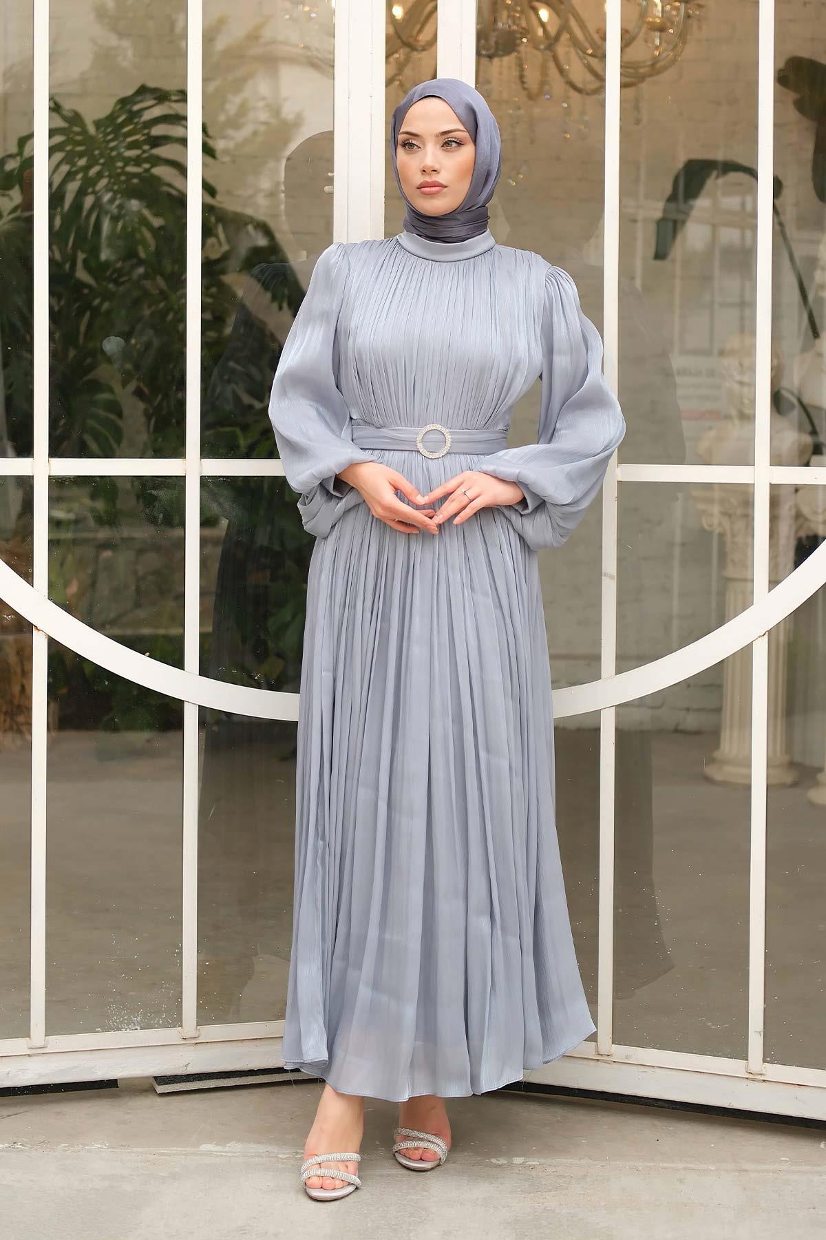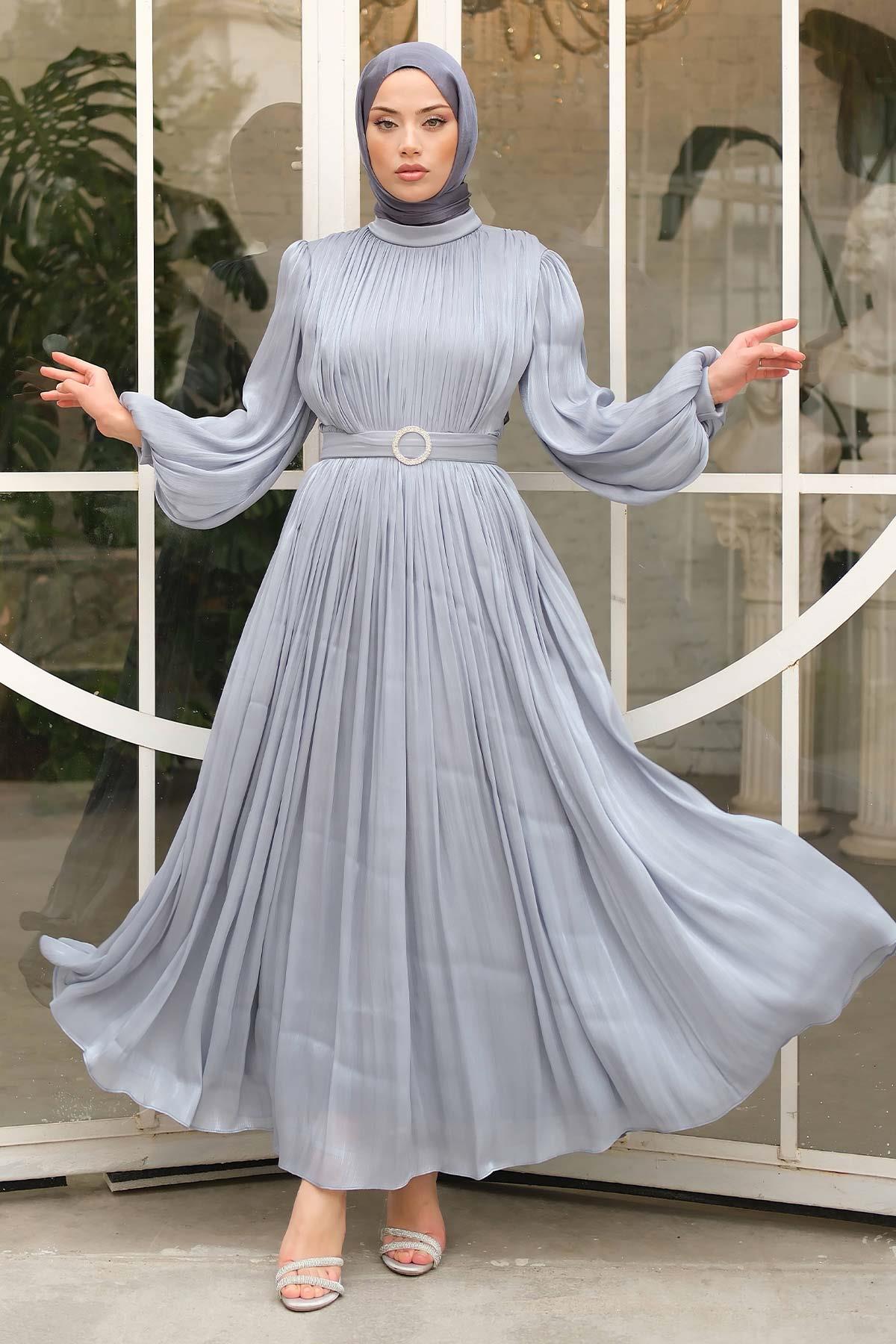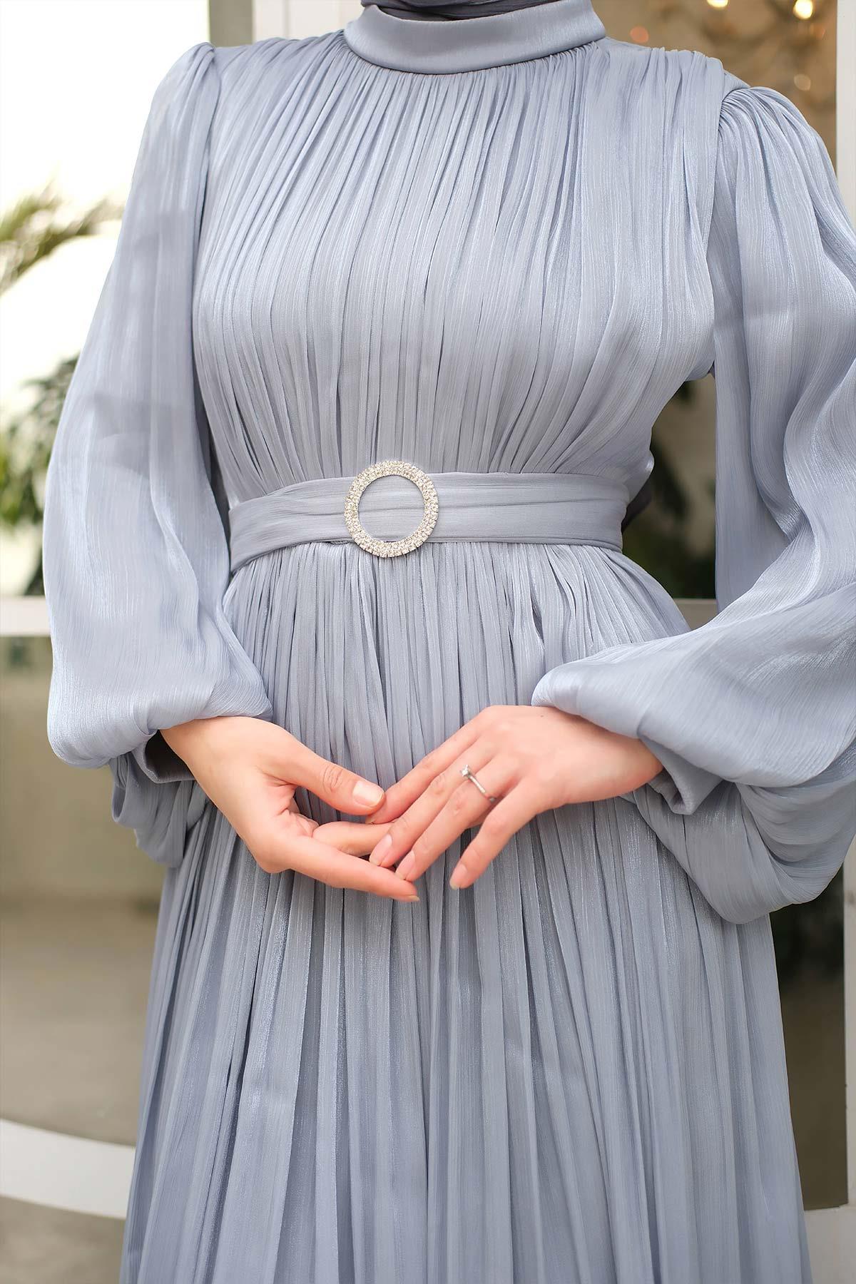 Gold Deren Abiye Elbise Gri