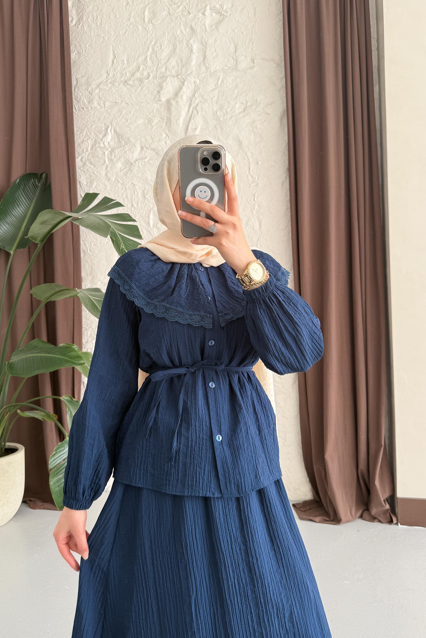 Gömlek, ortalama 55 cm, önü düğmeli, Kol ucu lastiklidir ve seyyar kuşaklıdır - Etek Kloş formdadır oldukça rahattır, Etek boyu ortalama 96 cm dir, Bel lastiklidir, Takım Komple astarlıdır.