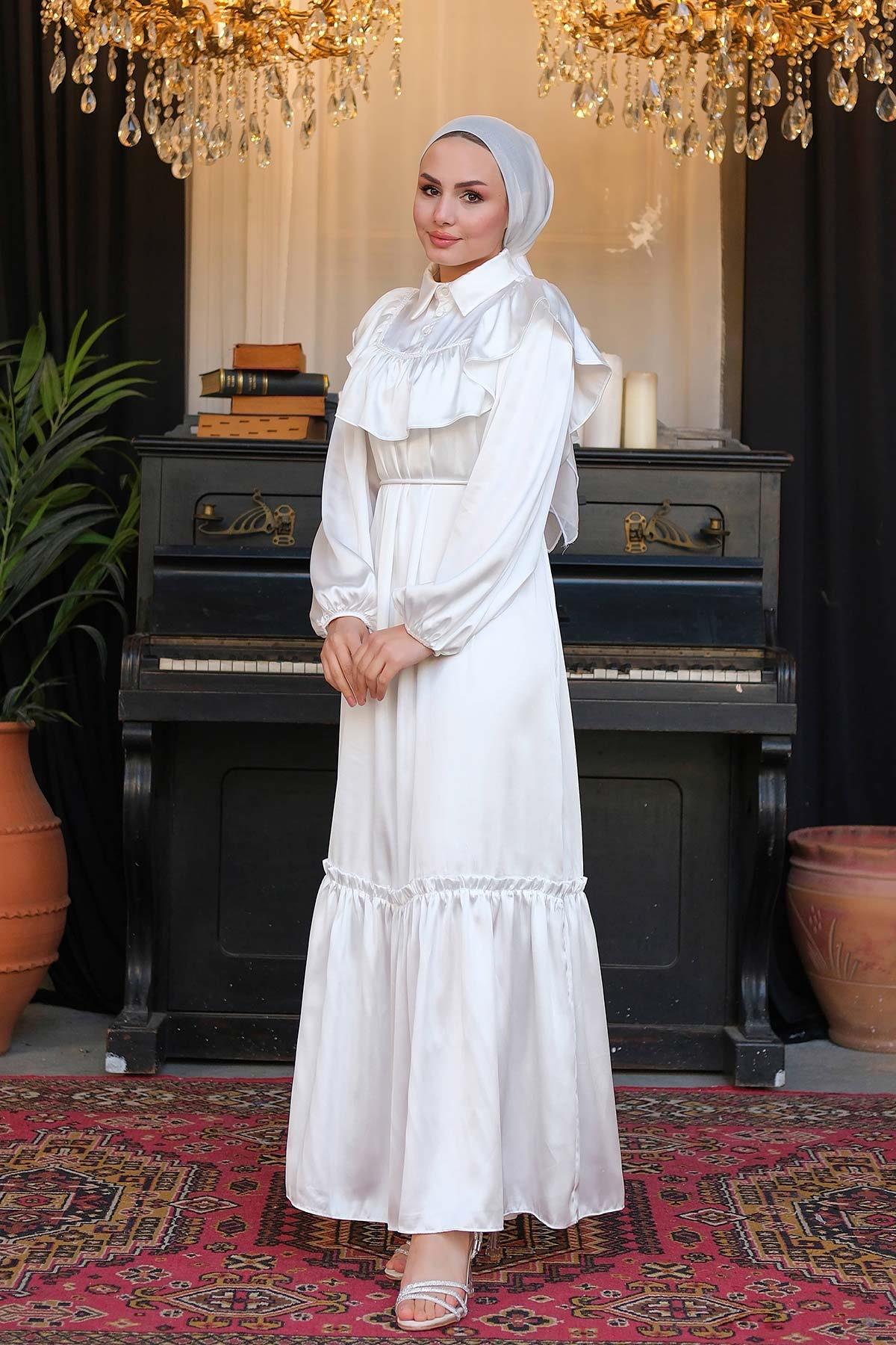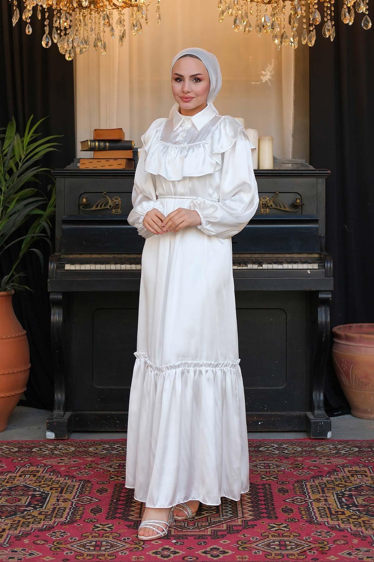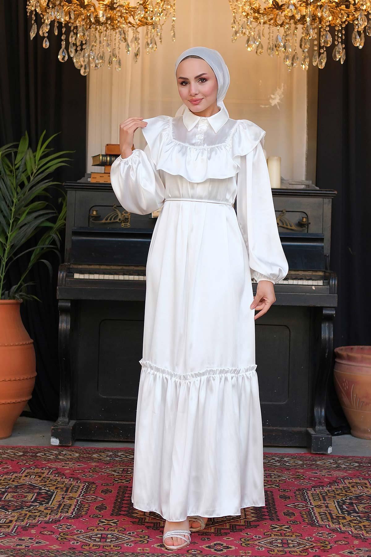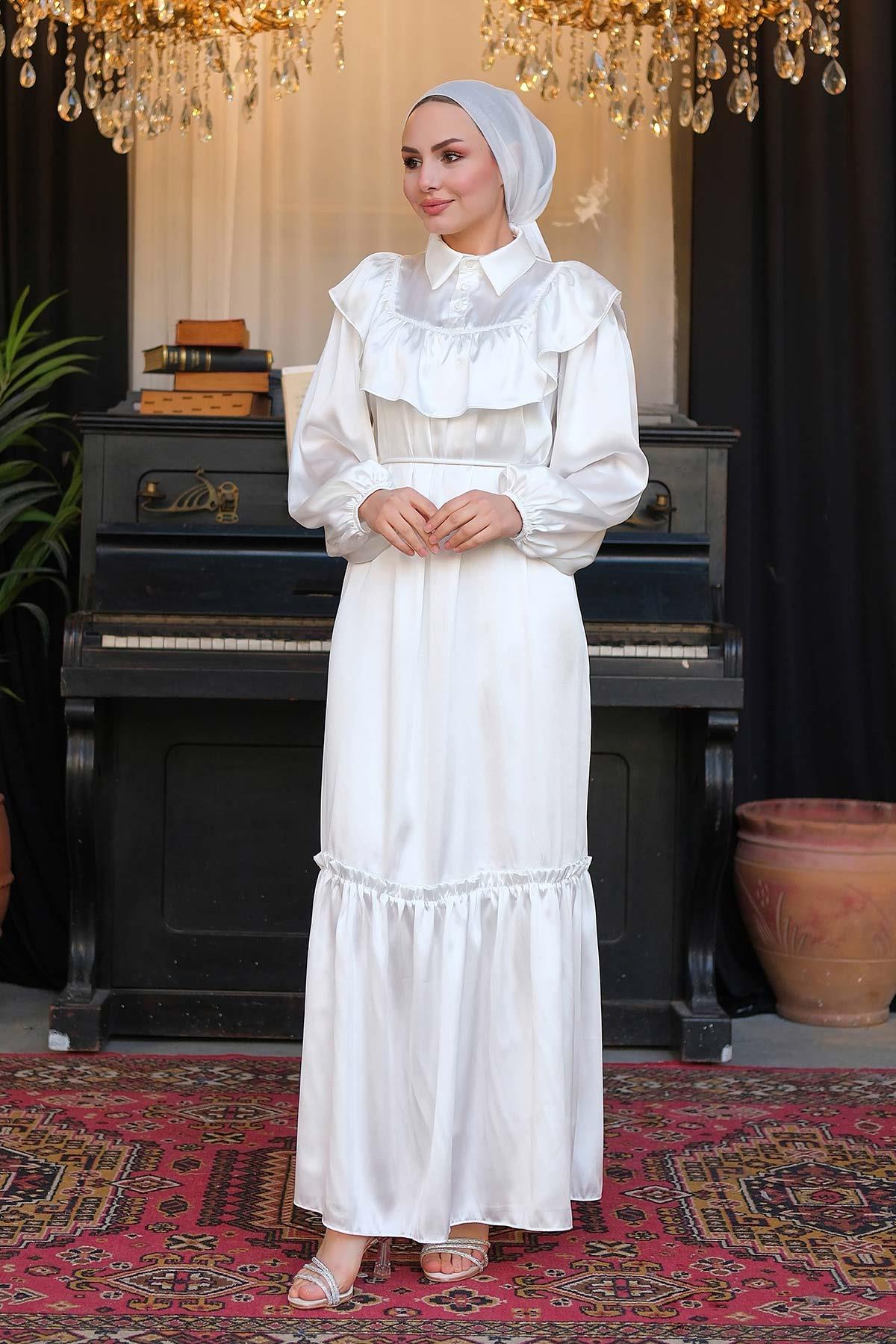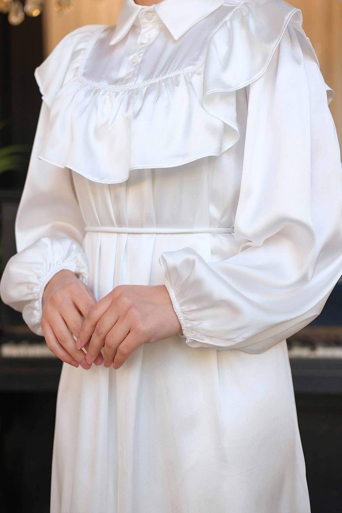 İpek Saten Dantelli Elbise Beyaz