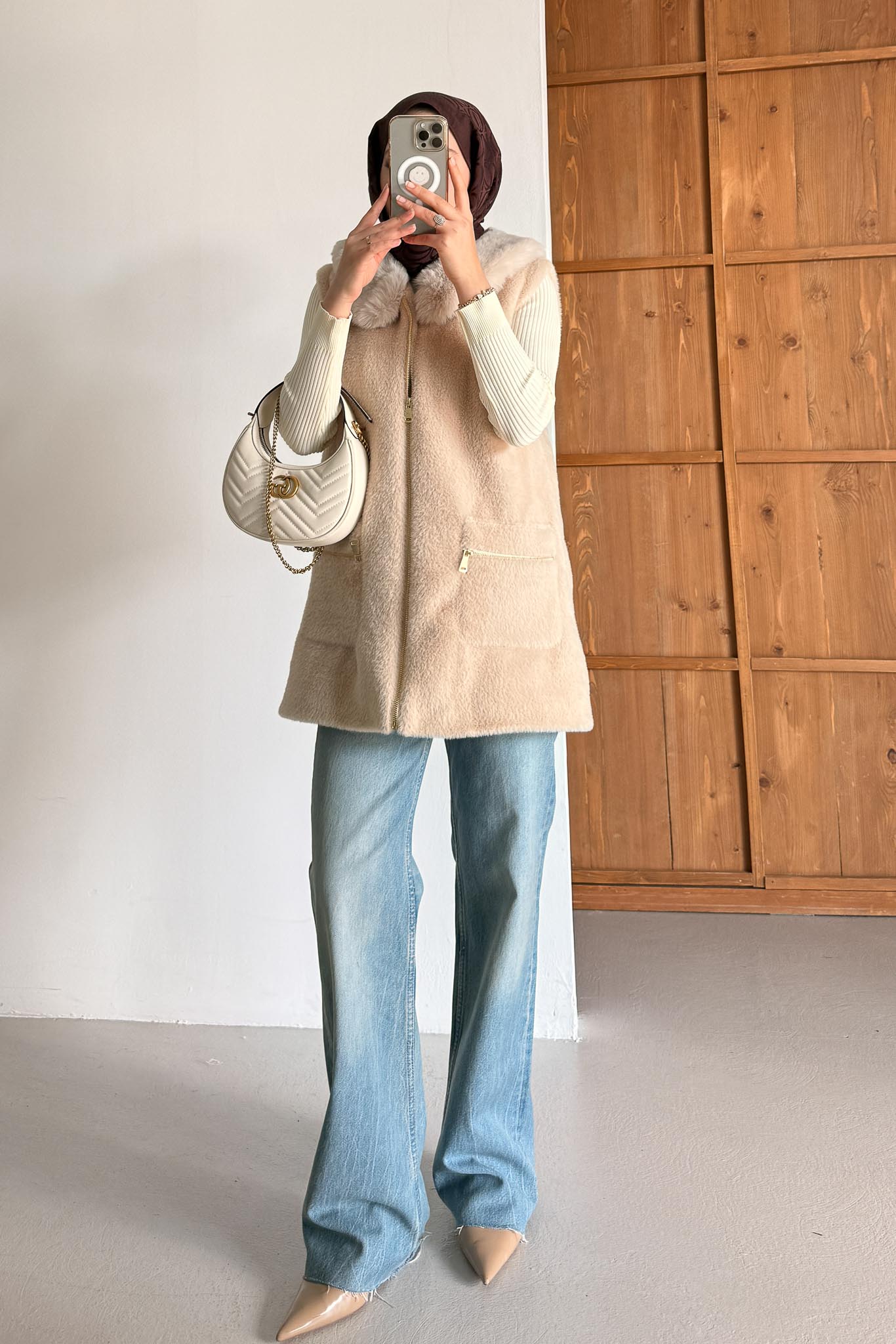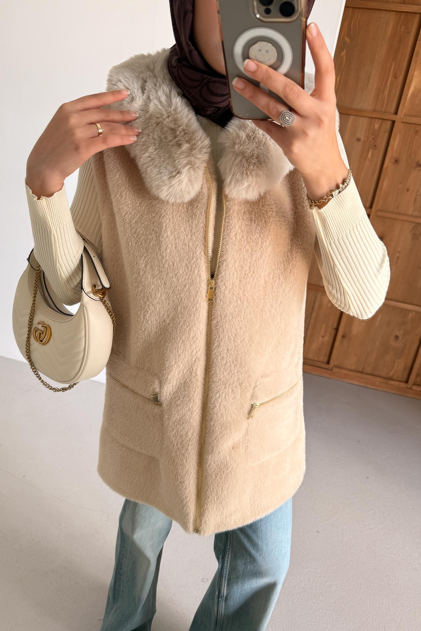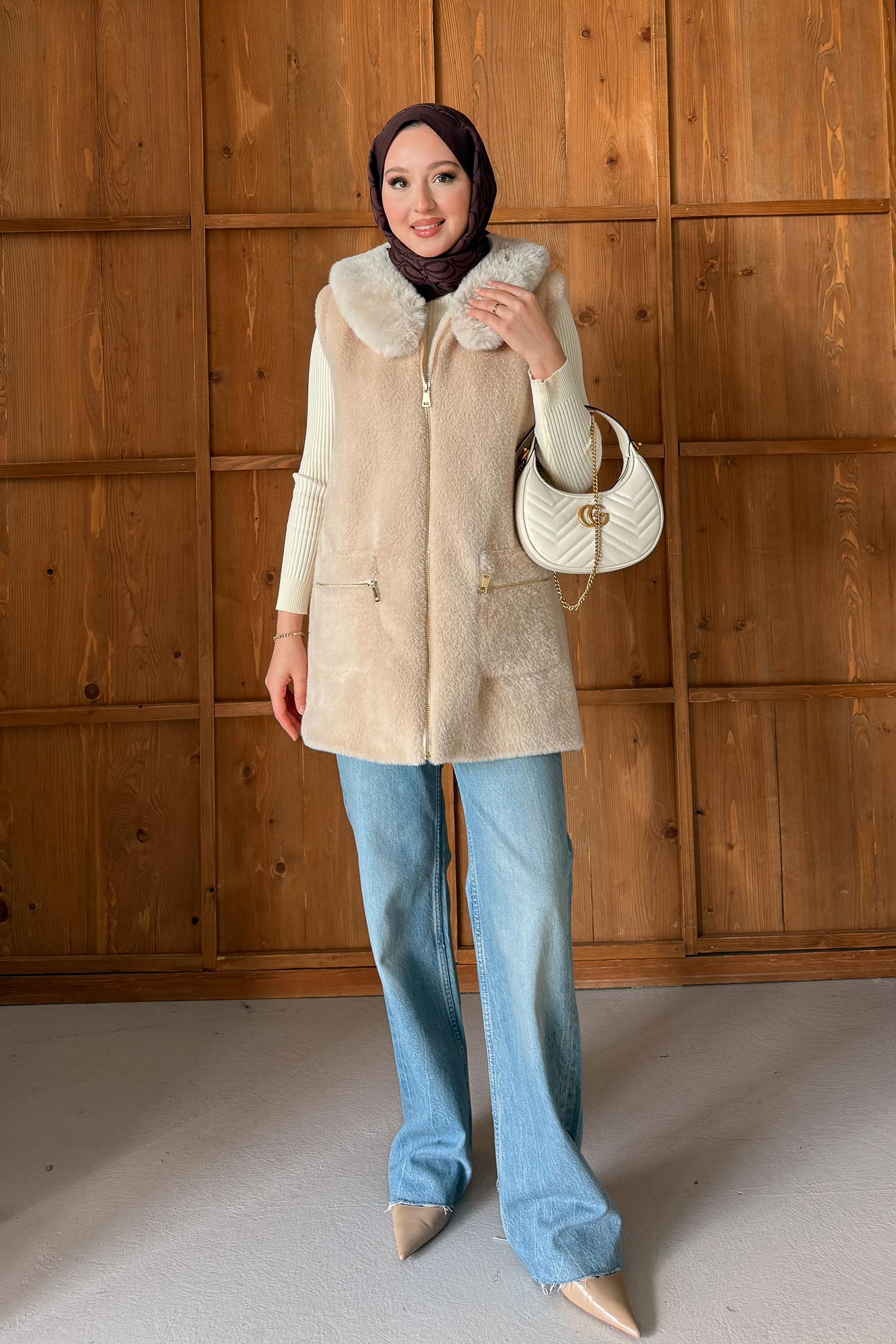 Fermuarlı ve ceplidir, Kürk kısmı takıp çıkarılabilir, Ortalama 80 cm dir.
