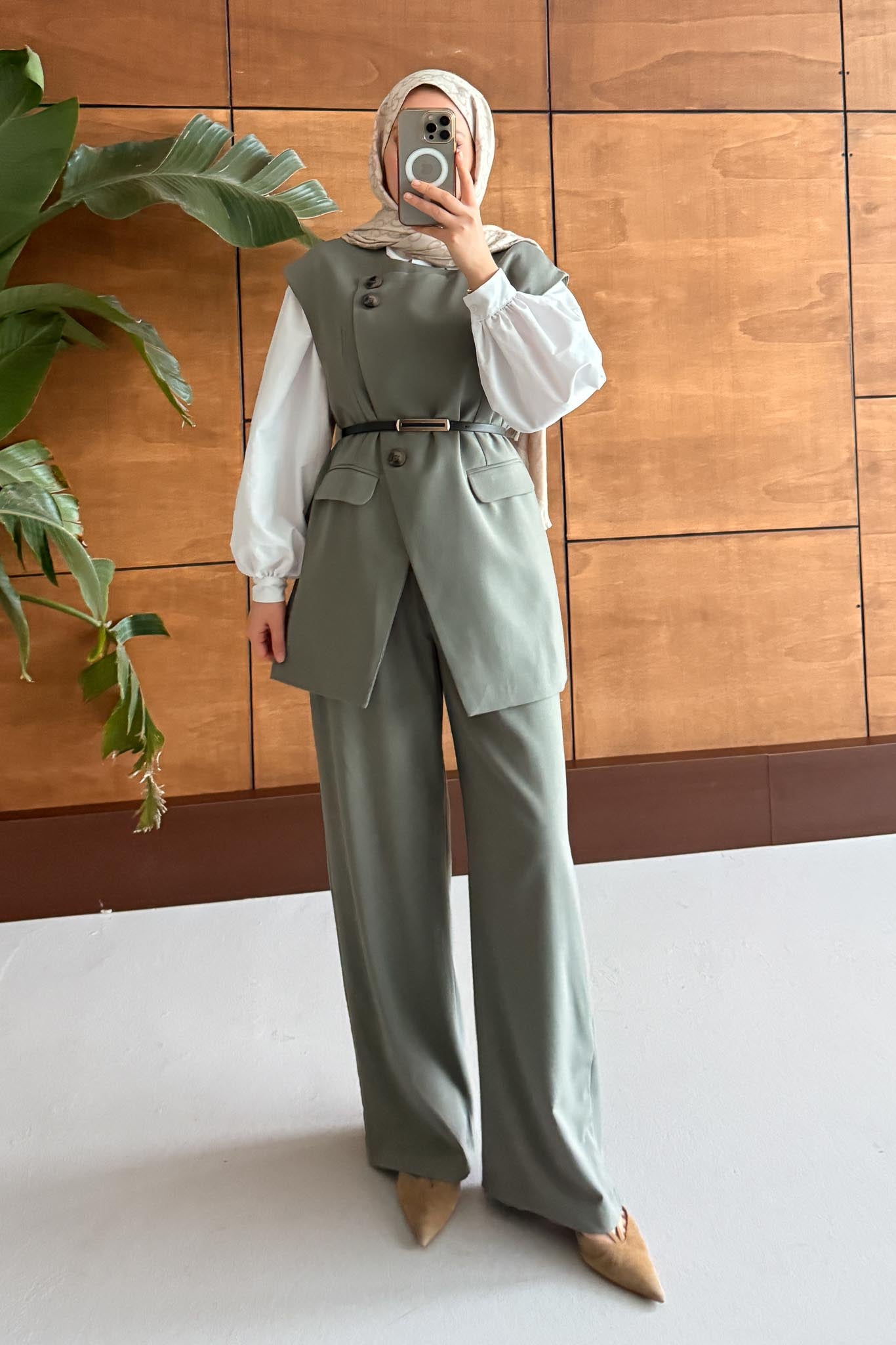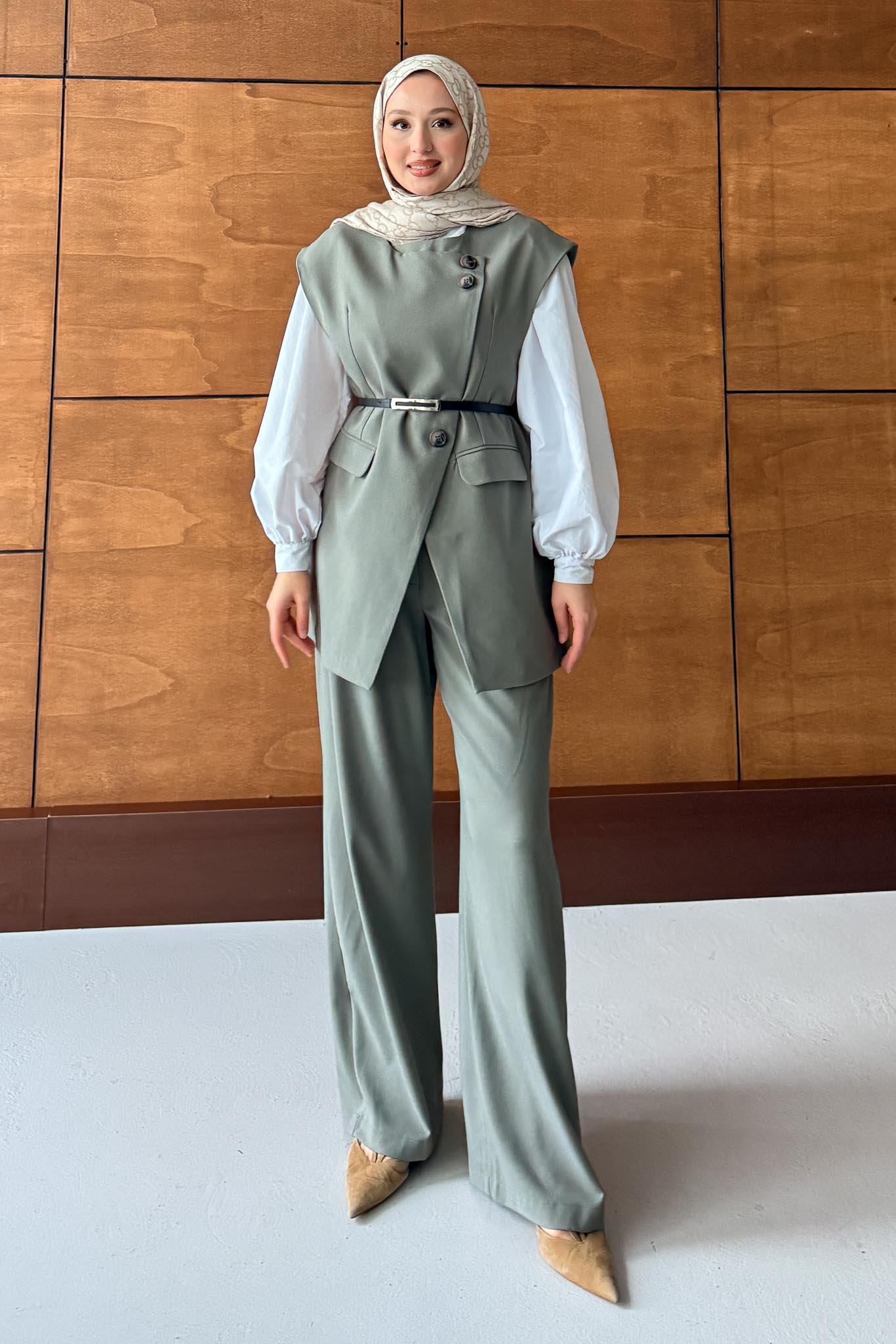 Yelek Düğmelidir, Kemer Takımın Yanında Hediye olarak pakete ekleniyor, Pantolon Palazzo formdadır rahattır.