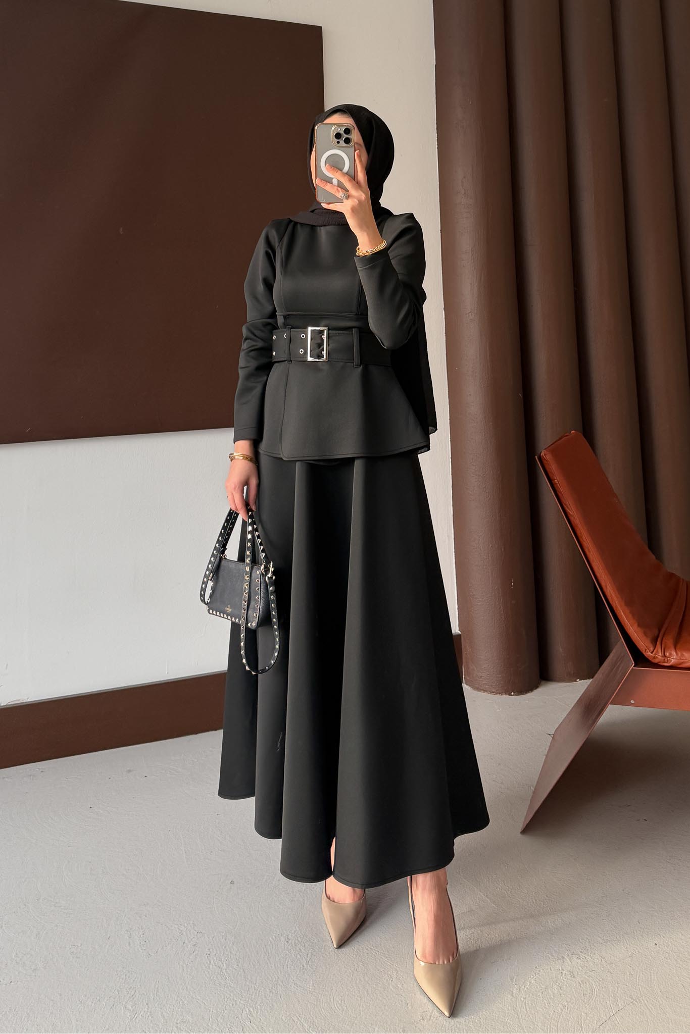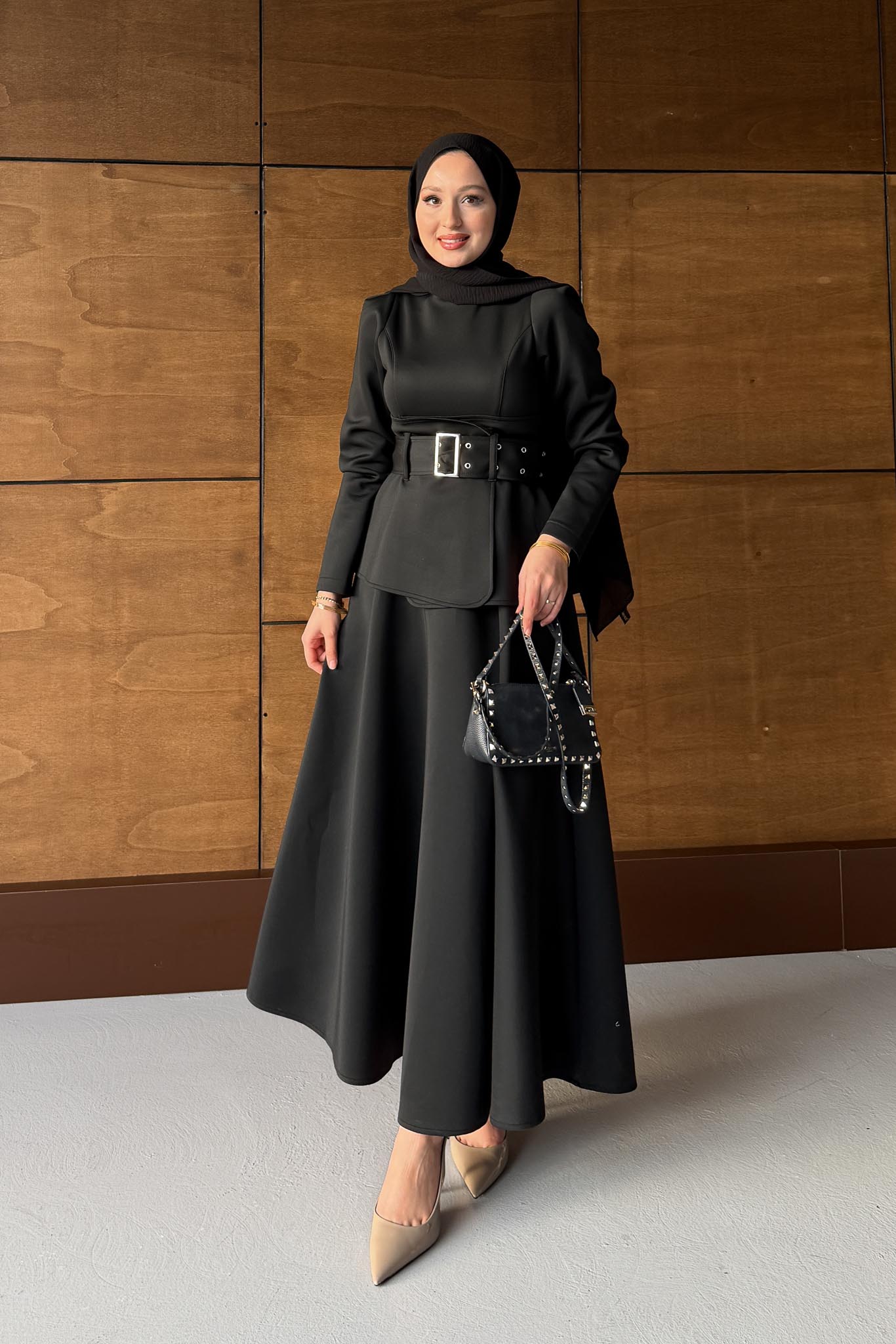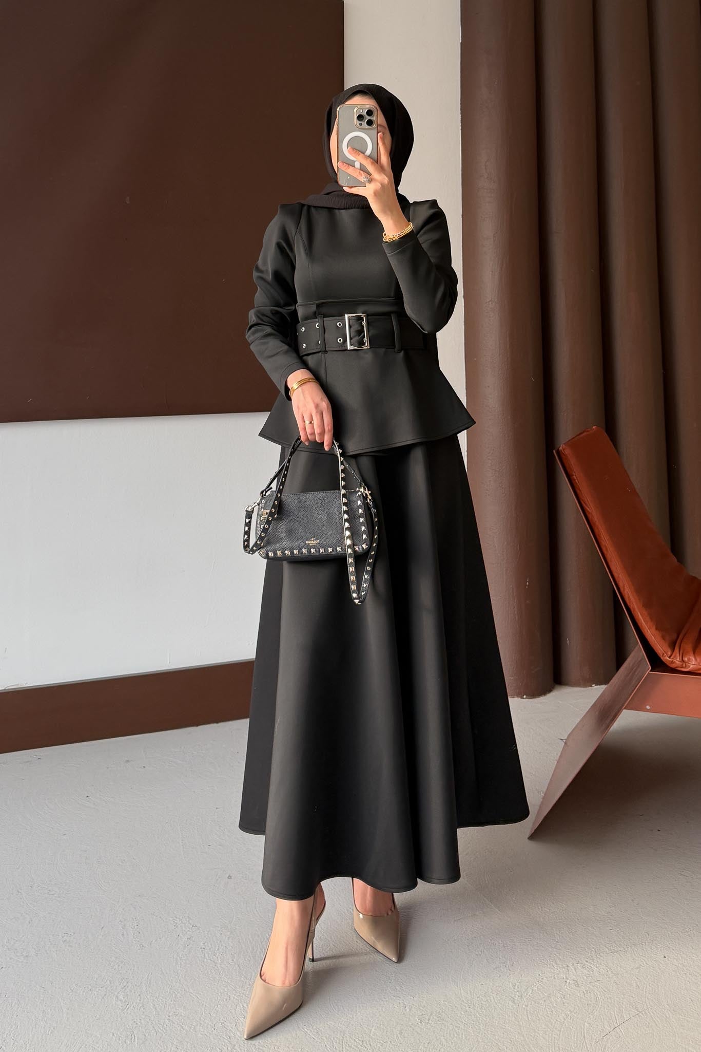 Kemerli Düğmeli Elbise Siyah