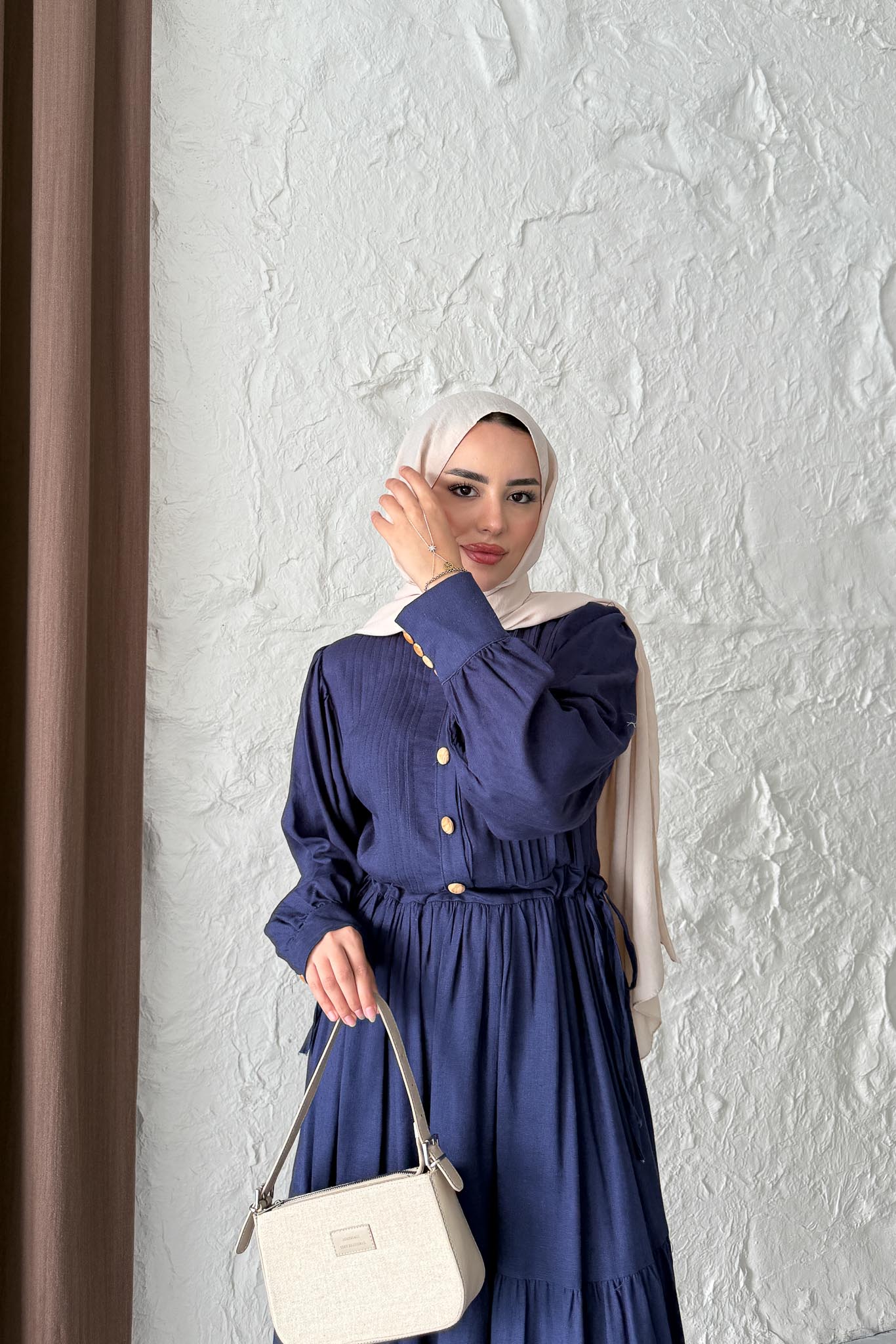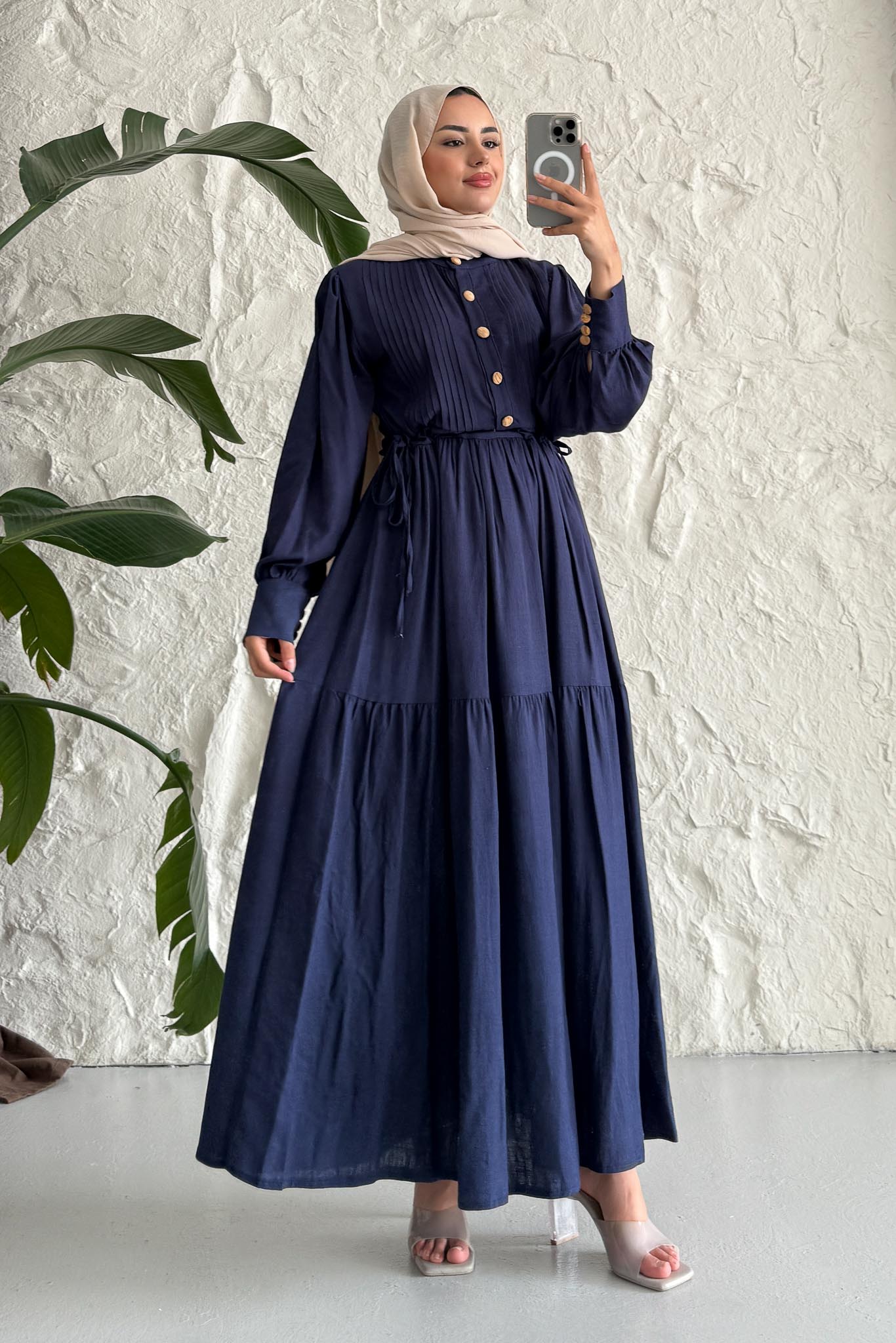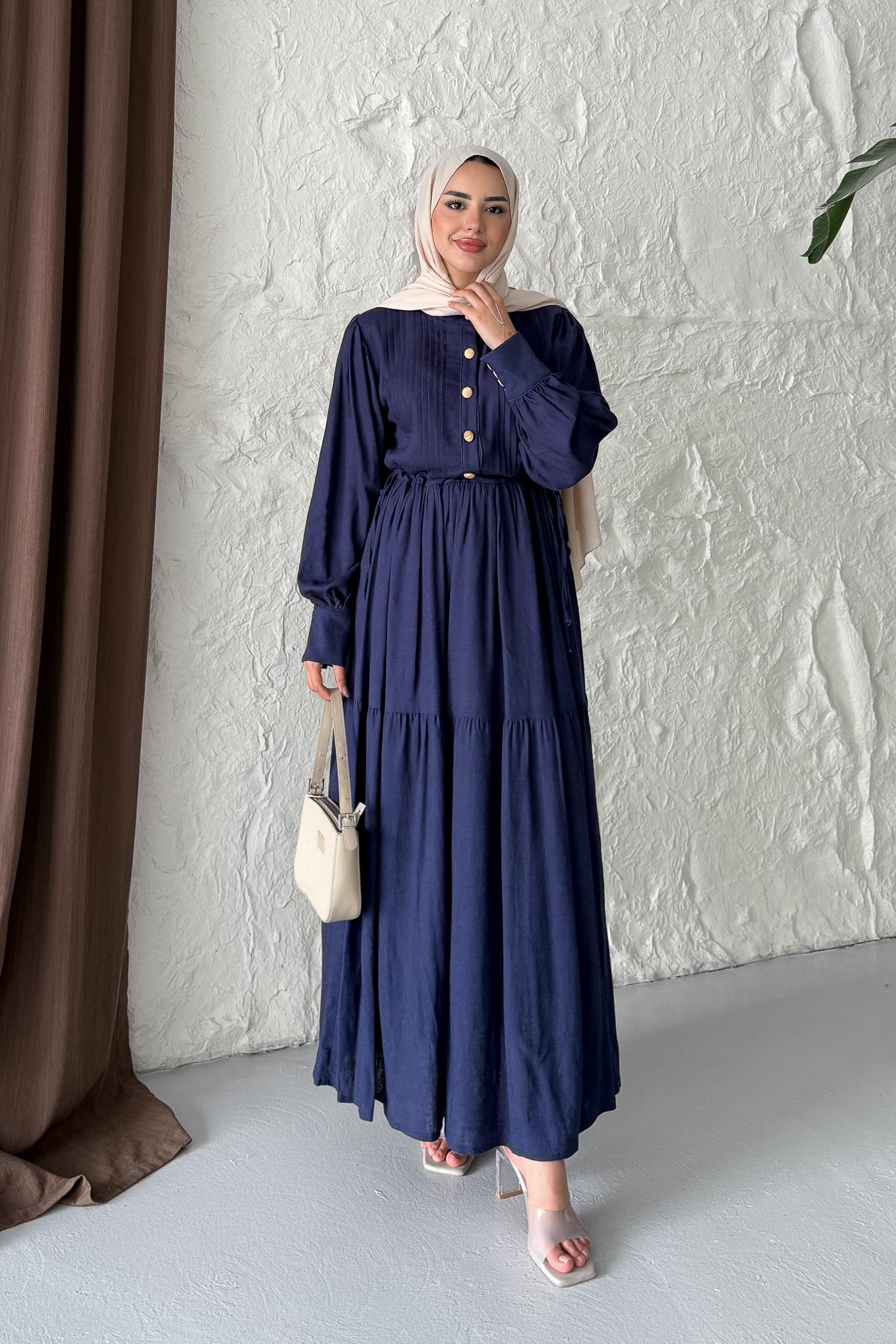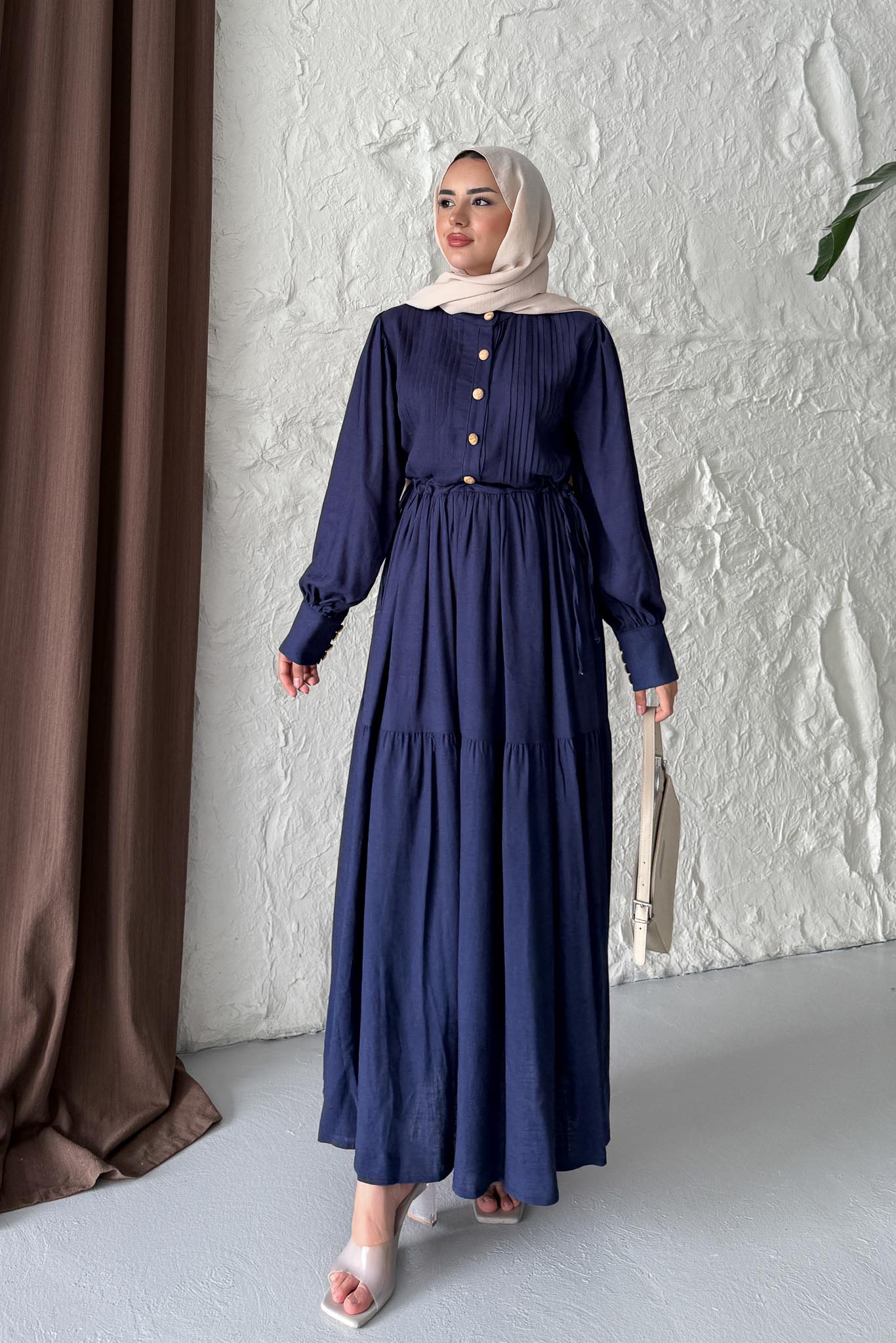 Keten Broş Düğmeli Elbise Lacivert