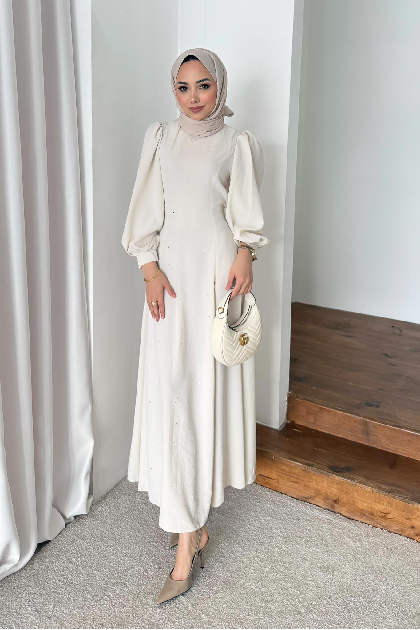 Fit Kalıptır Formdadır, Kol Ucu Manşetlidir, Elbise Boy; ortalama 135 cm. Balon Kolludur.