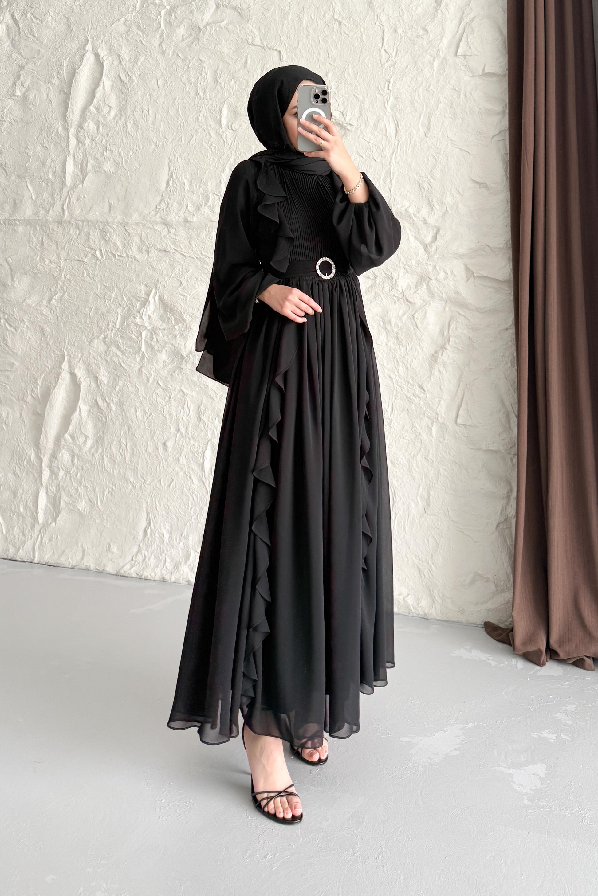 Seyyar kuşaklıdır, fır fır detaylıdır, göğüs önü piliselidir, Vual Astarlıdır, İç göstermez ve Rahat bir elbisedir, Ortalama 137-140 cmdir.