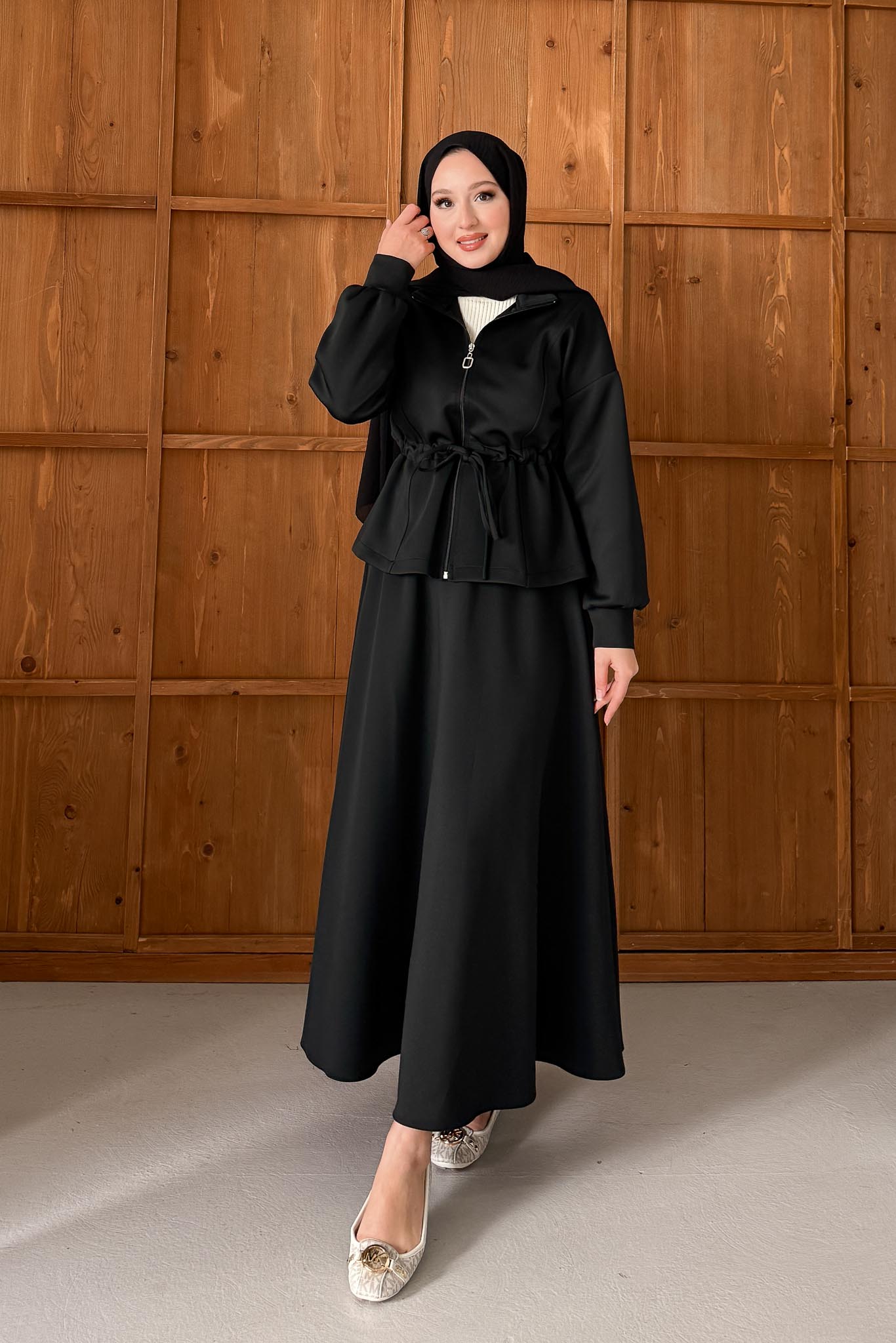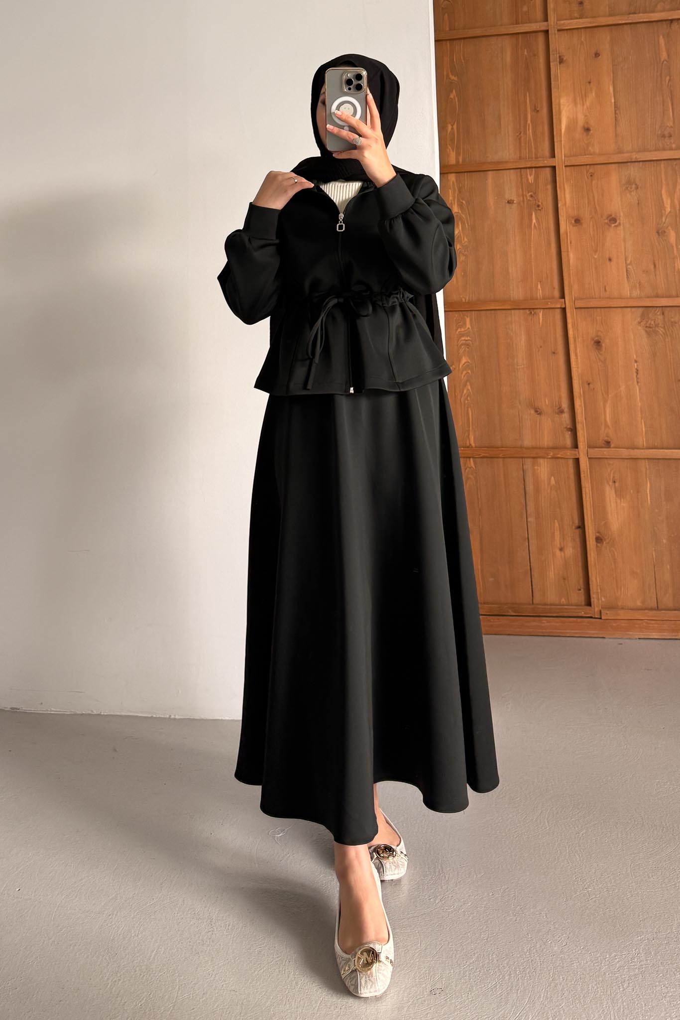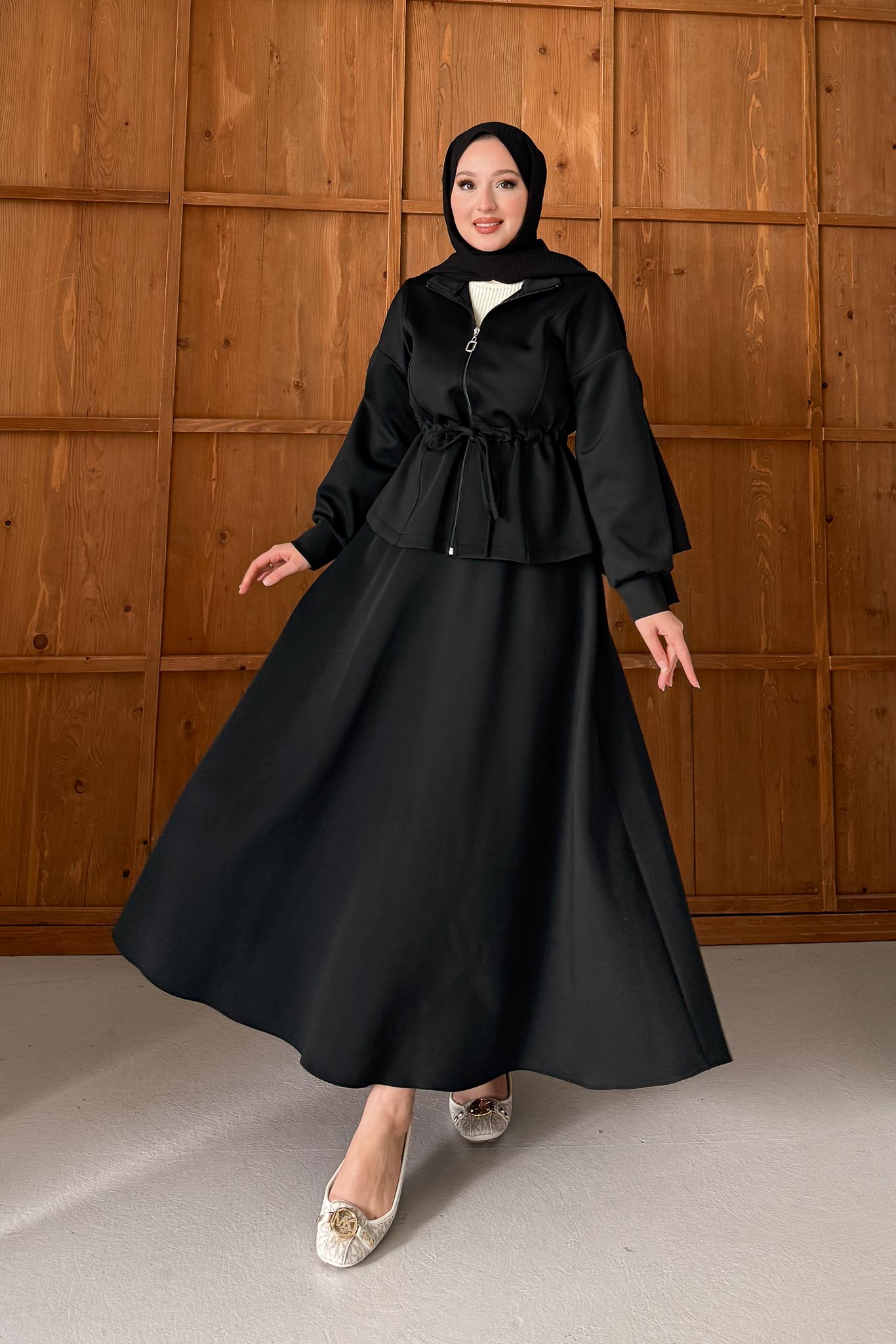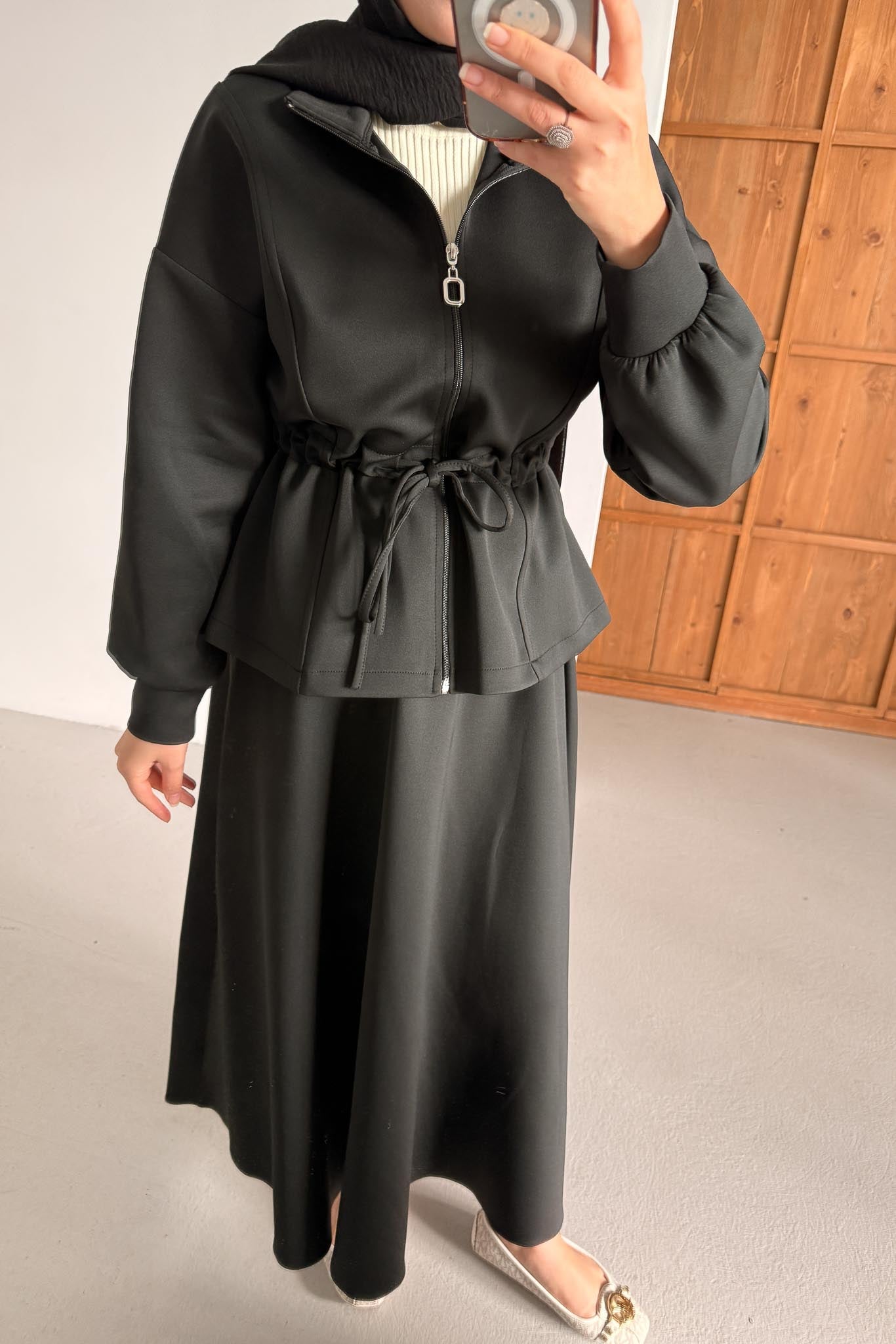 Tunik 65 cm uzunluğunda, kendinden bağcıklı kuşaklıdır, boydan fermuarlıdır, kol hafif balon kolludur. Etek beli Kumaş kemerinden lastiklidir.