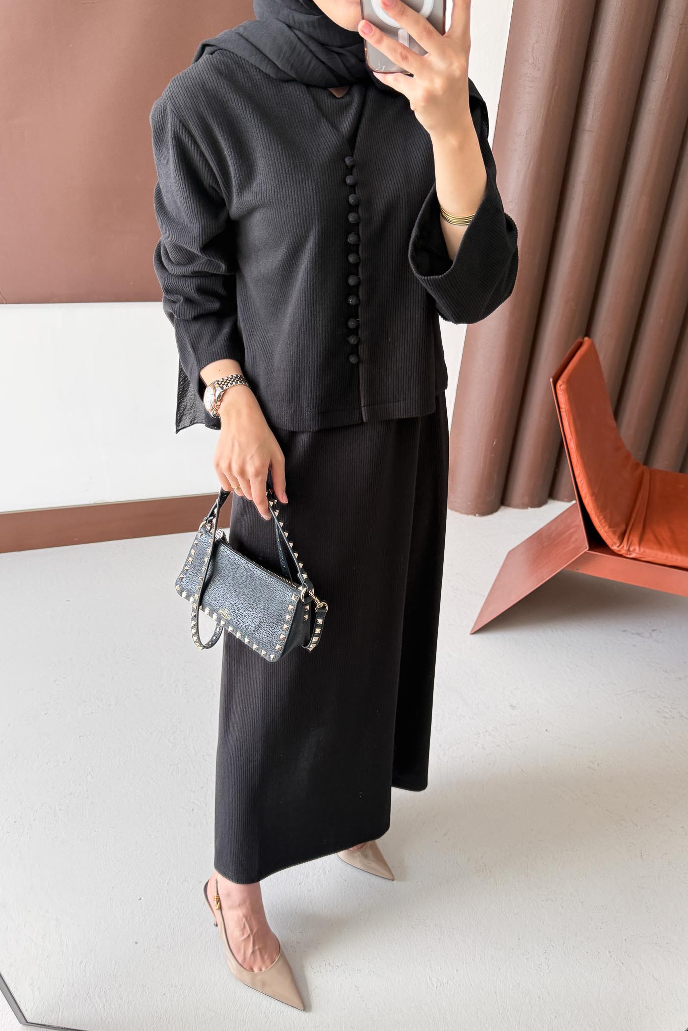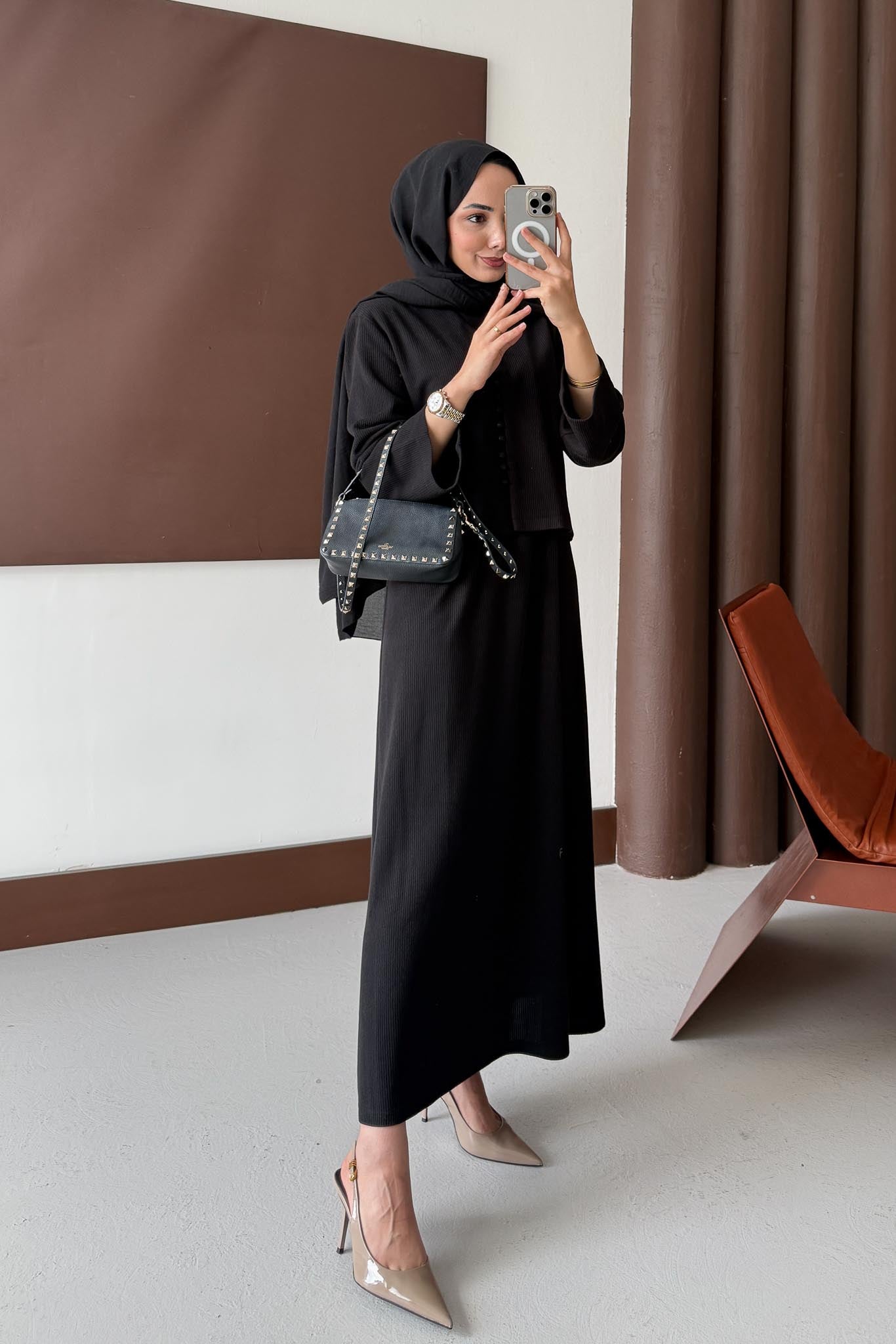 İki Parçadır, iç kısımda Sıfır kol elbise vardır, üst kısımda düğmeli Crop vardır.