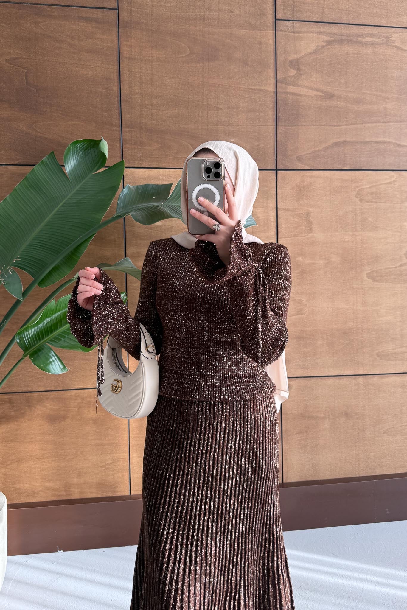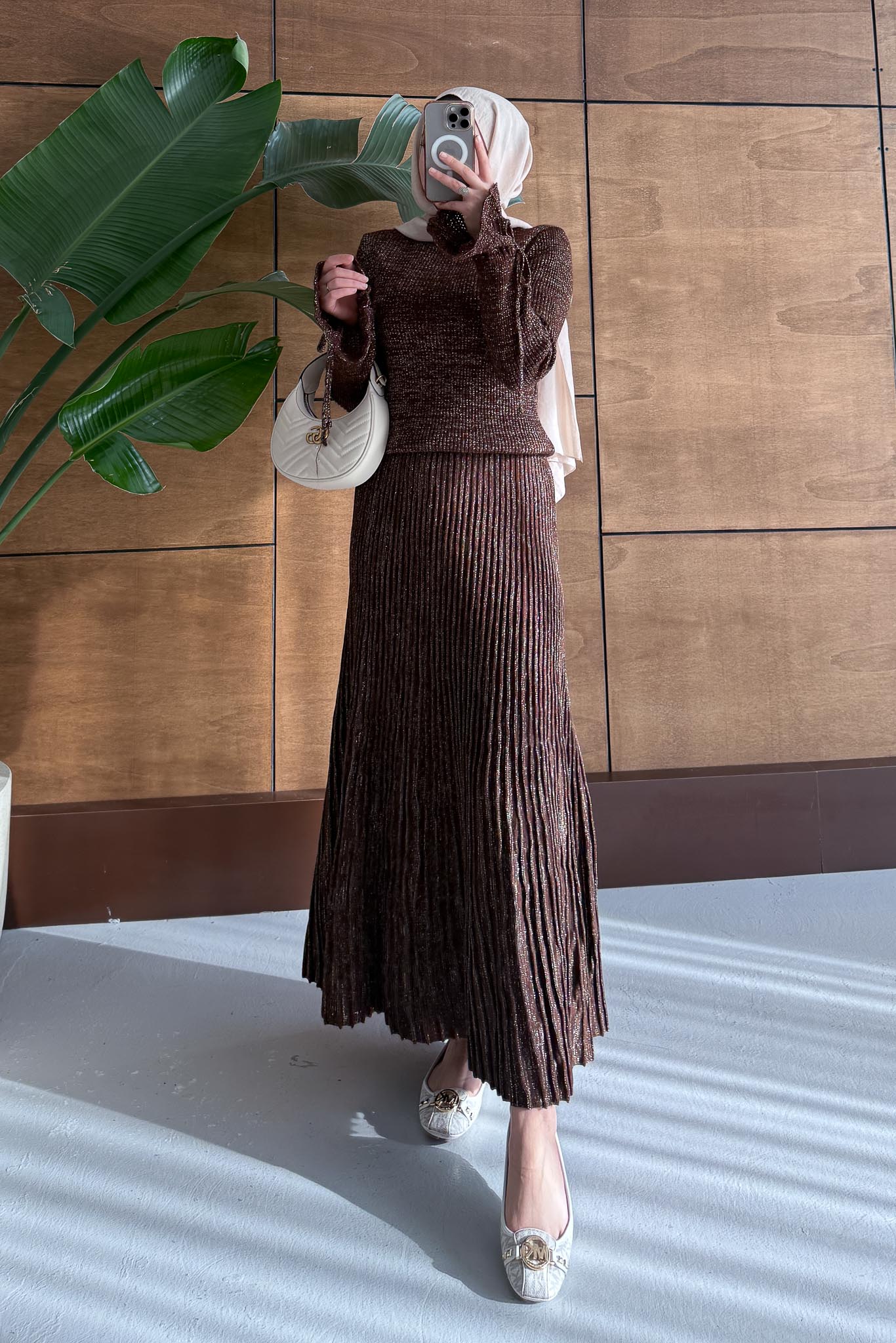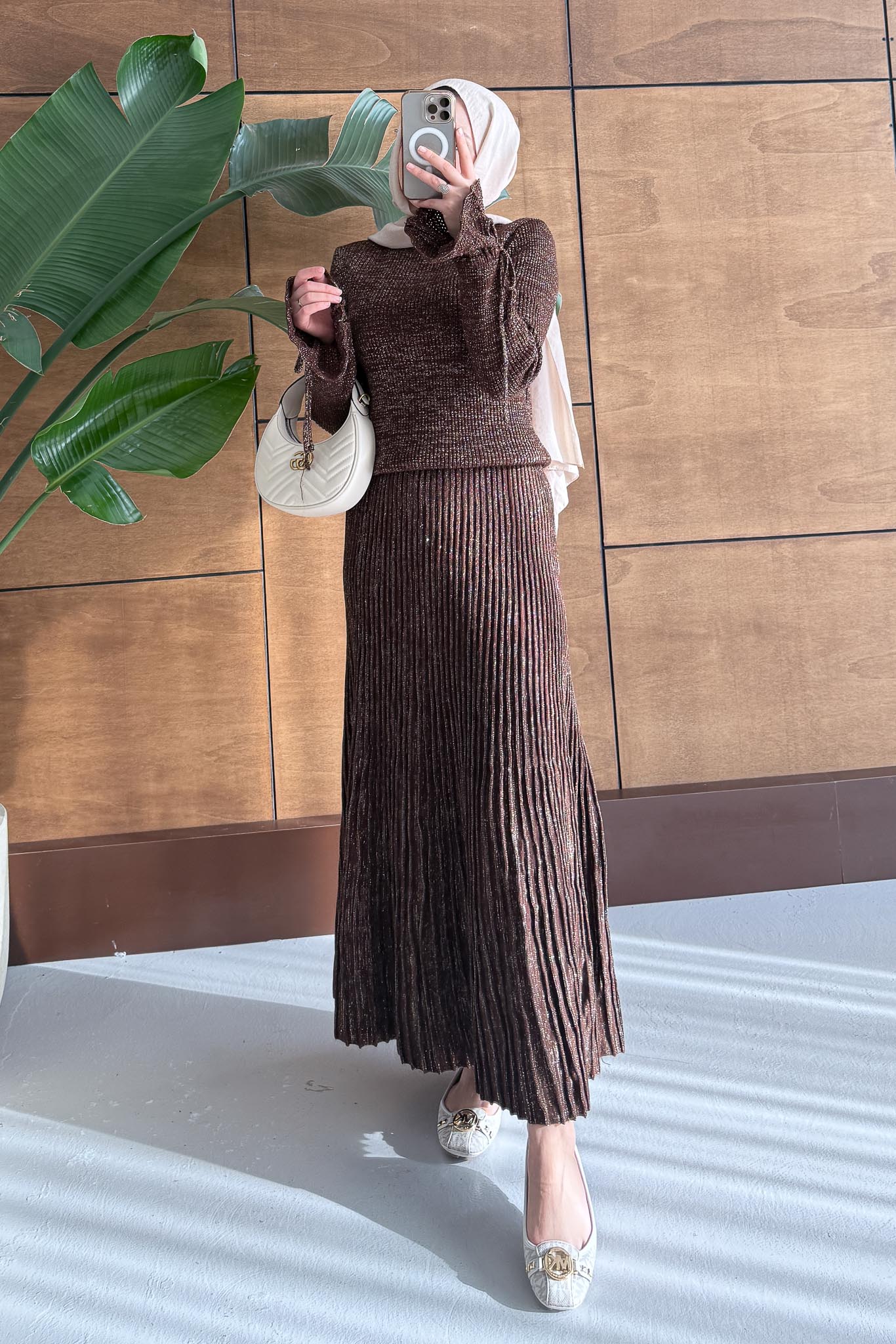 Parıltı Simli Etek Takım Kahverengi