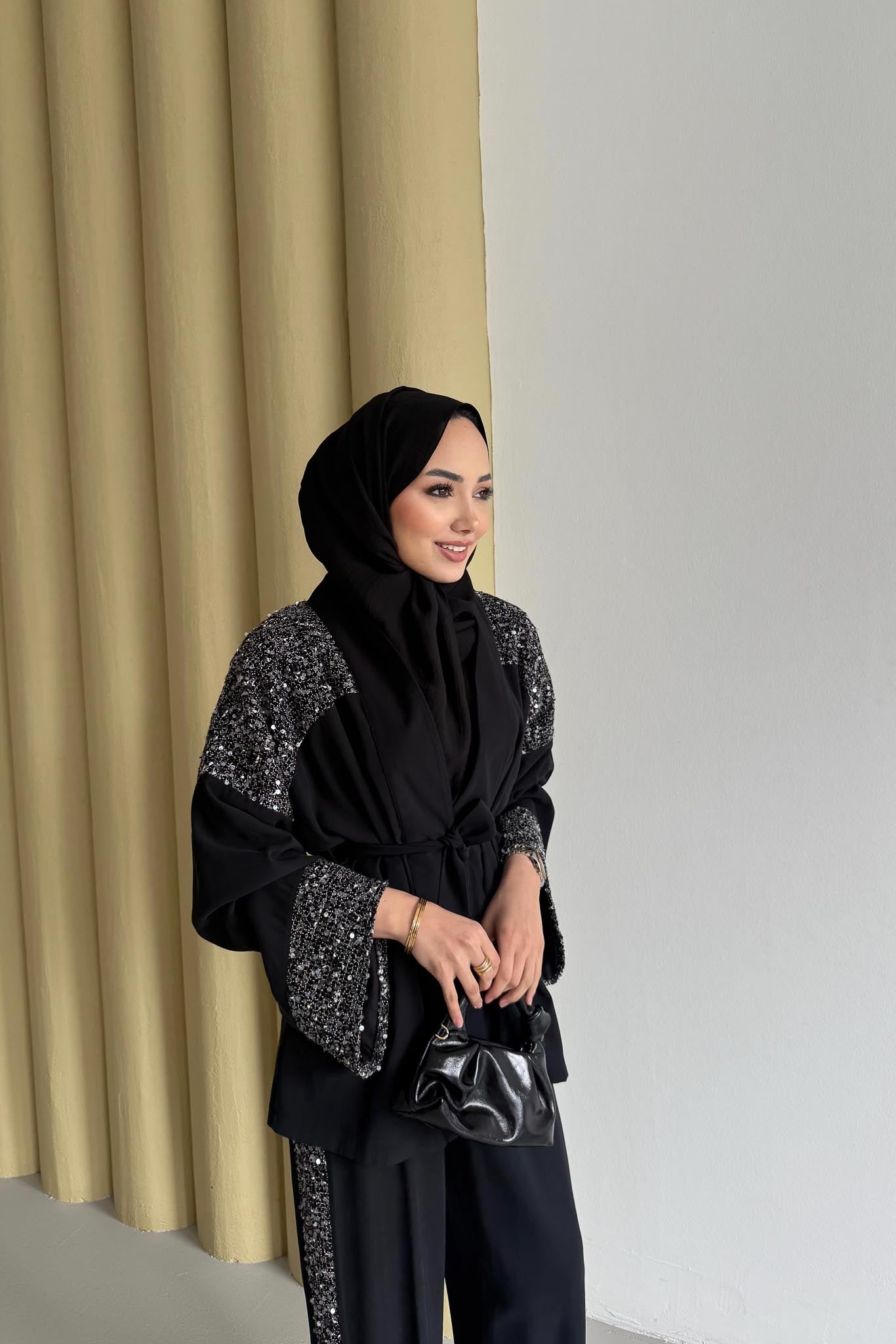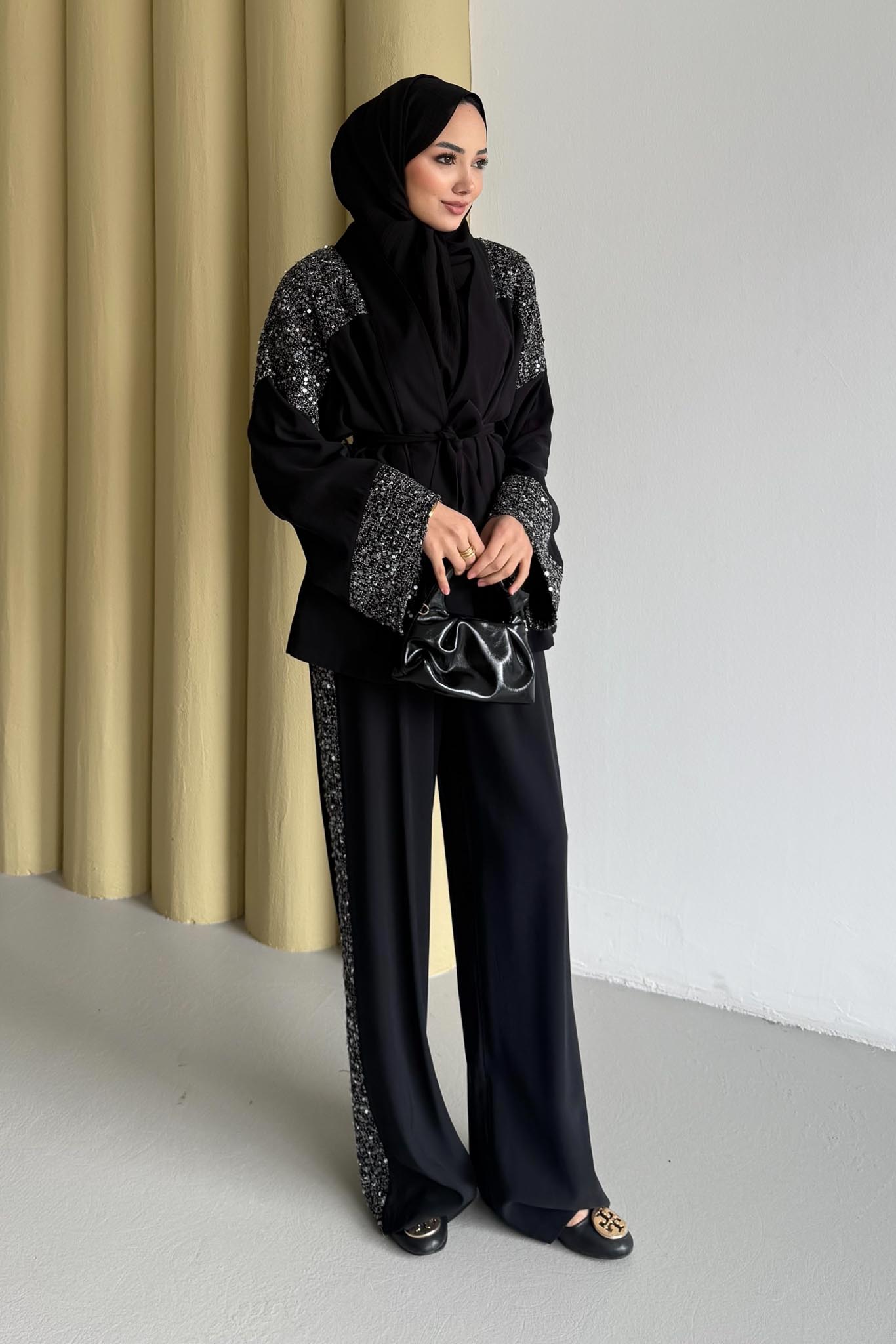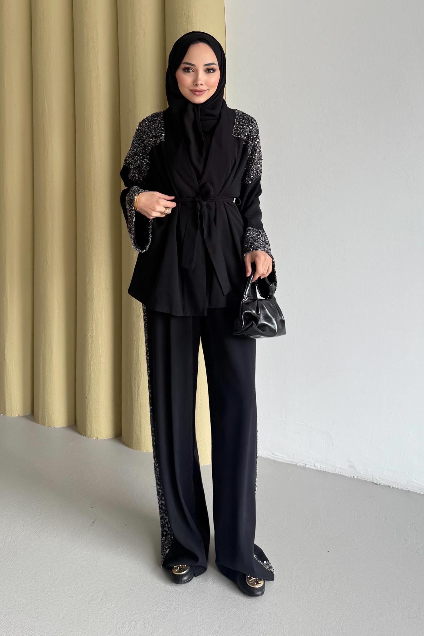 Tunik omuzları ve Kol ucu Payet dokumadır, ortalama 70 cm, seyyar kuşaklıdır. Pantolon Palazzo formdadır, oldukça rahattır, Beli lastiklidir.