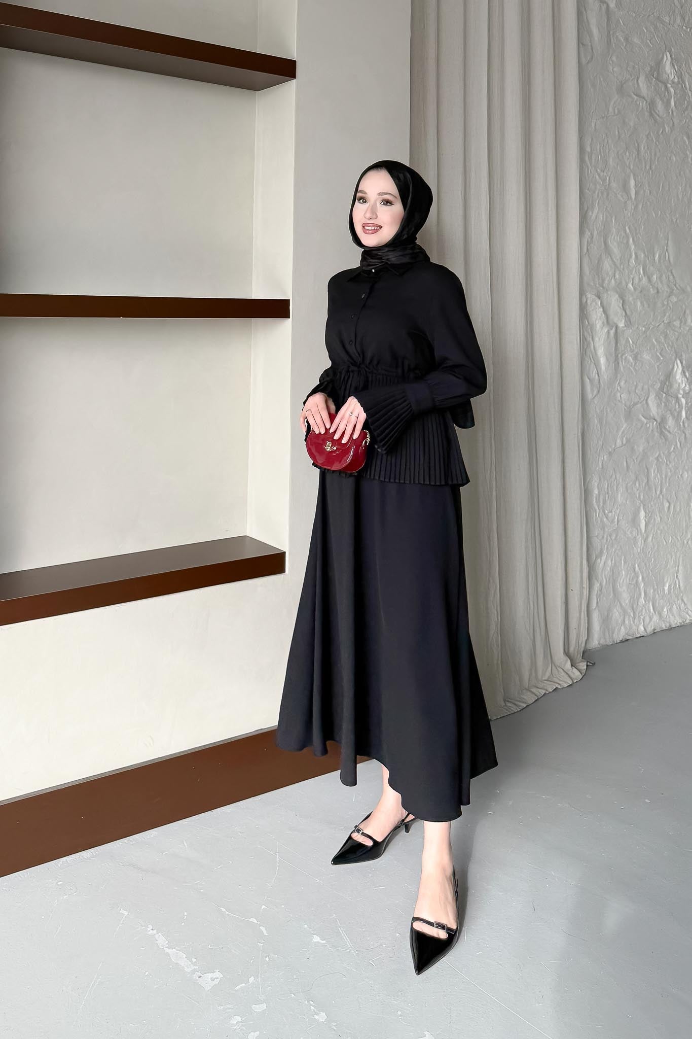 Pile Detaylı Etek Takım Siyah