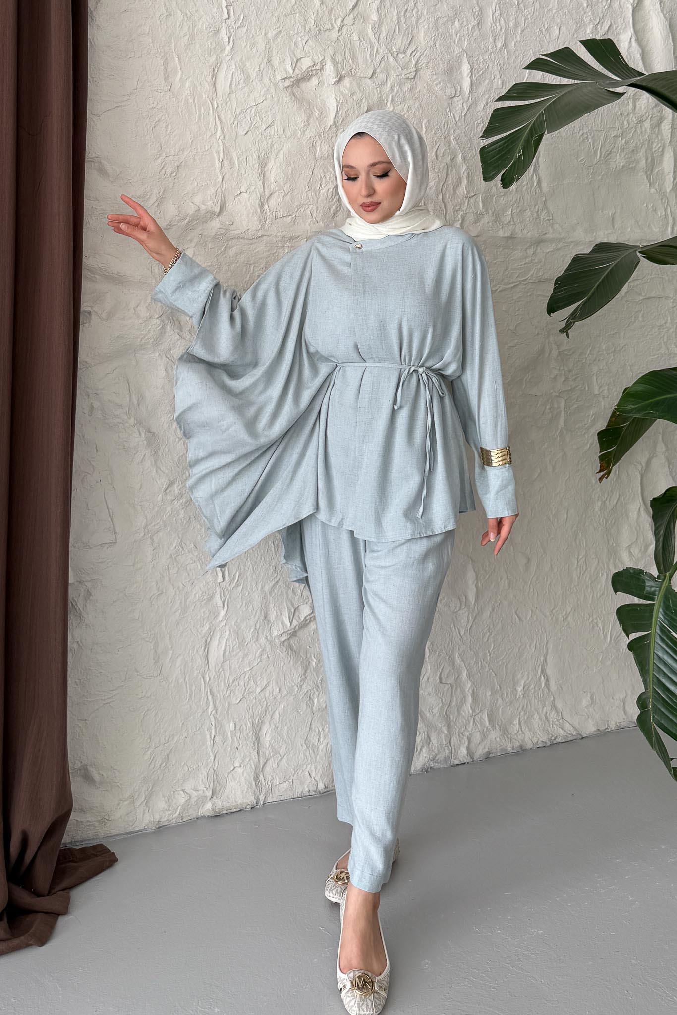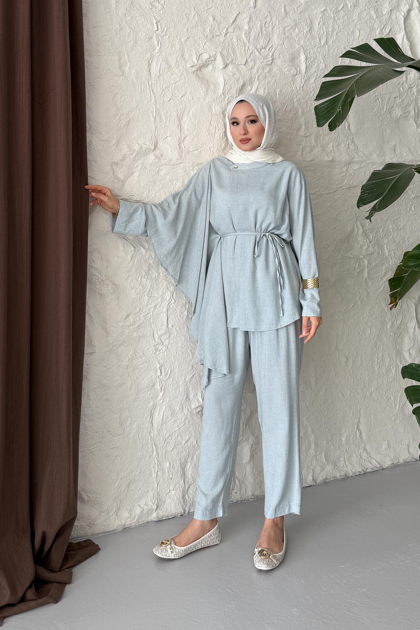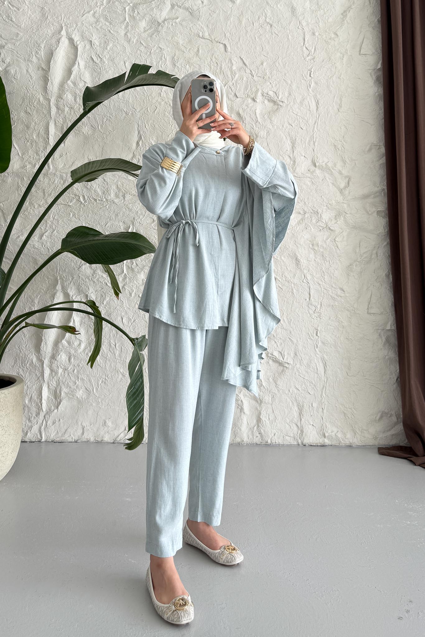 Tunik Yakası Broş Düğmelidir ortalama 70 cm dir, seyyar kuşaklıdır, Pantolon Beli Lastikli Havuç Formdadır.