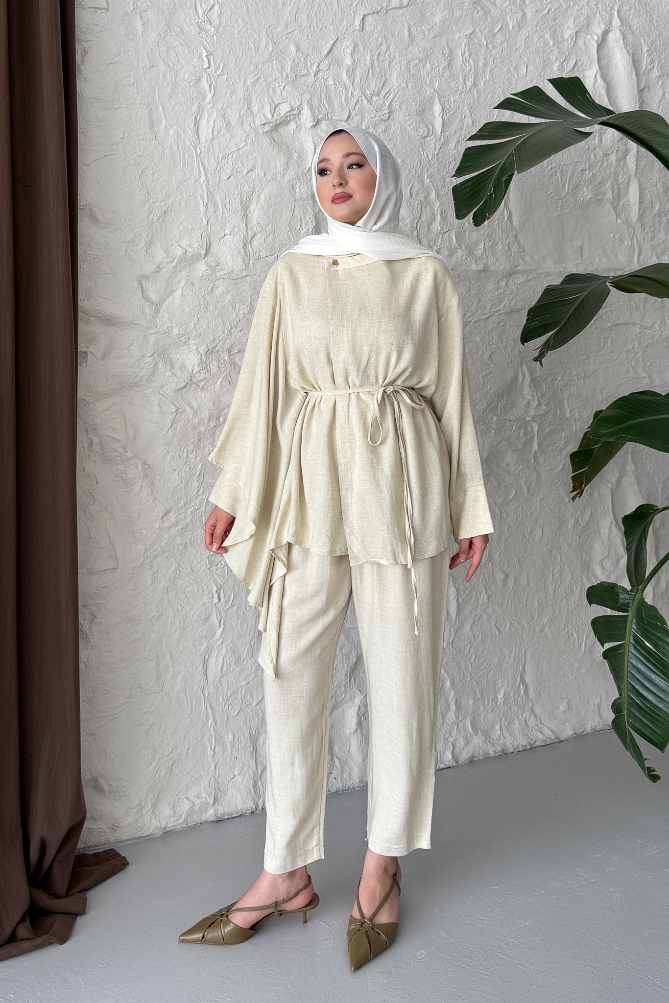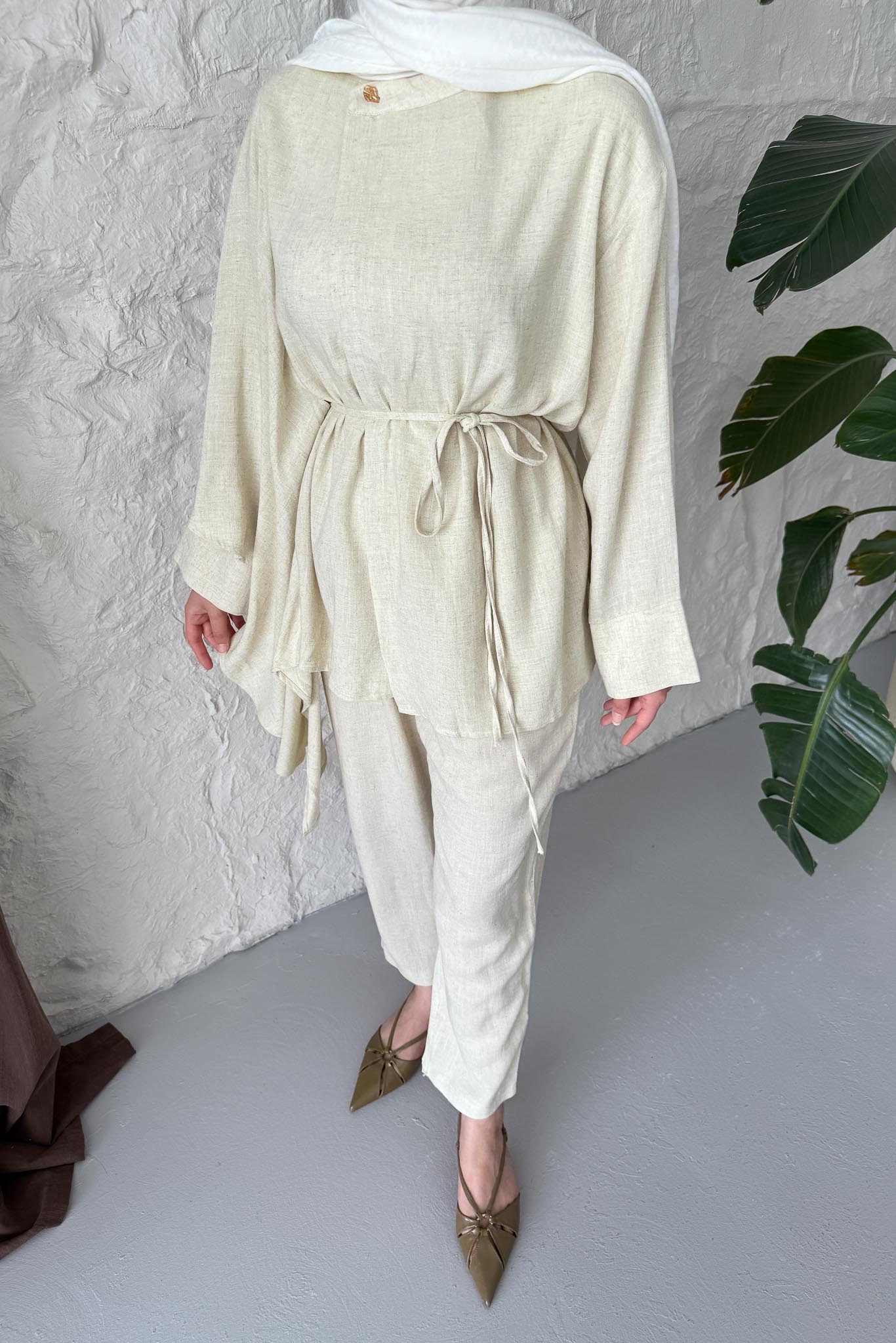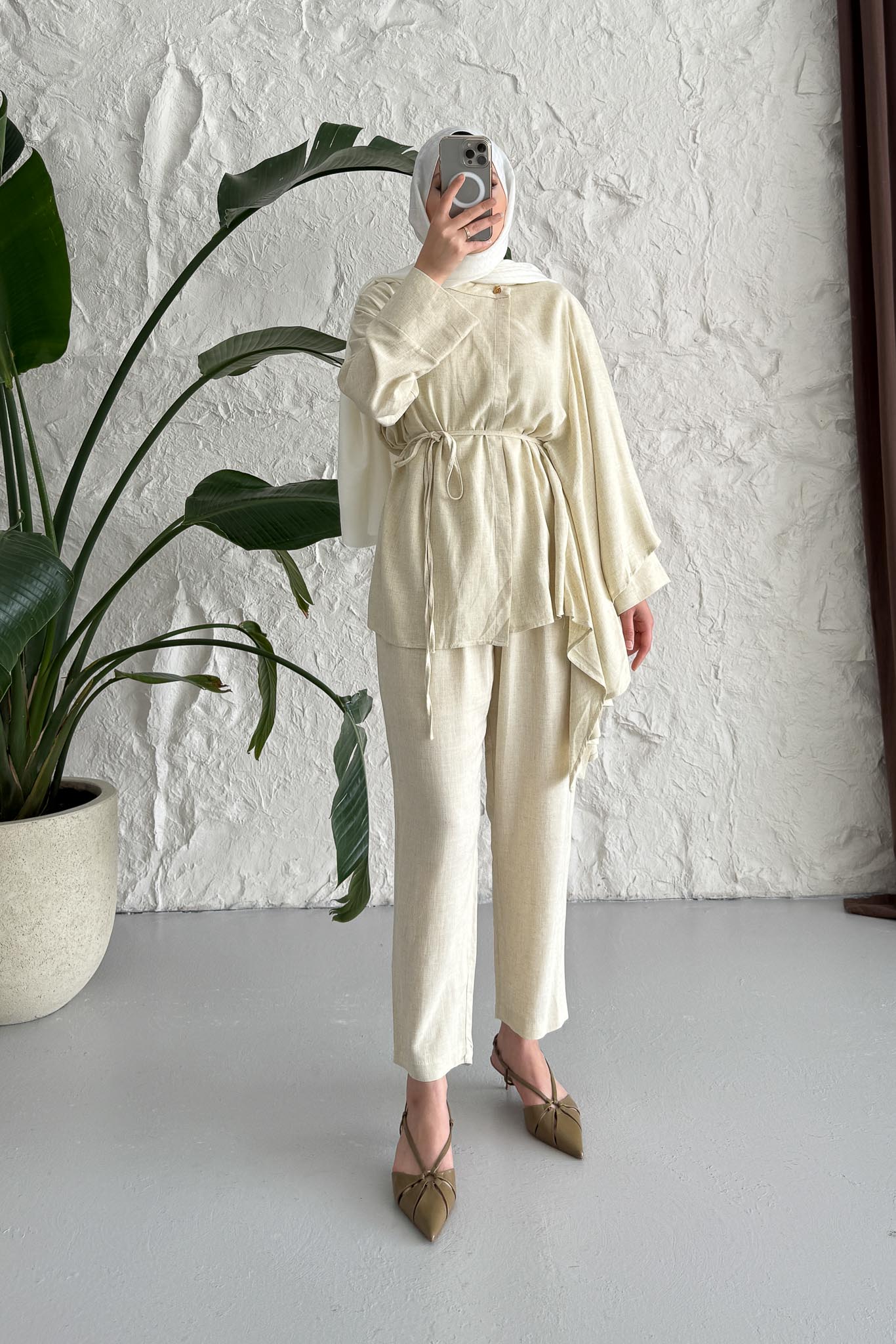 Tunik Yakası Broş Düğmelidir ortalama 70 cm dir, seyyar kuşaklıdır, Pantolon Beli Lastikli Havuç Formdadır.