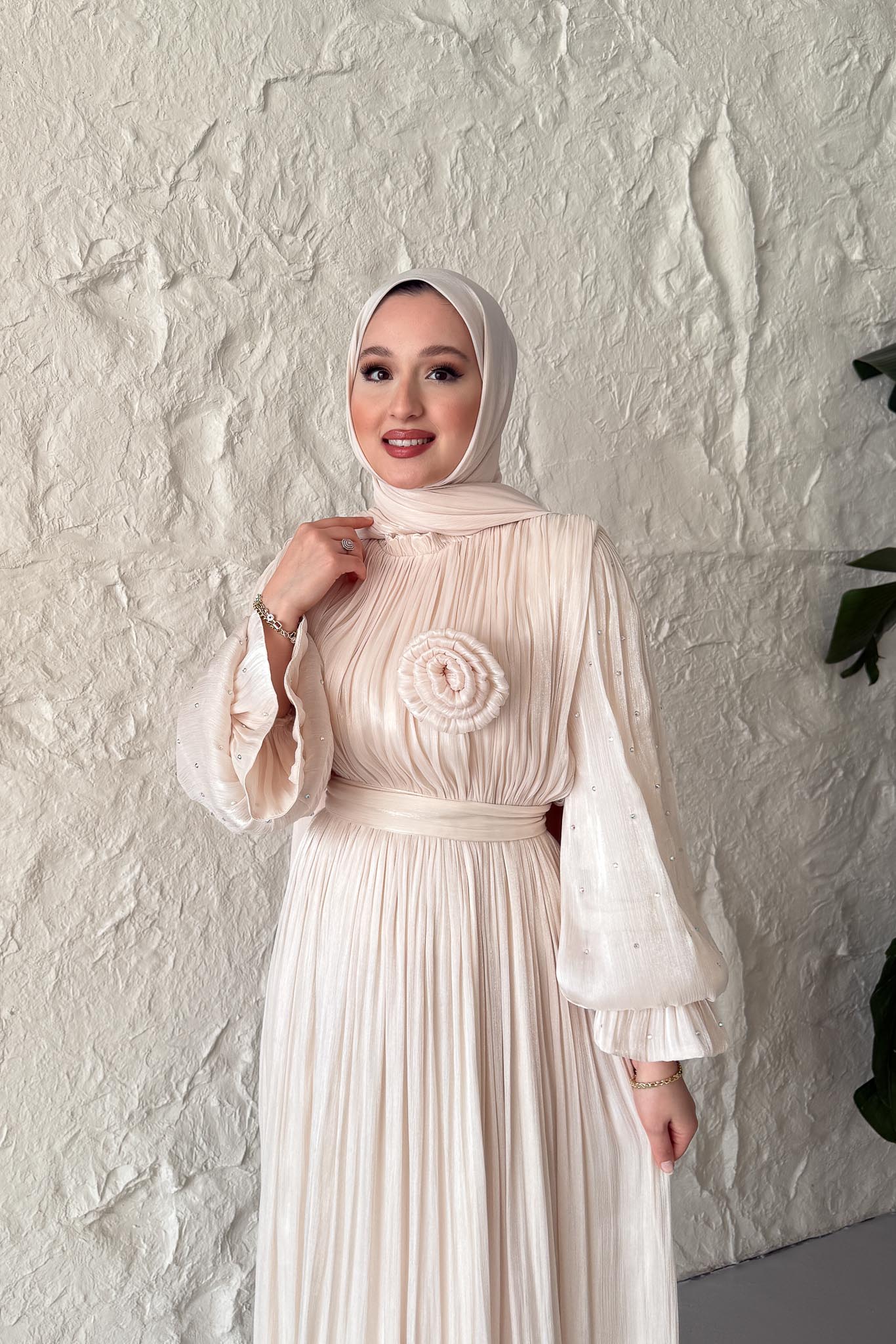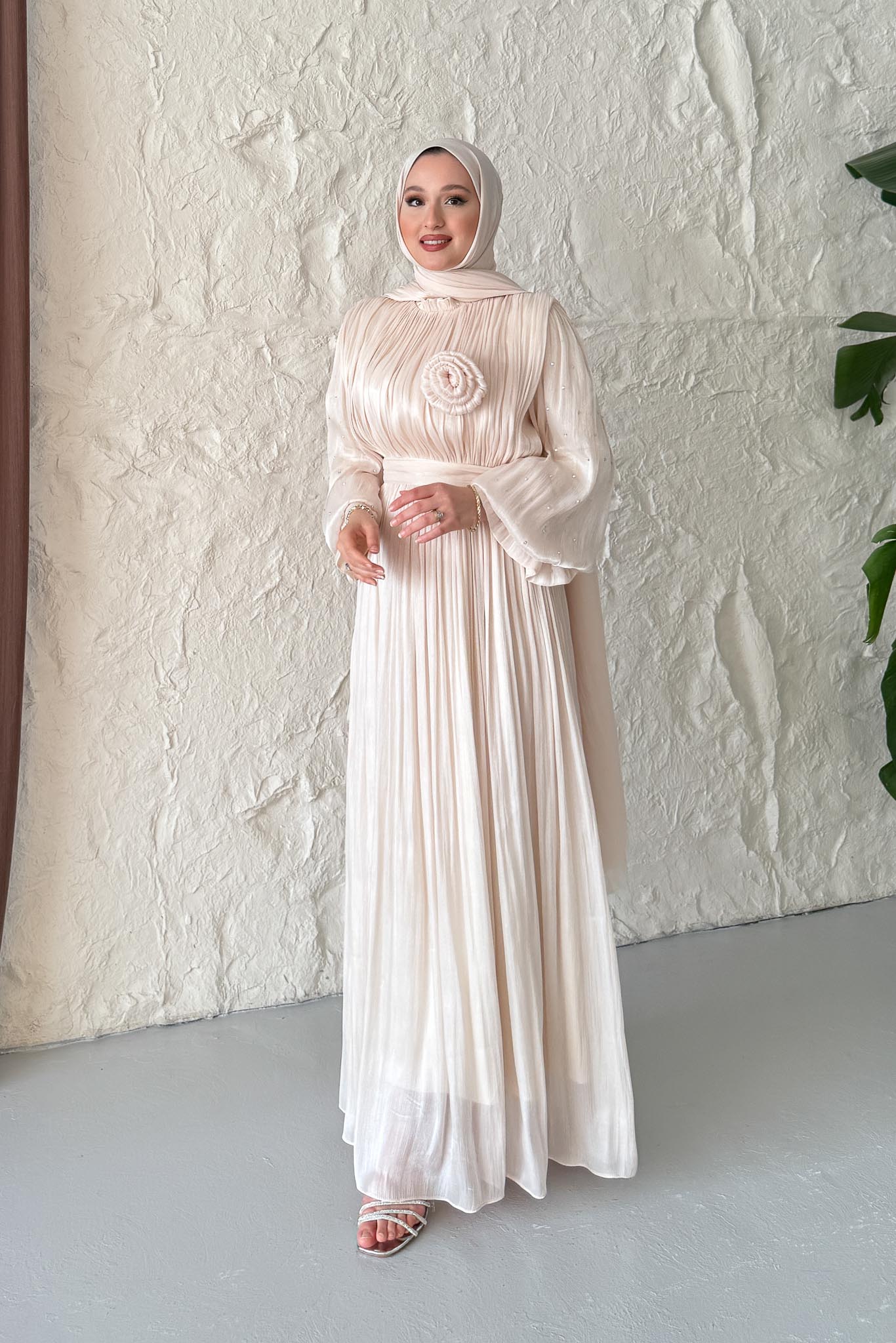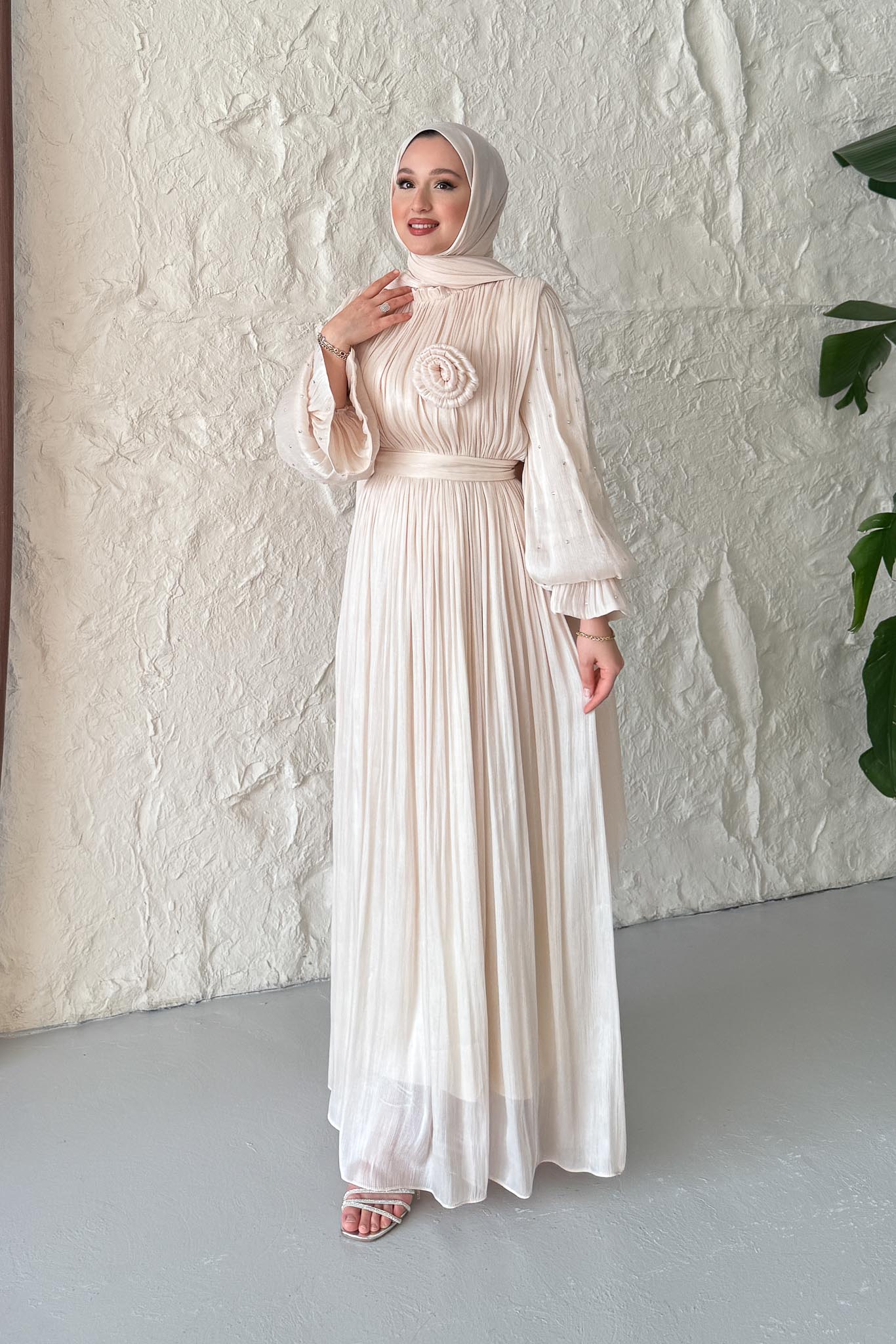 İç göstermez Vual Astarlıdır ve Ortalama 140 cm dir, Seyyar Kuşaklıdır, Gül motifi seyyar olarak ekstra kullanabilirsiniz, arkadan fermuarlı olarak kolayca giyinebilirsiniz, Kol detaylarında inci görünümlü taş motifleri vardır zarif bir görüntü sunar.
