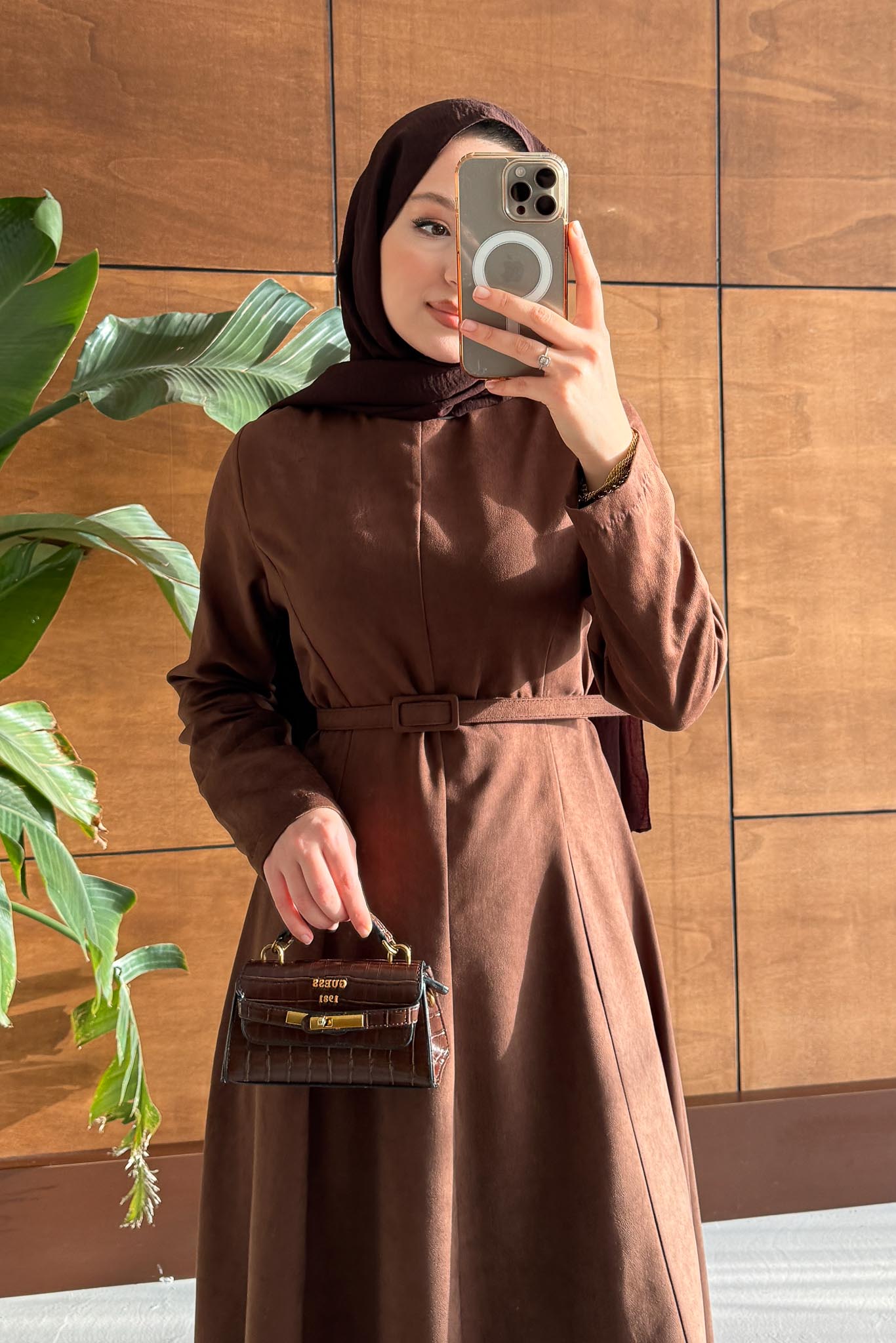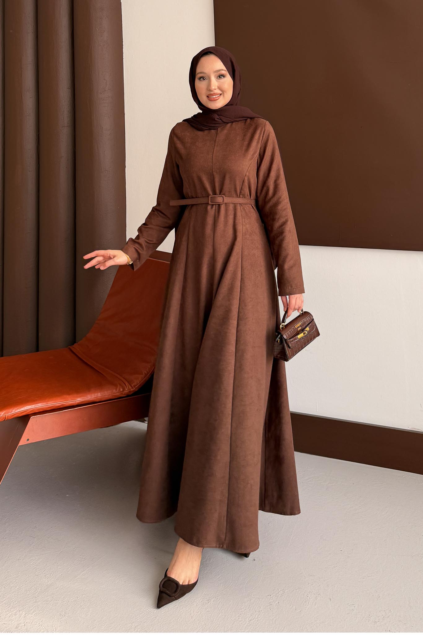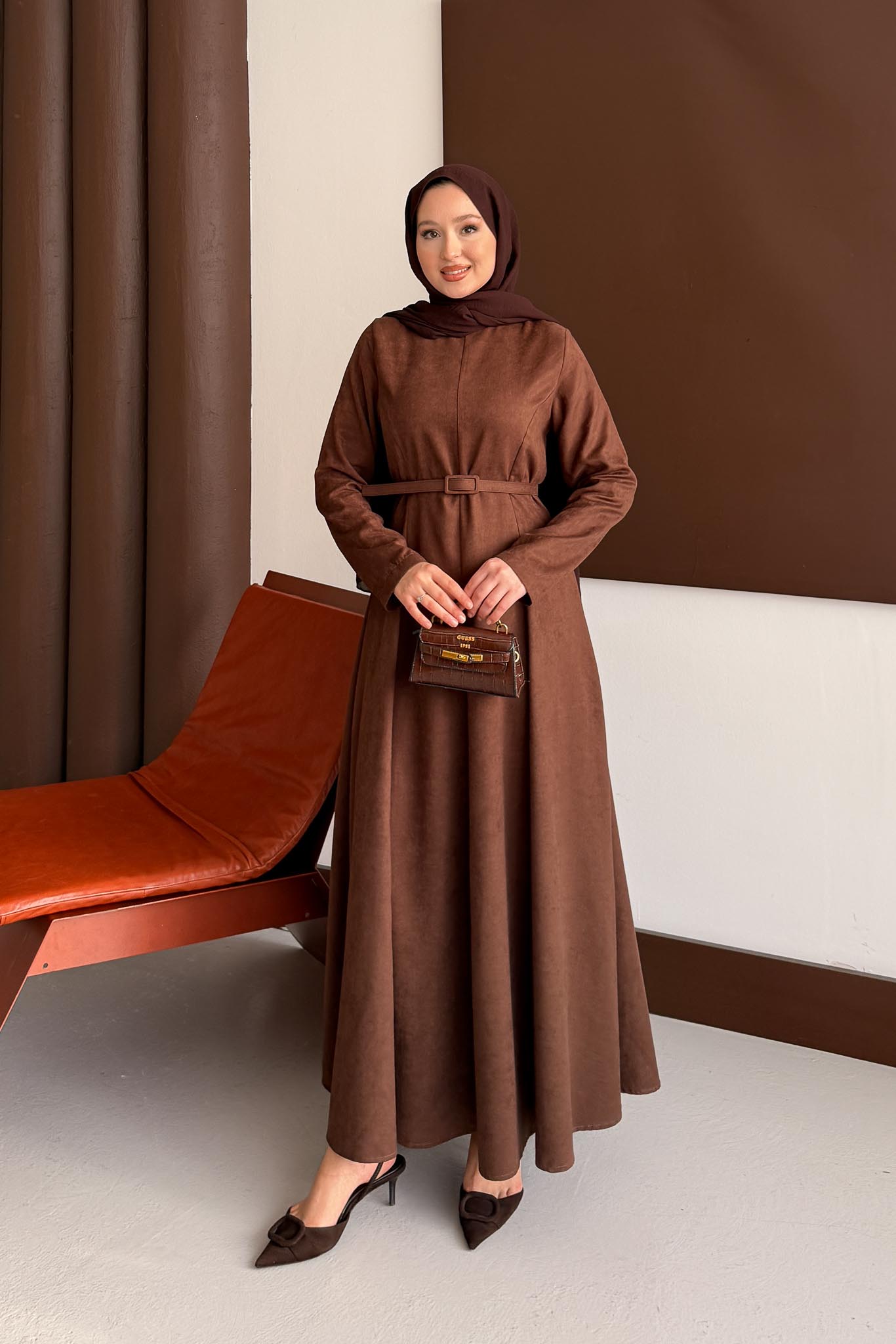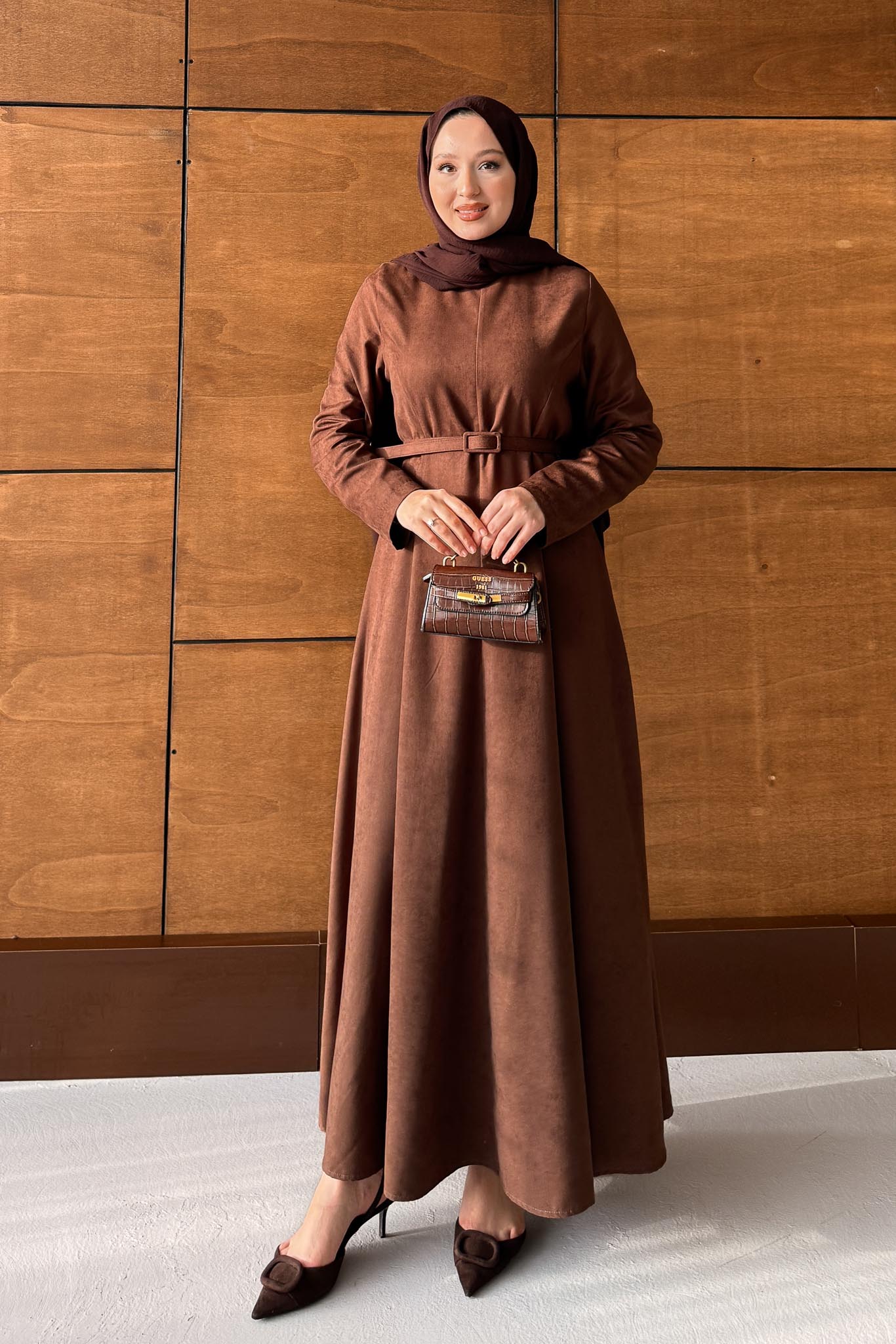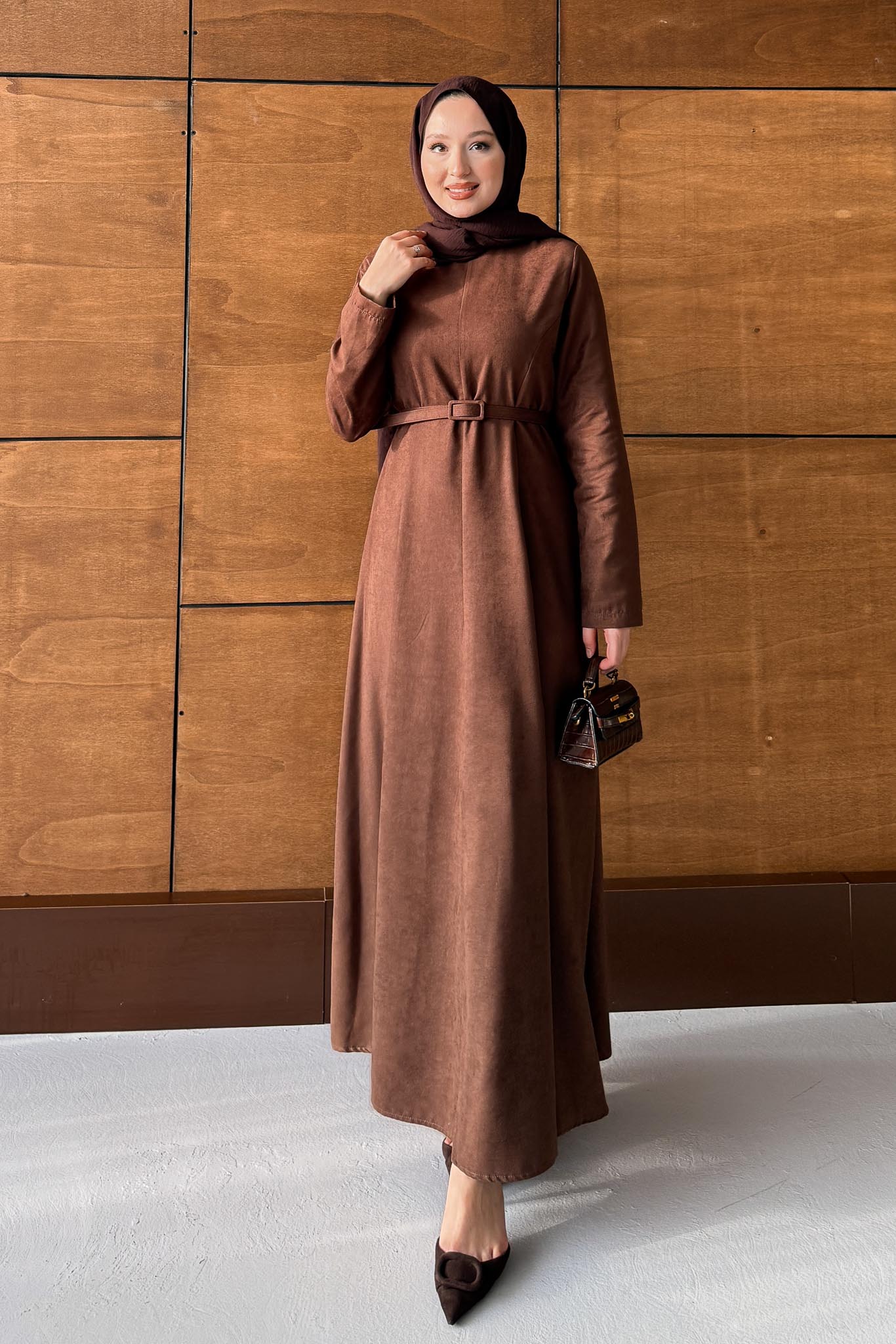 Süet Kemerli Elbise Kahverengi