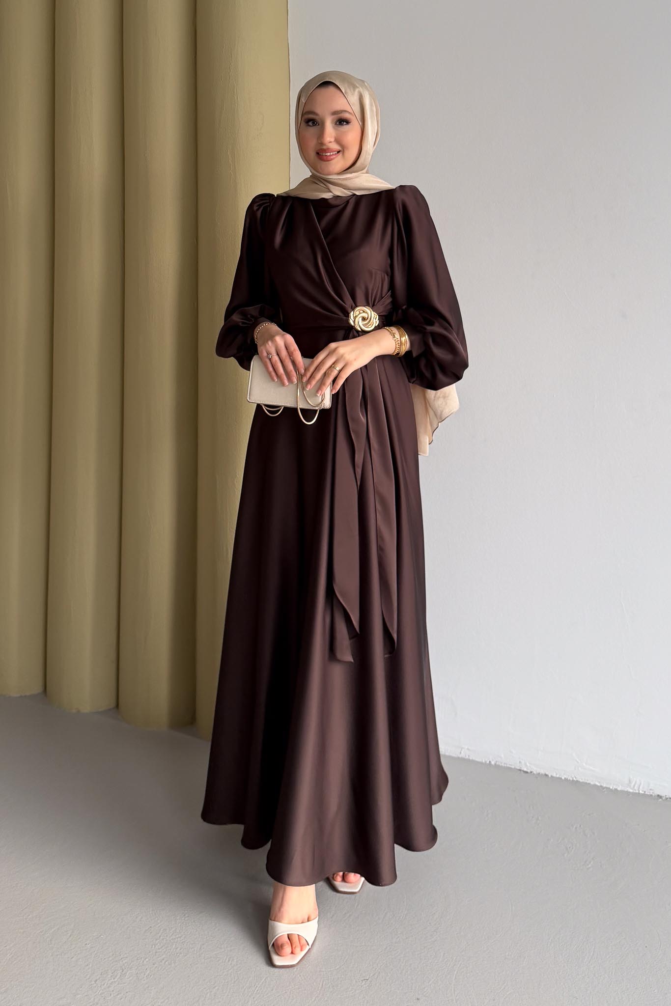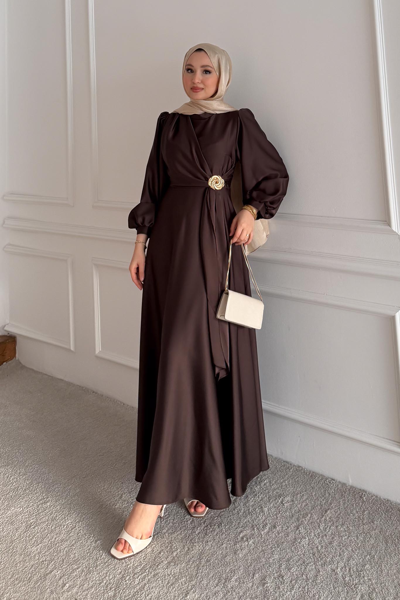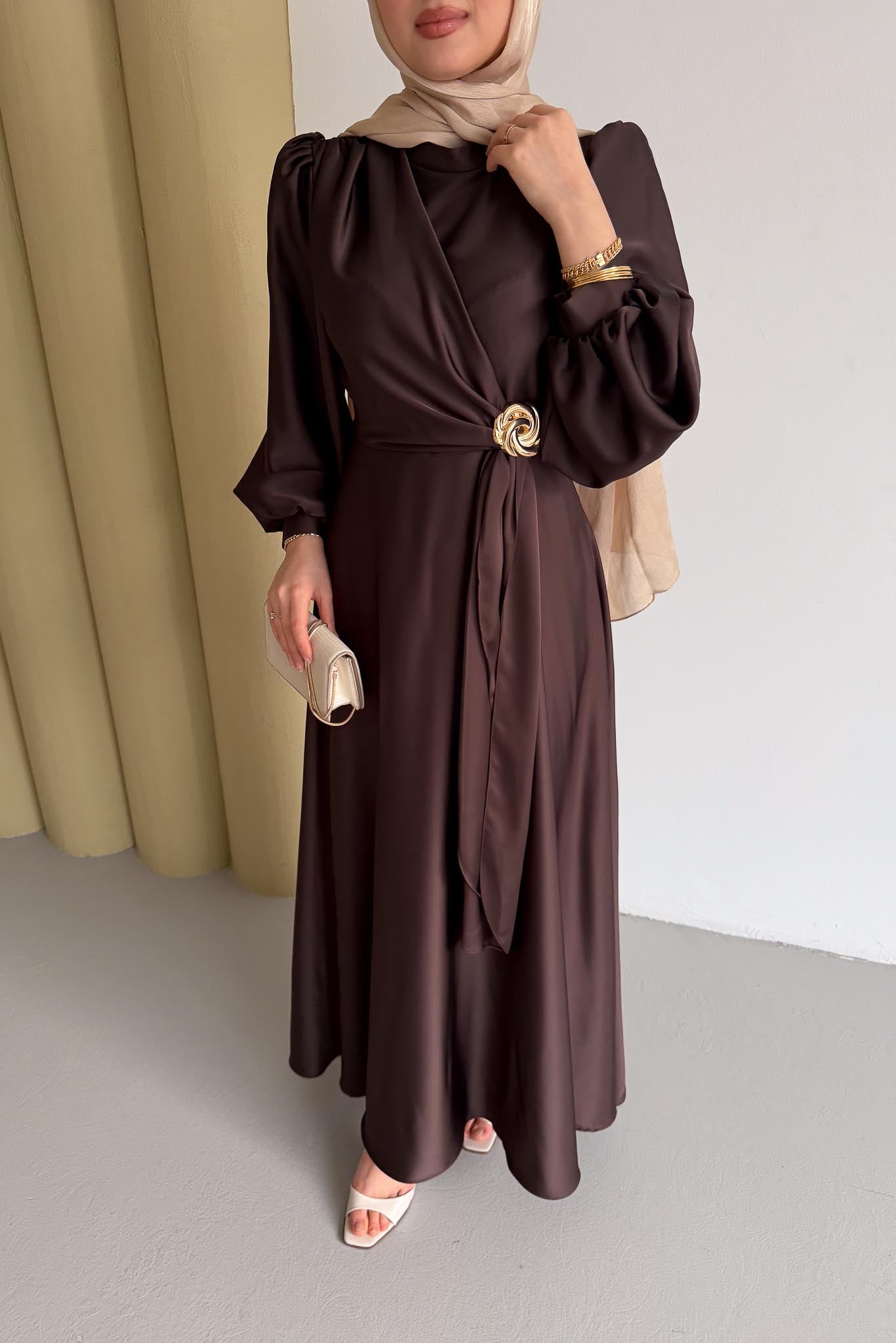 Şura Broş Saten Abiye Acı Kahverengi