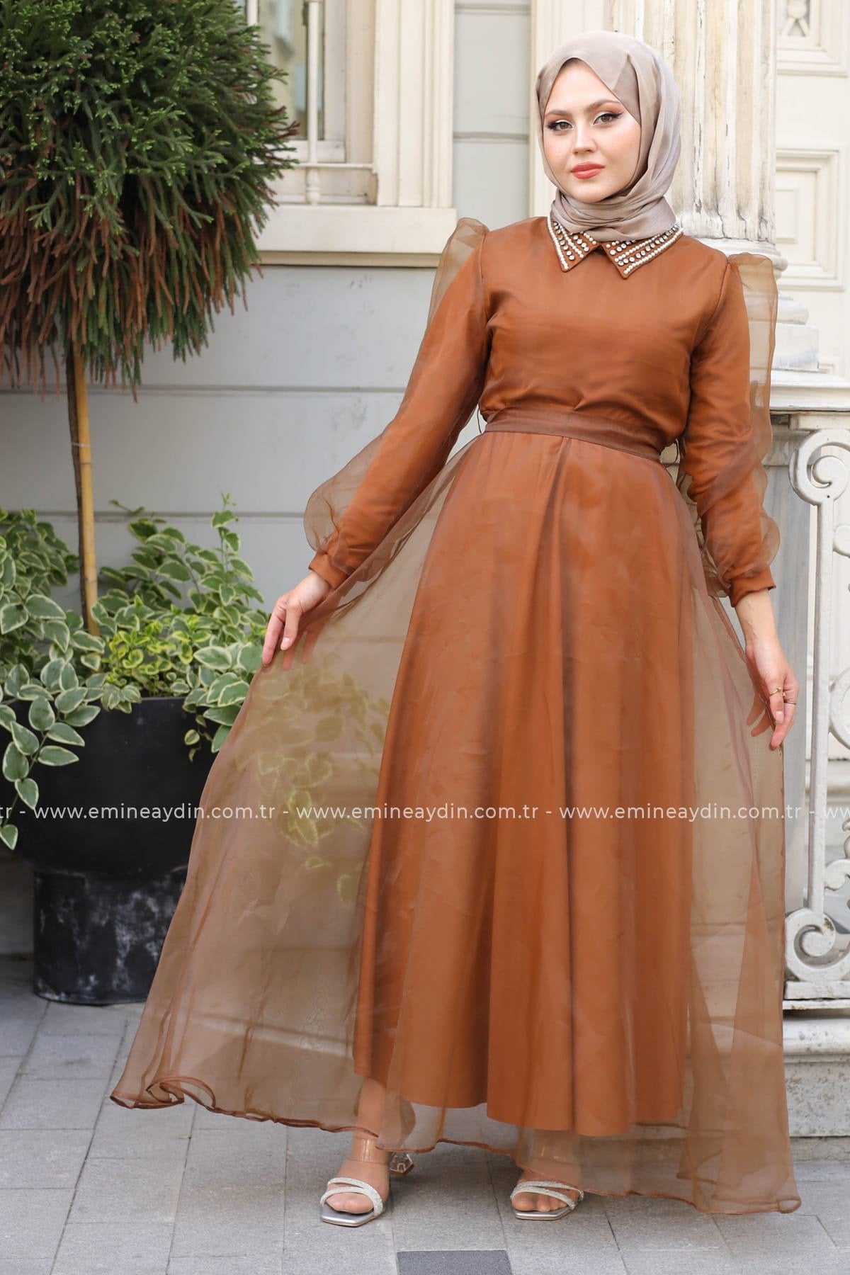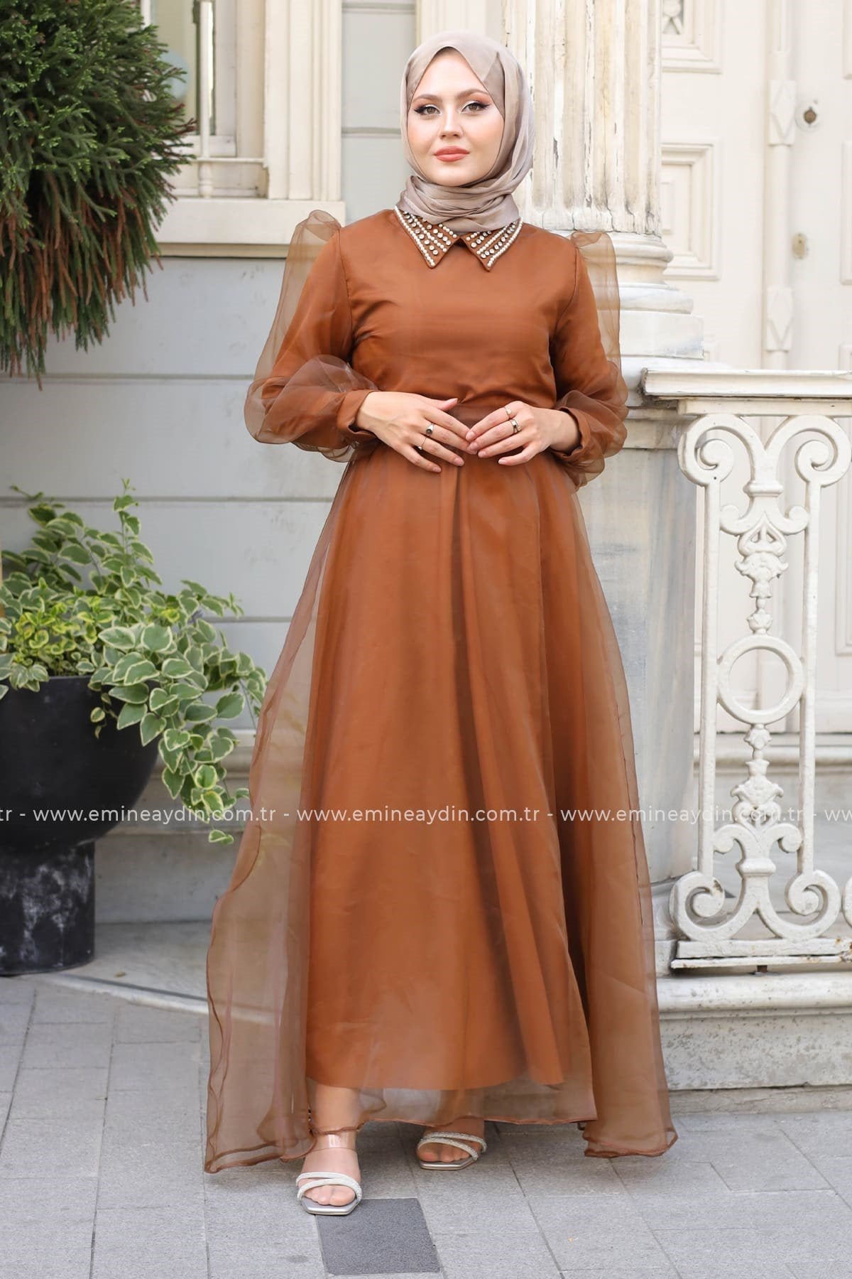 Taşlı Organze Elbise Bakır