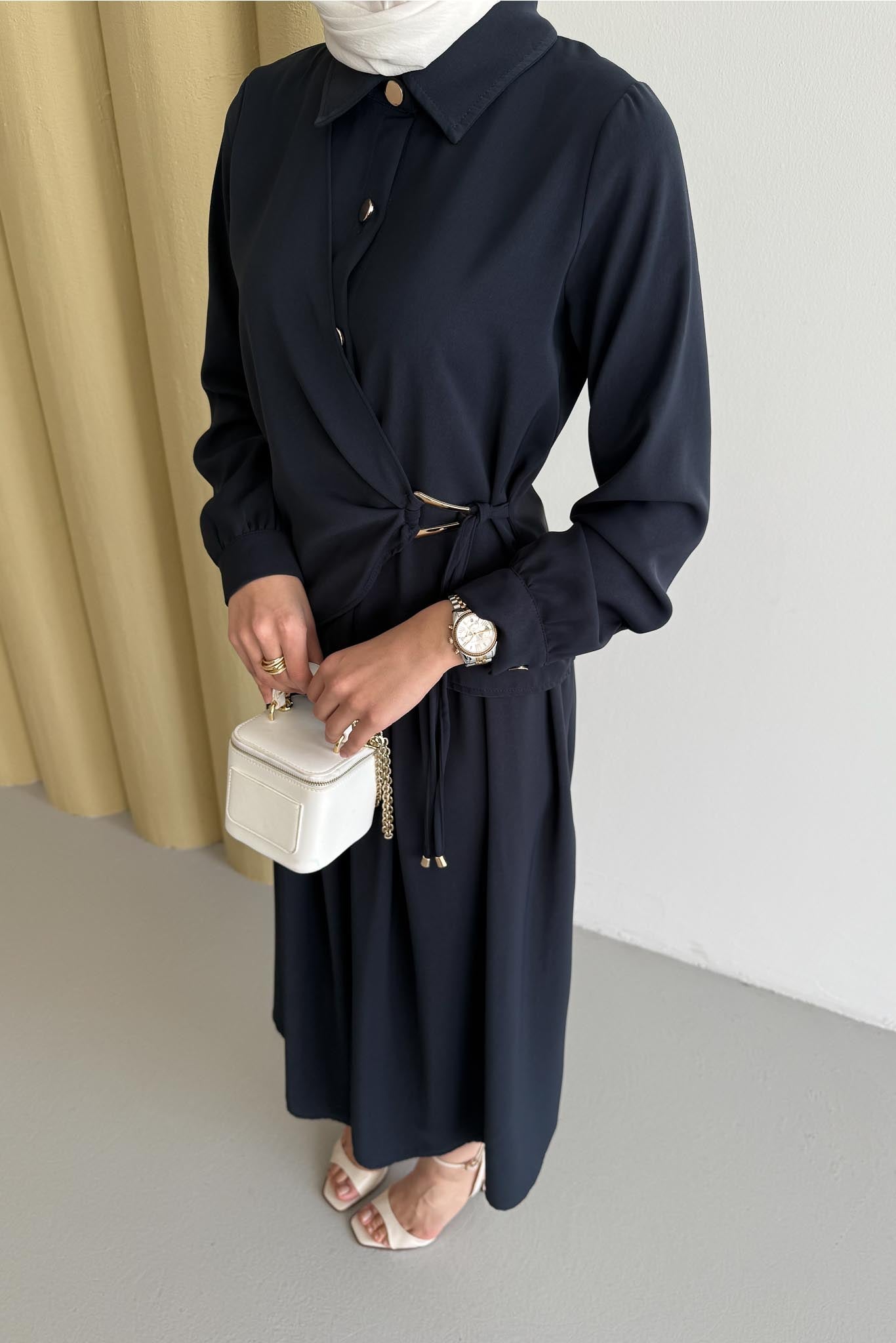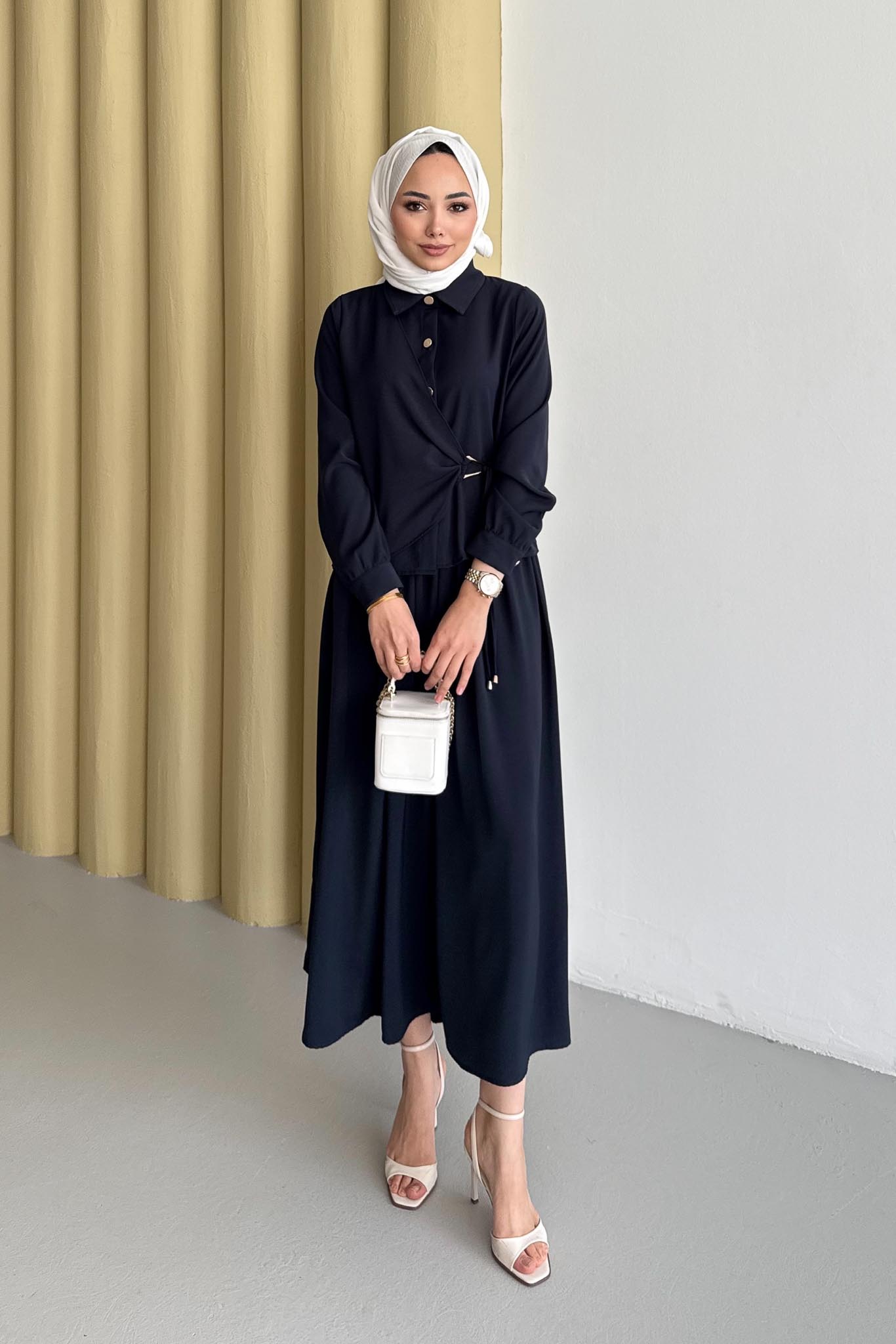 Tunik Toka detaylıdır, şık duruşludur, Etek Kloş formdadır, ön kısmı tasarım piliselidir. Beli arka kısmı lastiklidir.
