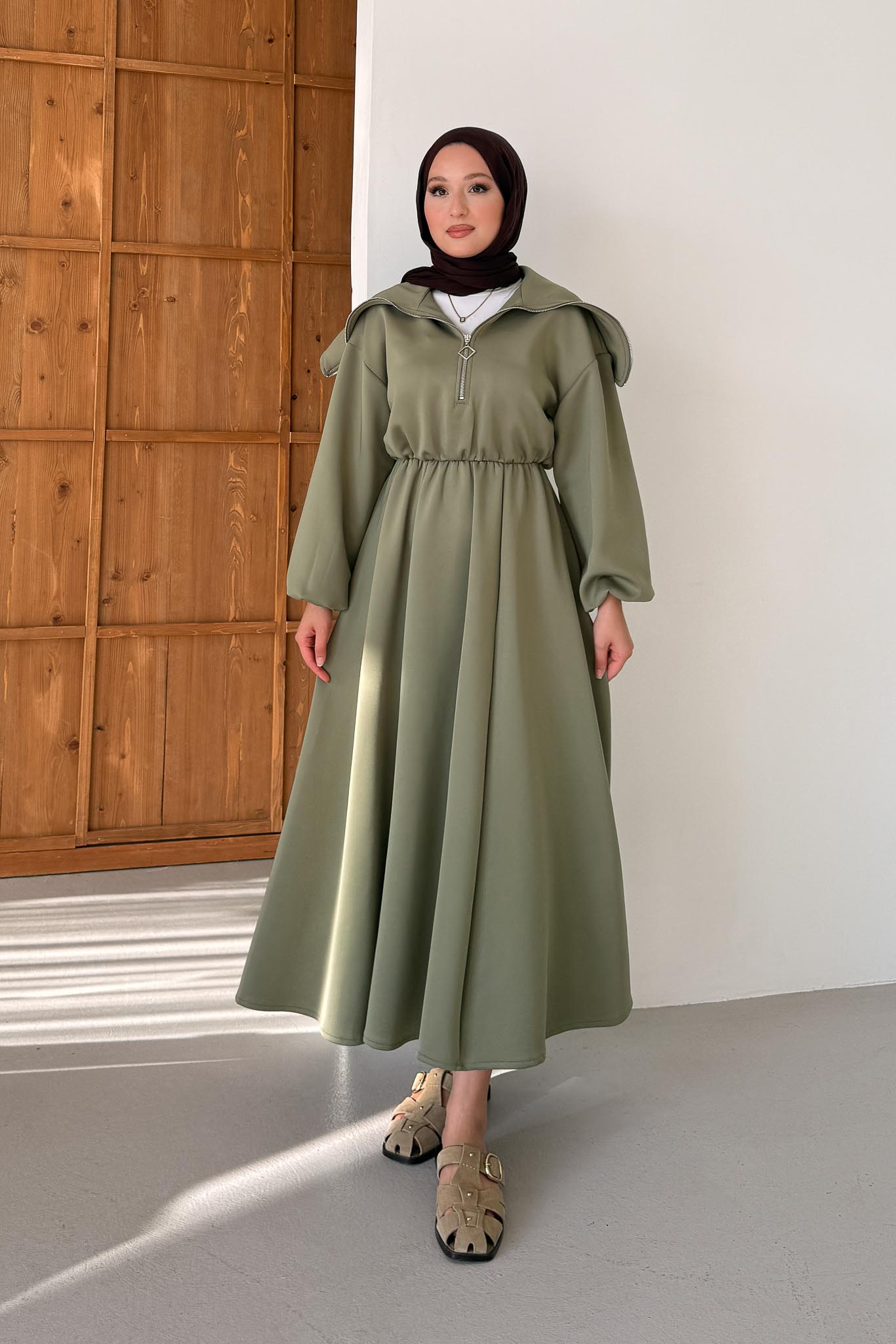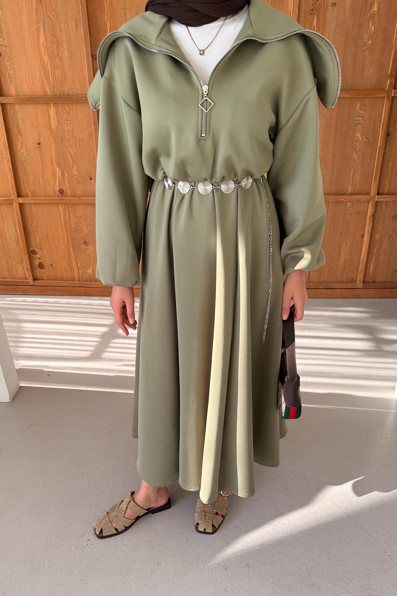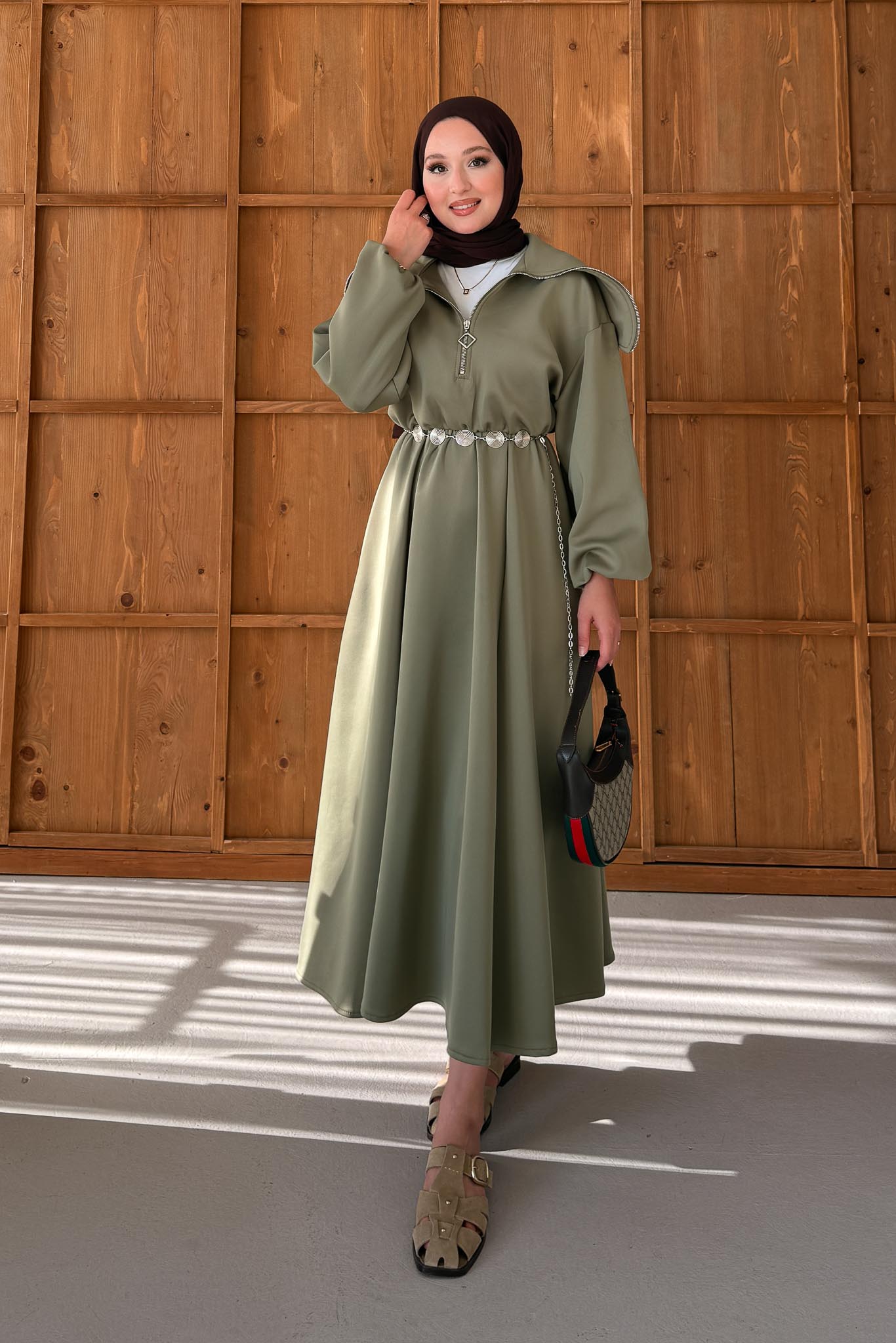 Yakası Fermuarlıdır, Seyyar Motifli Zincir vardır, Hafif Balon Kolludur, Beli Lastiklidir, Rahat bir elbisedir, Ortalama 133 cm dir.