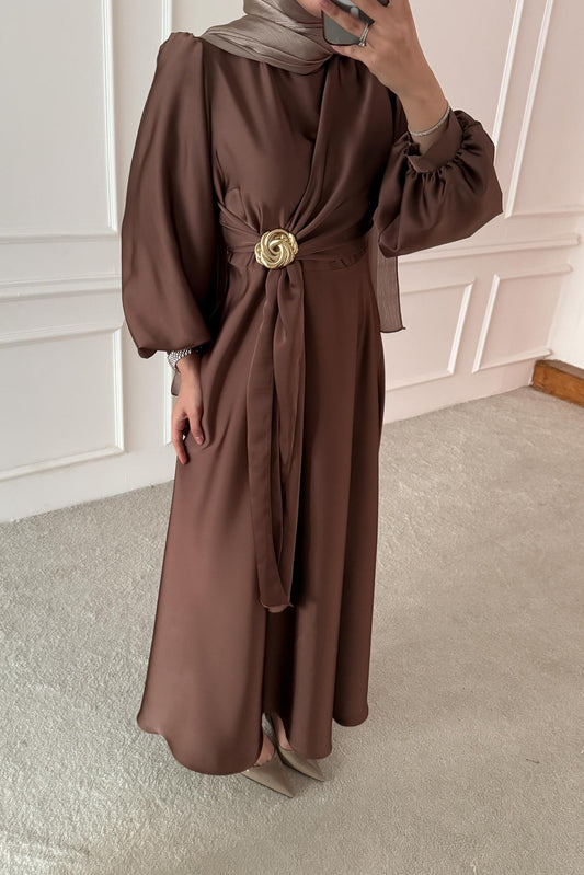 Şura Broş Saten Abiye Kahverengi